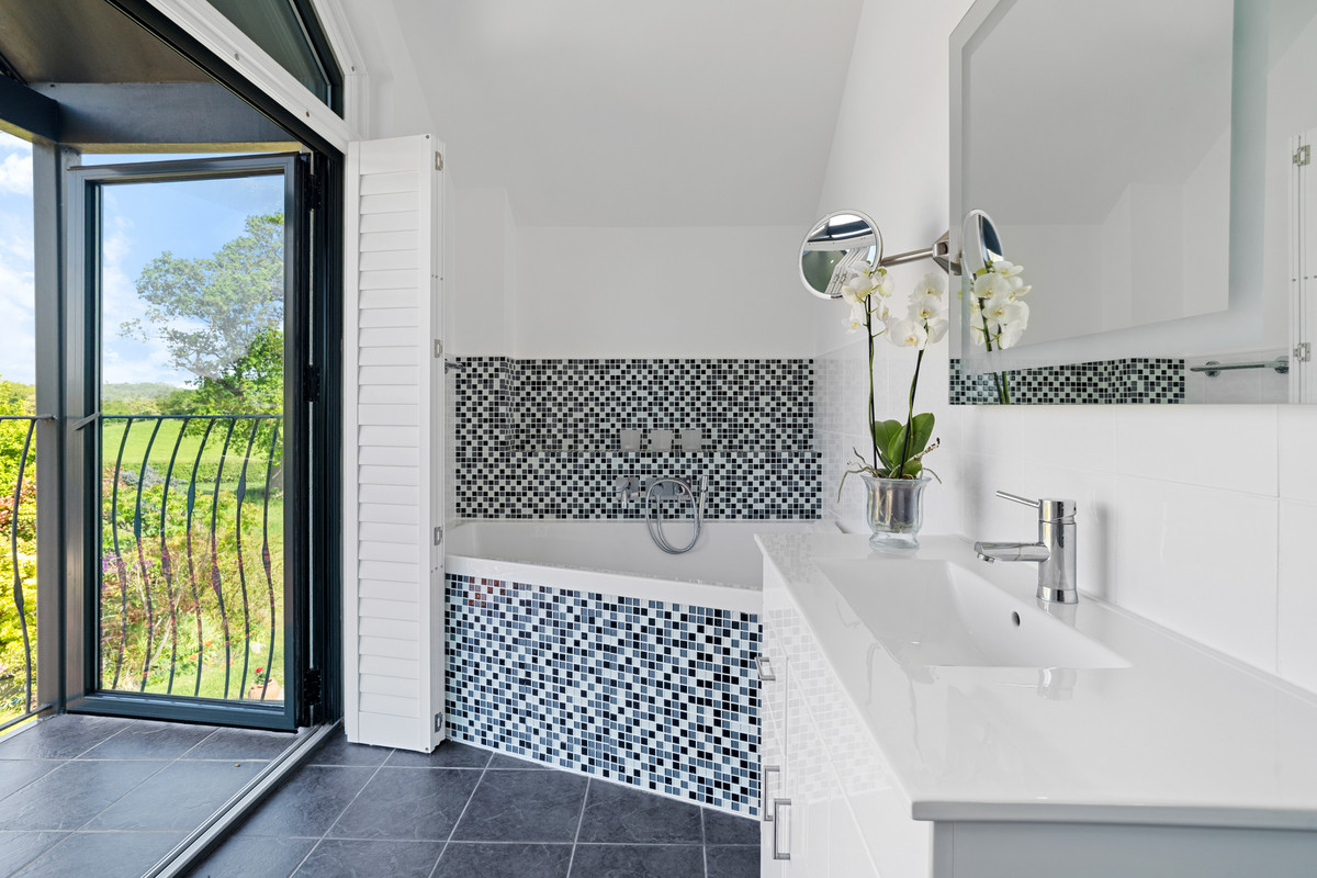 The ensuite bathroom features a fully tiled floor, glazed walk-in shower, elegant white porcelain suite, and a corner double bath with mosaic tiling perfectly positioned to enjoy views through French doors that open to a private south-facing balcony with plantation shutters and iron balustrade. A chrome heated towel rail, illuminated shaving mirror, and integrated storage complete this refined space.