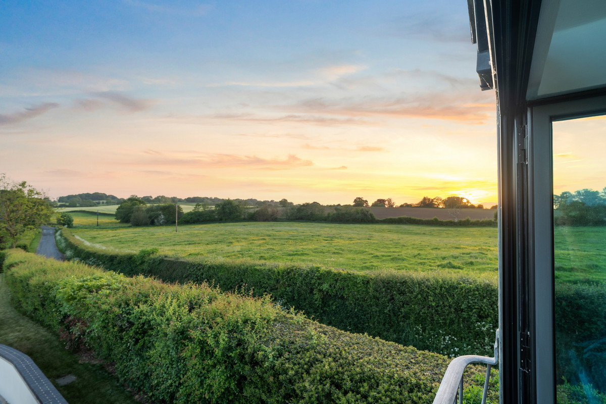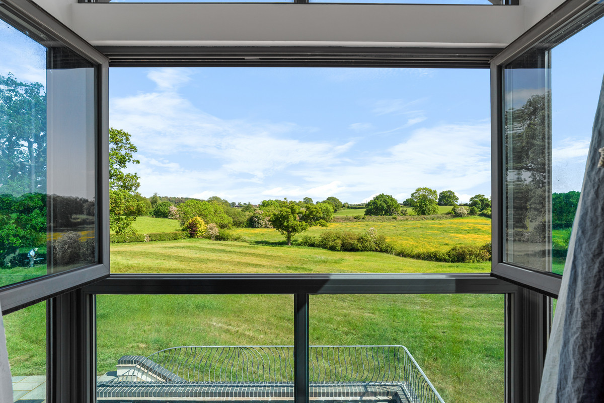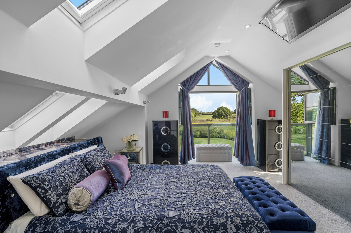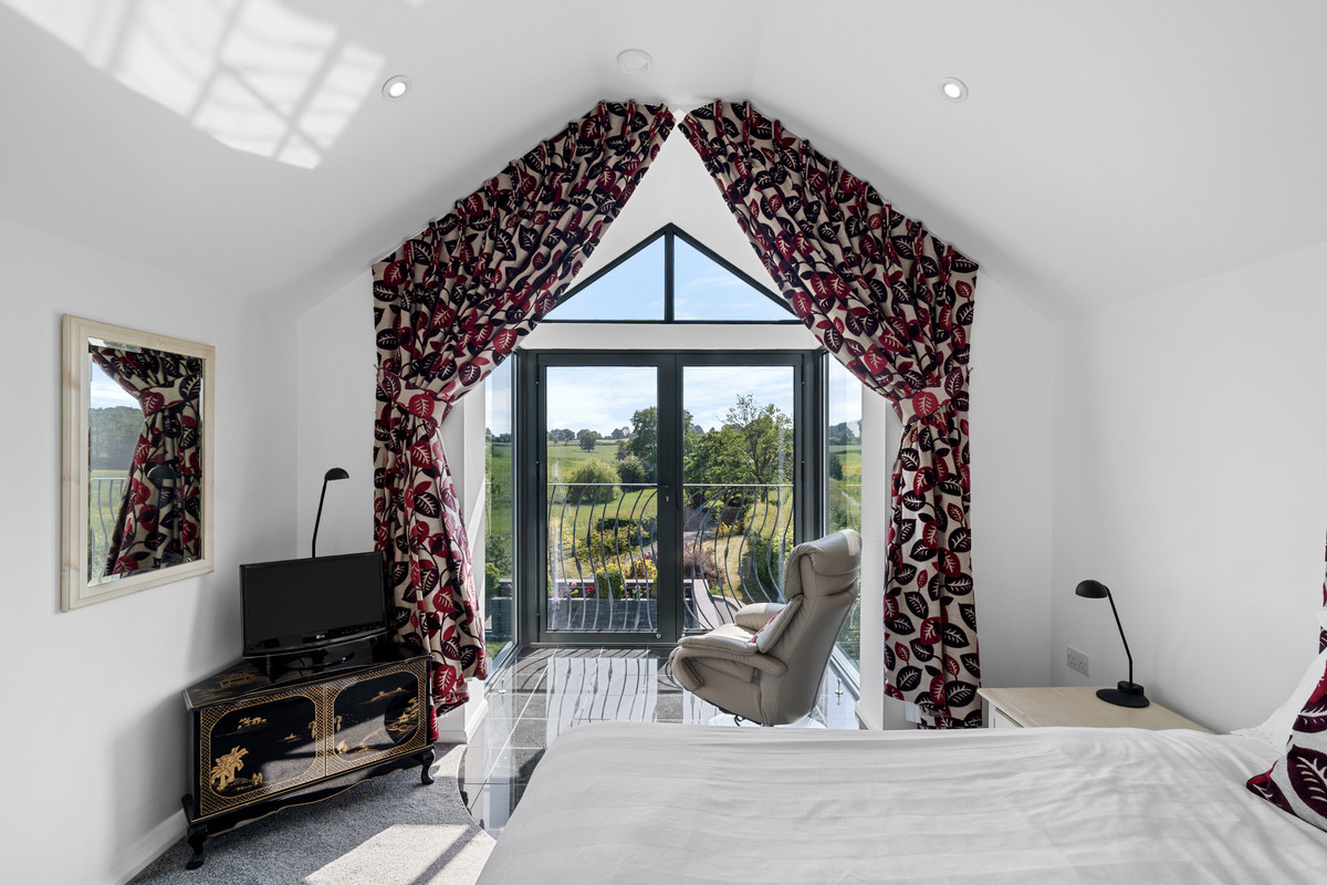 An East facing retreat with panoramic views over the landscaped gardens, wildflower meadow, and open fields beyond. The space features a vaulted ceiling, Velux windows with fitted blinds, and an integral glazed balcony with twin opening windows, drawing in soft afternoon light and incredible views over the grounds and paddocks to the fields beyond.
