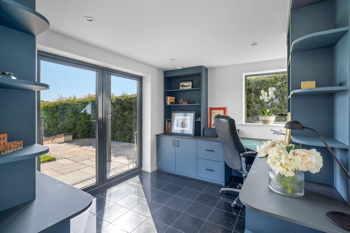 Perfect for modern working, the study features bespoke fitted shelving, cabinetry, and desk. French aluminium doors open onto the entrance patio, while black granite tiled flooring and discreet downlighting offer a refined, professional finish.