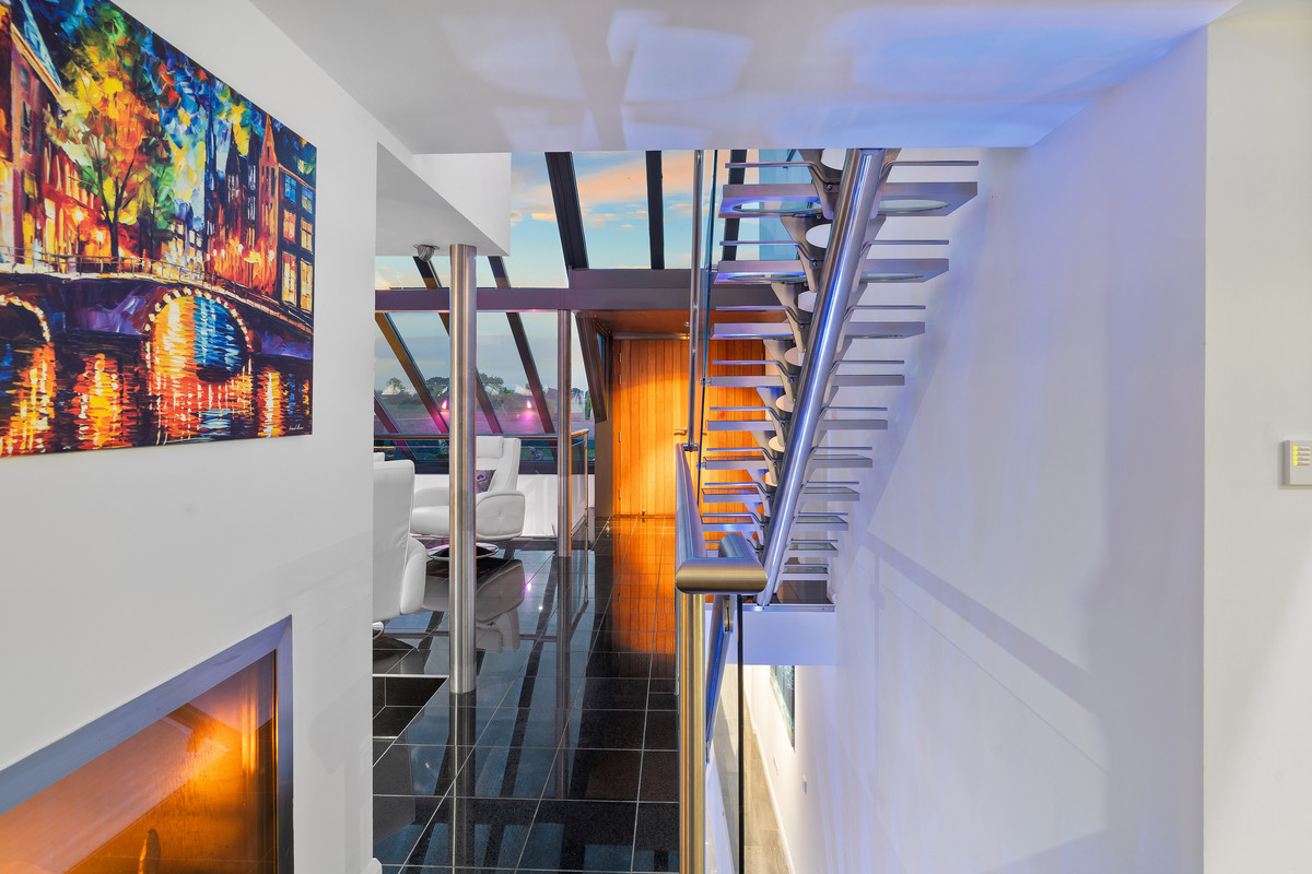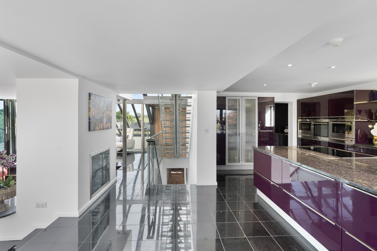 A sculptural glass and stainless steel staircase, descending from the kitchen continues the home’s modern architectural statement, blending luxury, light, and leisure.