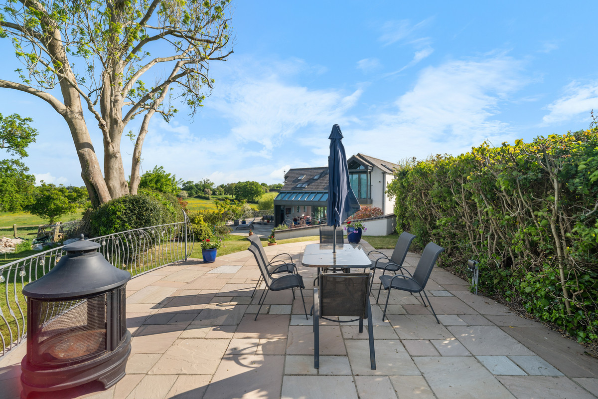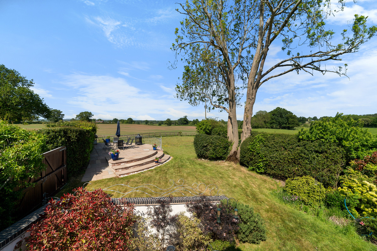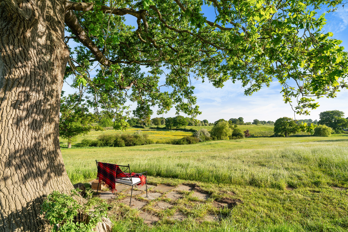 A raised BBQ and entertaining terrace provide elevated views across the Cheshire and Shropshire borders, expansive lawns, and paddocks, all framed by mature planting and the namesake oak trees that punctuate the grounds with timeless beauty. The surrounding vistas are rich with rural charm, where grazing horses, cattle, and sheep dot the gently undulating Cheshire landscape.