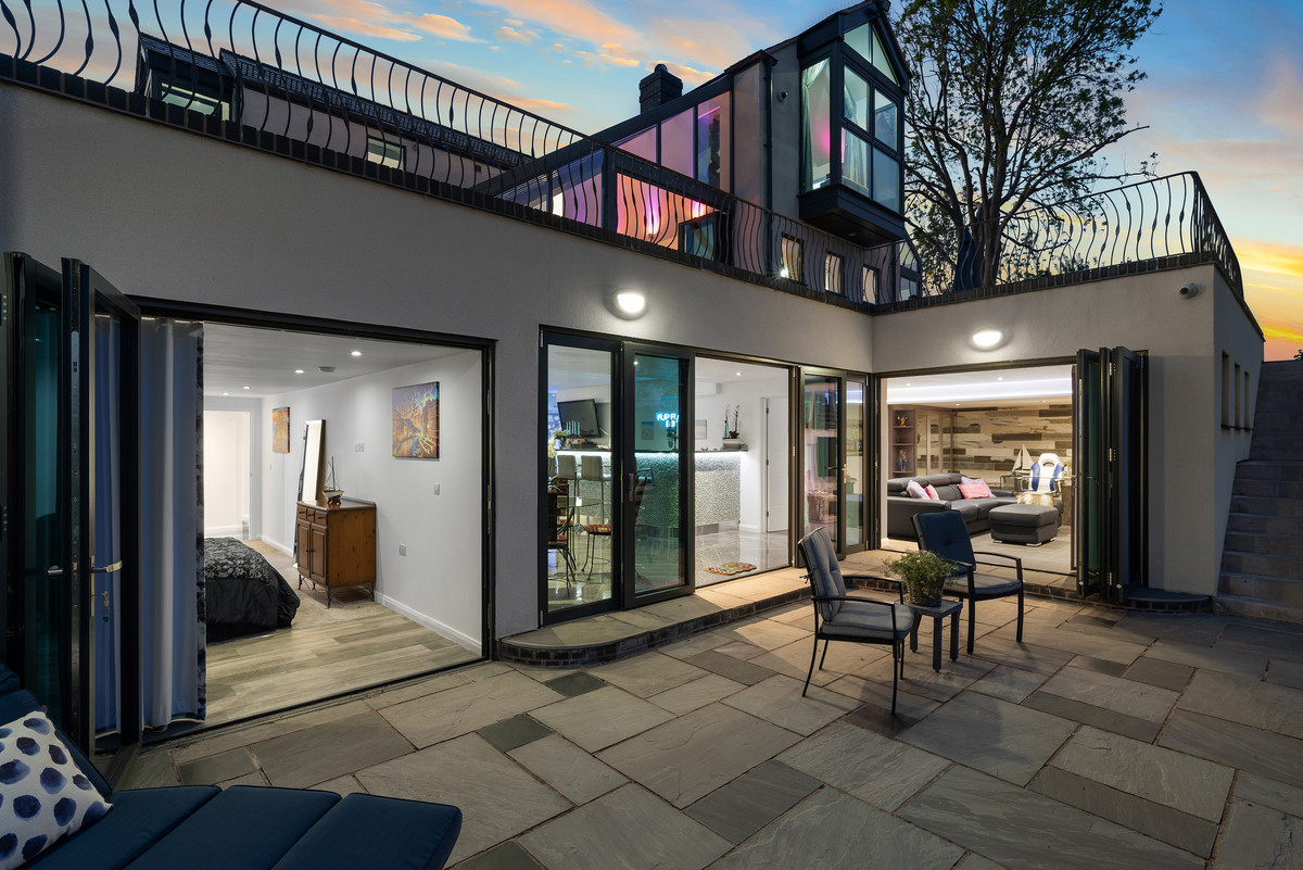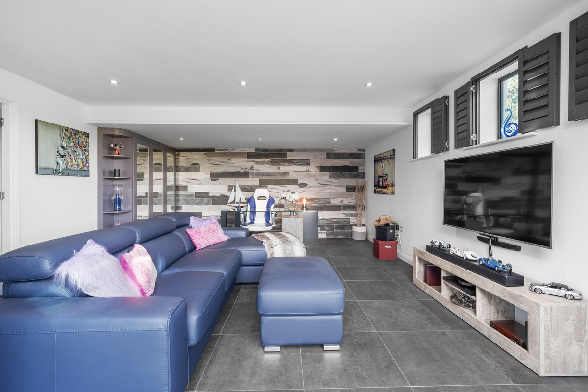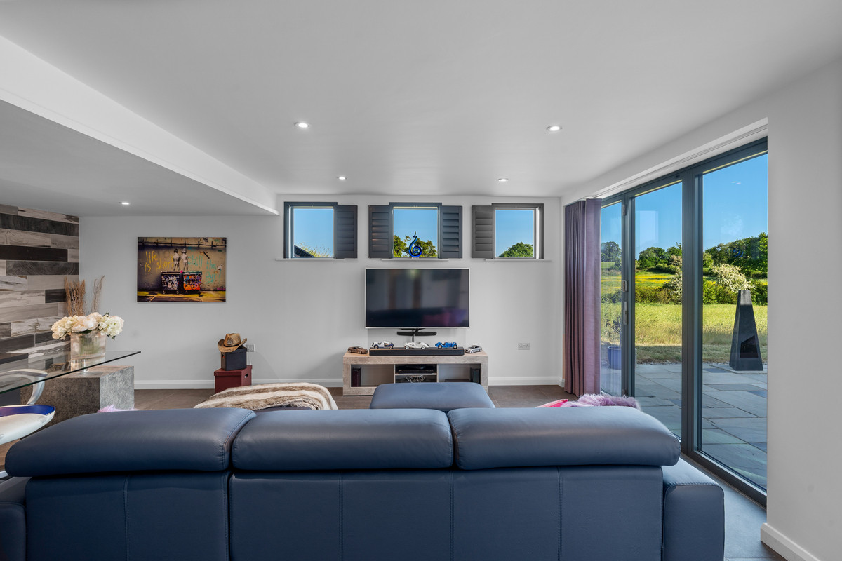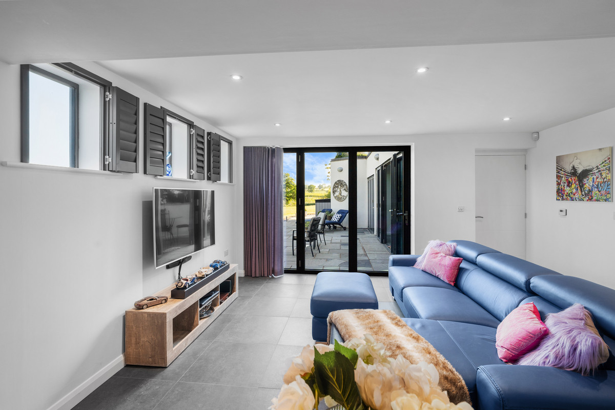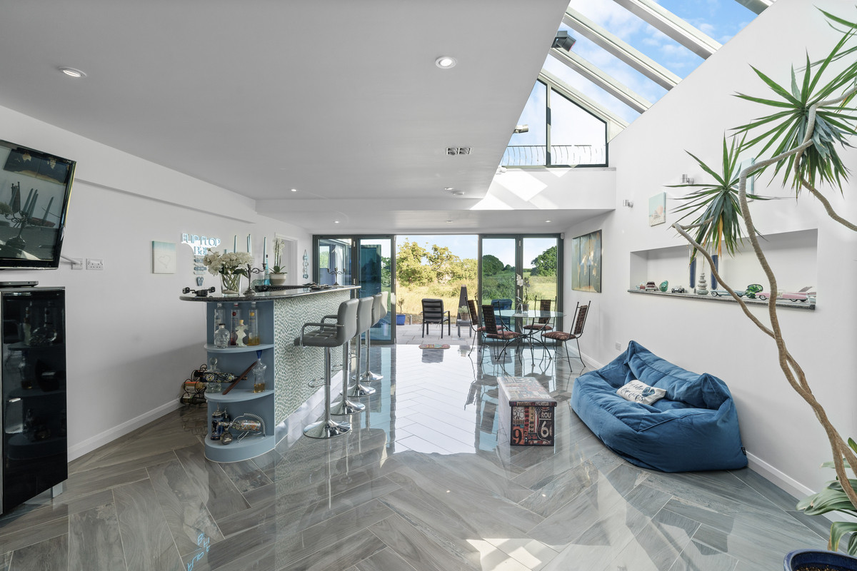 This expansive multi-use space is fully tiled in elegant grey porcelain herringbone, crowned by the glass atrium above which bathes the entire area in natural light. Fullheight six-panel glazed doors open directly onto the lower patio, creating a seamless indoor-outdoor connection. Integrated task uplighting and downlights enhance the ambience.