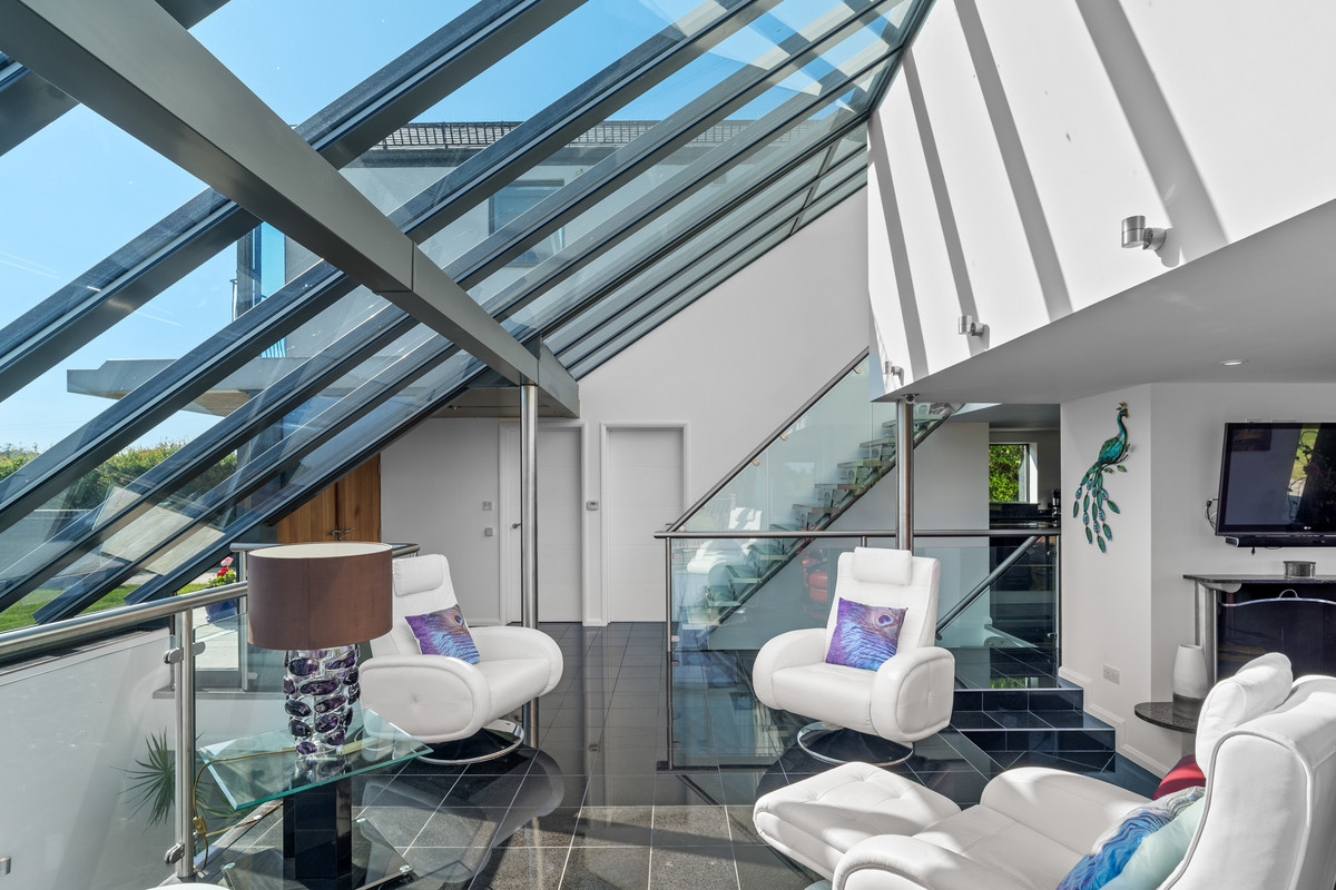 Accessed via a bespoke glass and stainless steel staircase, the first floor unfolds into a light-filled upper atrium landing, complete with an automated ventilation window—an architectural flourish that enhances both form and function.