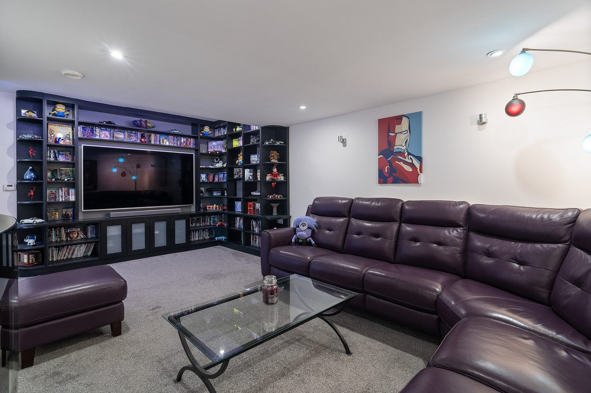 An indulgent retreat for film lovers. Featuring plush wool carpeting, dimmable Lutron lighting, bespoke media cabinetry, shelving, and TV infrastructure—this room is designed for immersive entertainment.