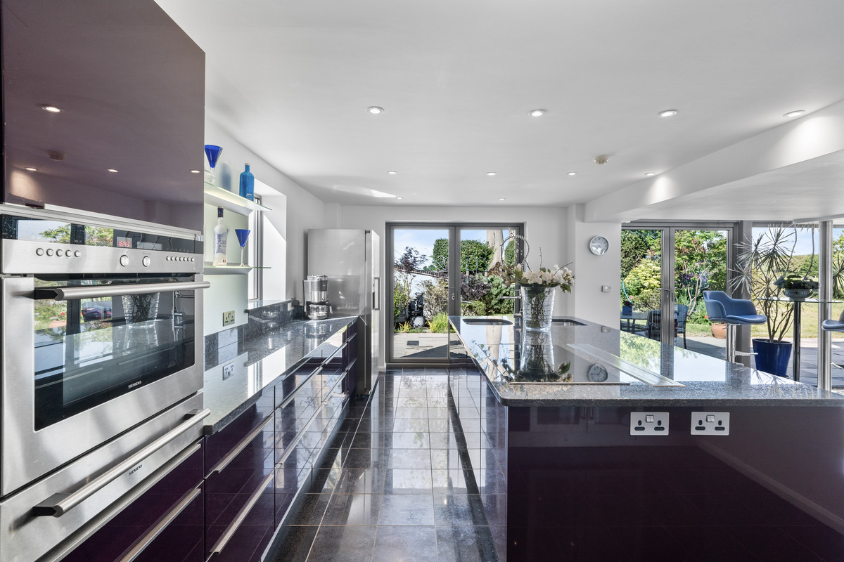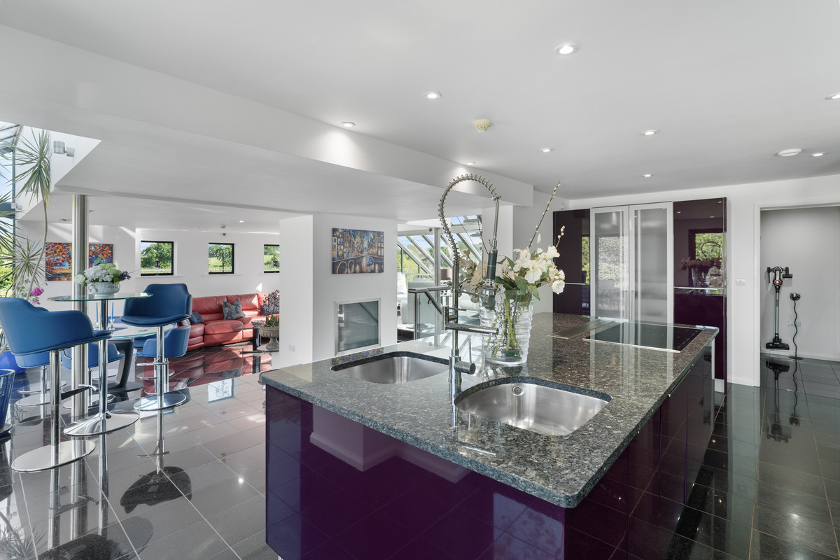 The heart of the home: an exceptional bespoke Nolte kitchen, designed in high-gloss purple cabinetry, with Blue Pearl granite work surfaces and stainless steel detailing throughout. The central island, crowned by a seamless single-slab granite top, includes dual stainless sinks, a Blanco Master S Profi tap, integrated Sinkerator, and high end Siemens appliances including a 5-pan induction hob with remote-controlled Gutmann extractor. The space is finished with precision lighting and extensive bespoke storage.