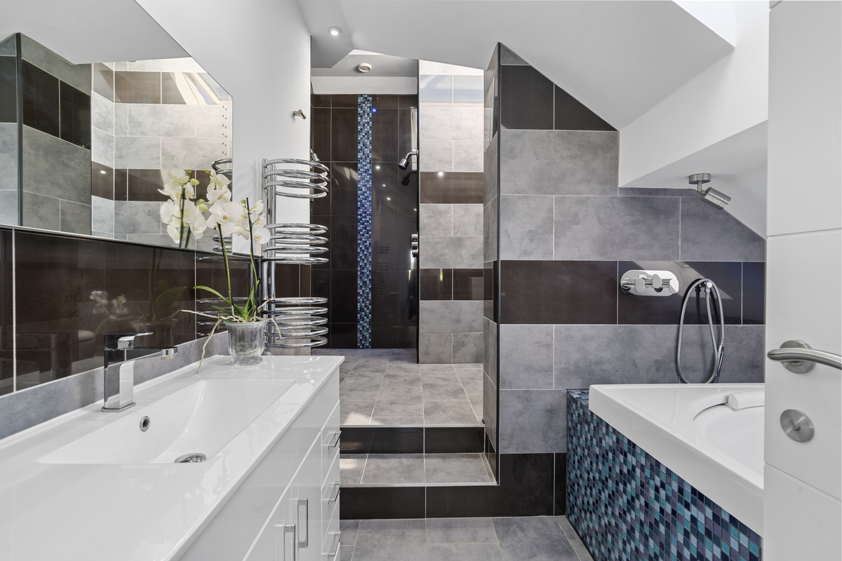 The ensuite bathroom is a contemporary statement in form and function, fully tiled, with a vaulted ceiling and dual Velux windows. A sculptural white circular bath, porcelain vanity suite, and a raised platform leading to the WC and incredible double power shower with multi-head fittings and mosaic detailing define the space. Additional features include a chrome heated towel rail, TV socket, and an illuminated shaving mirror with integrated power.