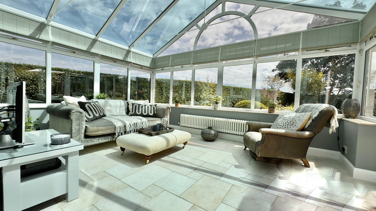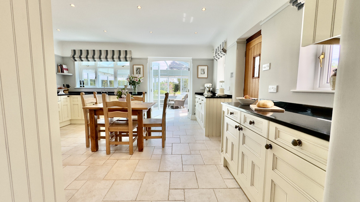 The heart of the home lies in the bespoke country kitchen, complete with a four-oven Aga, hand-finished tiles, high-end cabinetry, and integrated appliances. A relaxed dining space opens into the conservatory, offering uninterrupted views across the garden and open countryside – perfect for peaceful mornings or entertaining friends and family.