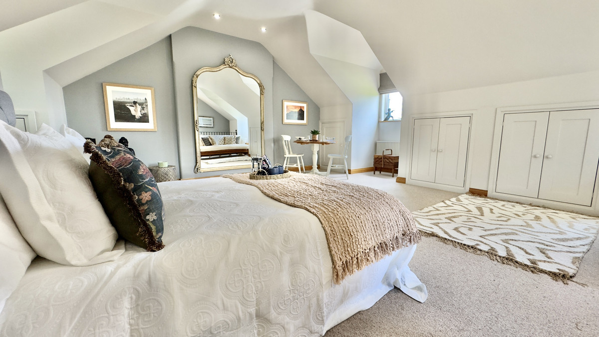 The first floor offers four bedrooms in total, two of which are doubles. The principal suite is a true sanctuary, with a Juliet balcony that captures panoramic rural vistas. The en-suite bathroom adds a luxurious touch to this private space. One of the bedrooms is currently configured as a bespoke library, with handcrafted shelving – equally suited to use as a nursery, home office, or dressing room. A luxurious family bathroom serves the remaining bedrooms, continuing the theme of elegance and high-quality finish.