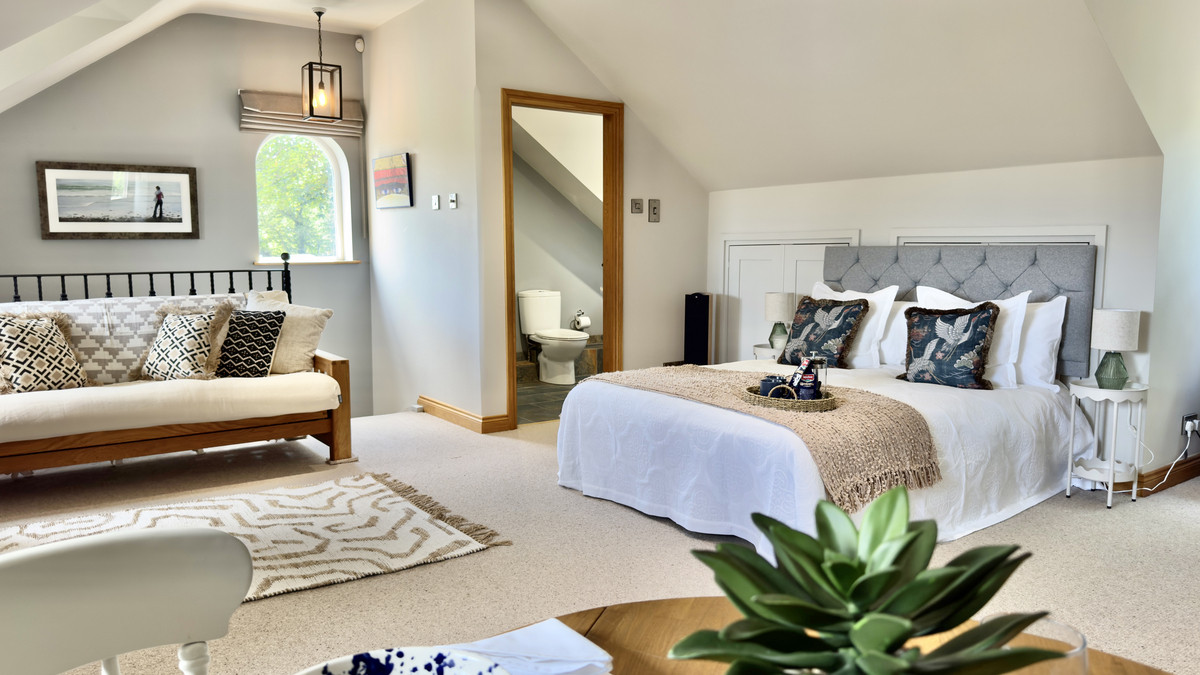 A spacious upstairs bedroom suite with en-suite bathroom