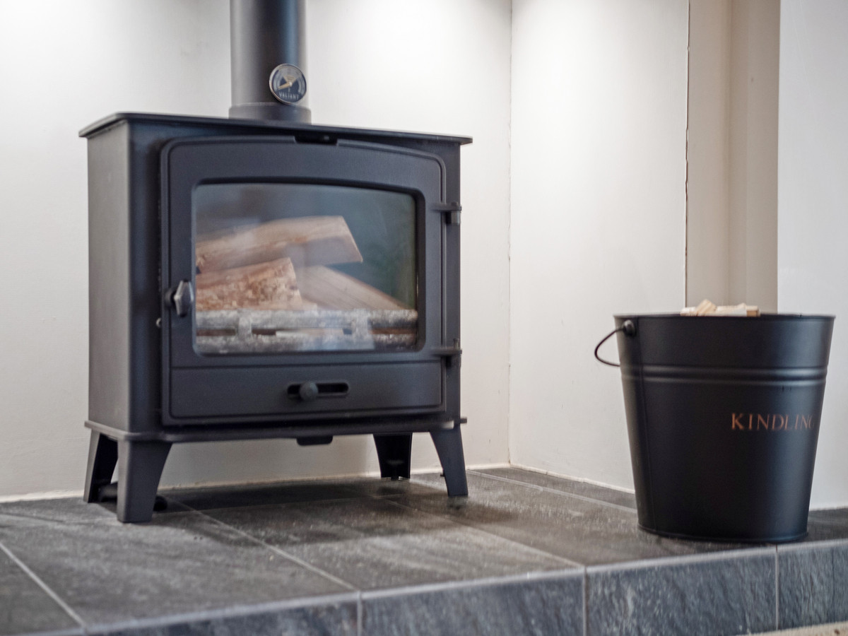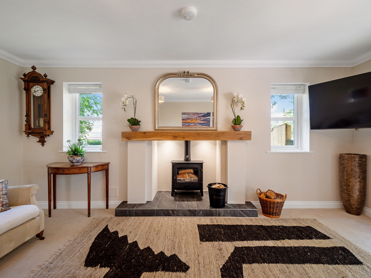 To the left, a bright and versatile home office enjoys dual-aspect views — ideal for home working or use as a guest bedroom. The elegant sitting room is warm and inviting, centred around a wood-burning stove and opening onto the rear terrace via French doors.