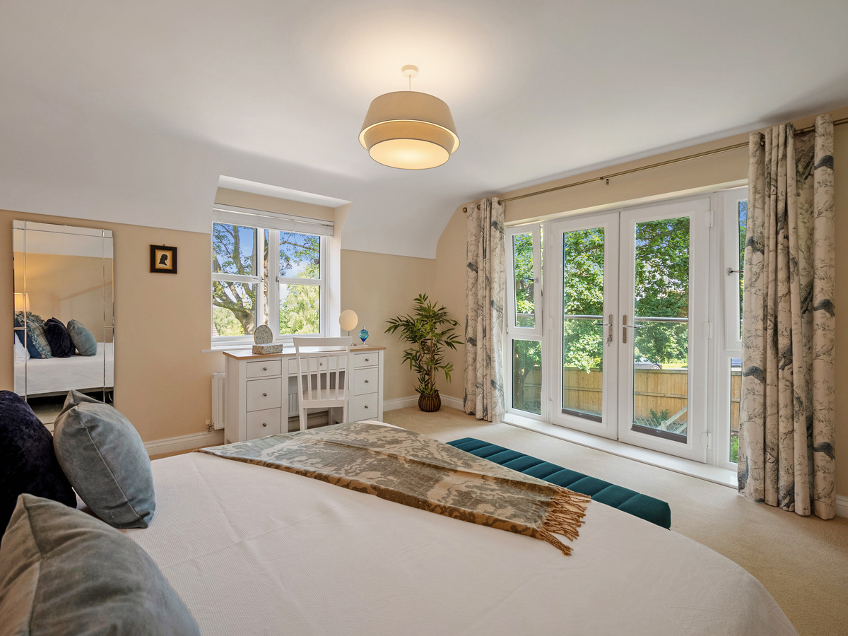 Upstairs, the principle suite plus four generously proportioned double bedrooms offer flexibility for modern family life. Two enjoy en suite facilities, and all are flooded with light. The luxurious principal suite includes a Juliet balcony with garden views, a separate dressing room, and an indulgent en suite bathroom worthy of a boutique hotel.
