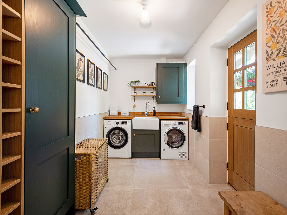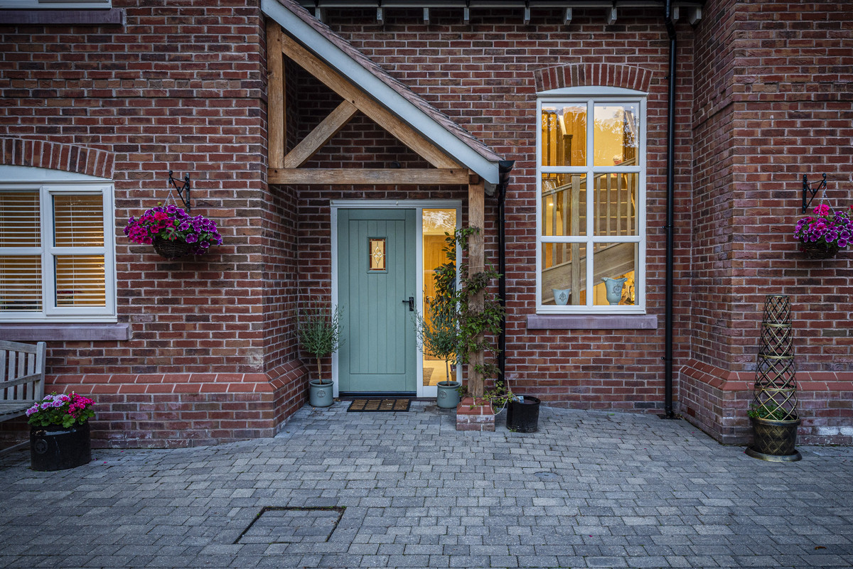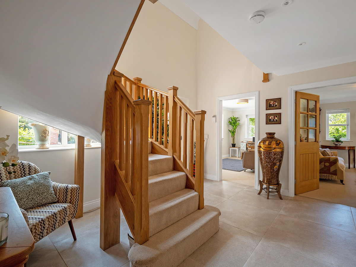 You enter via a handsome oak-framed porch into a striking hallway, bathed in natural light from a full-height feature window. The bespoke oak staircase, solid oak doors, and large-format tiled flooring set the tone for the quality throughout.