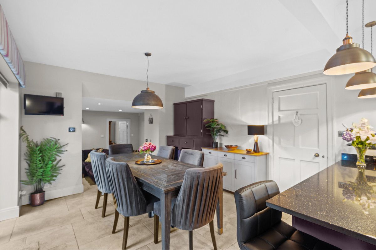 The formal dining room offers an elegant setting for entertaining, with direct access to a private courtyard that lends itself beautifully to intimate alfresco gatherings. From here, the family room connects seamlessly to the utility room, boot room, and a practical ground-floor shower room, ideal after country walks with pets, offering immediate access to washing facilities.