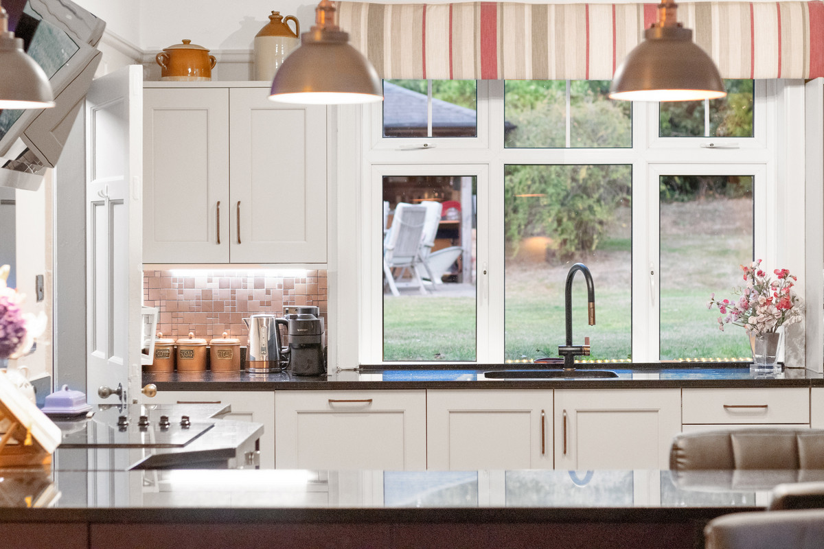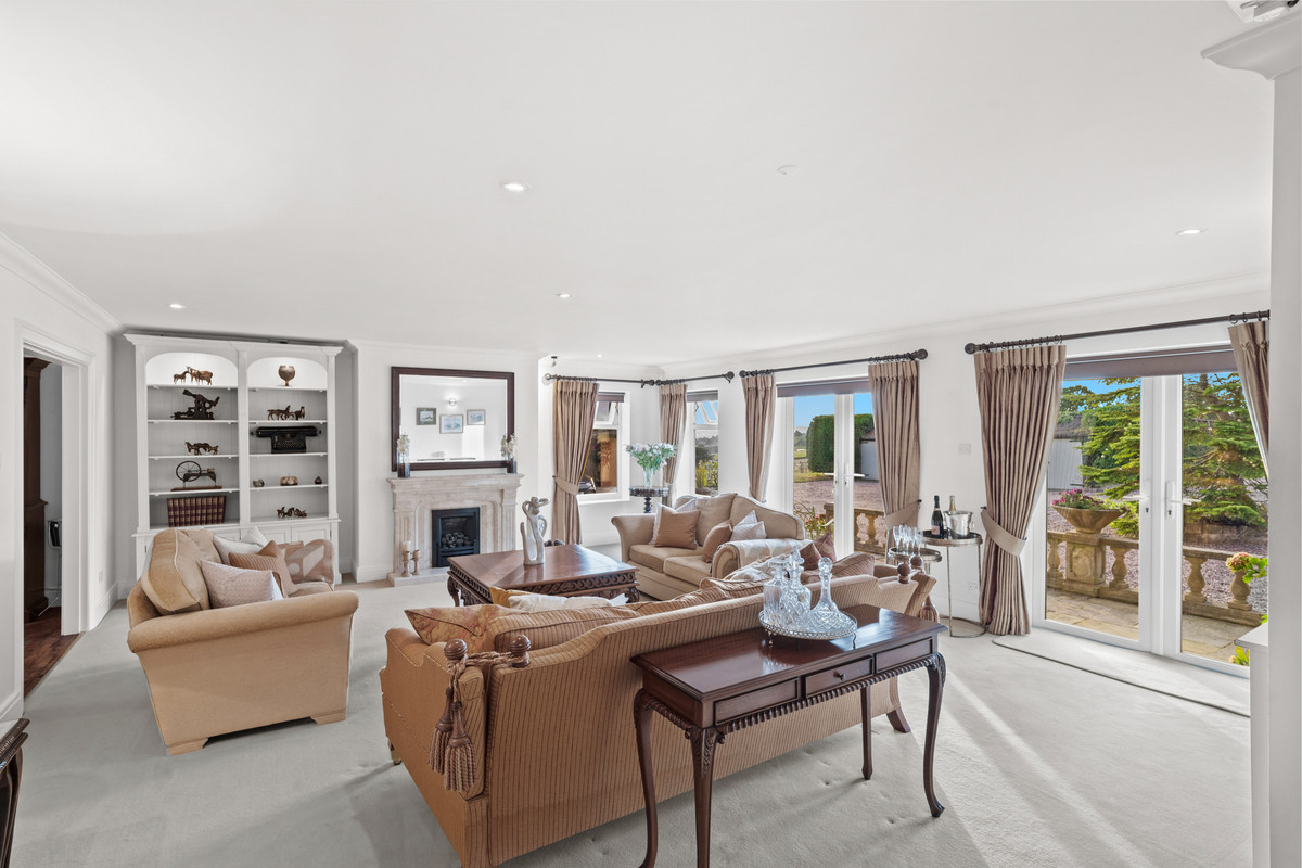 To one side, the sitting room provides a serene retreat, complete with bespoke built-in storage and a charming fireplace, the perfect spot to unwind with a book or enjoy quiet conversation. Opposite, double doors lead to the magnificent drawing room, where an abundance of natural light, a striking feature fireplace, and French doors opening onto the front terrace create a truly inviting space. Here, evening sunsets over the rolling countryside can be enjoyed in absolute comfort.