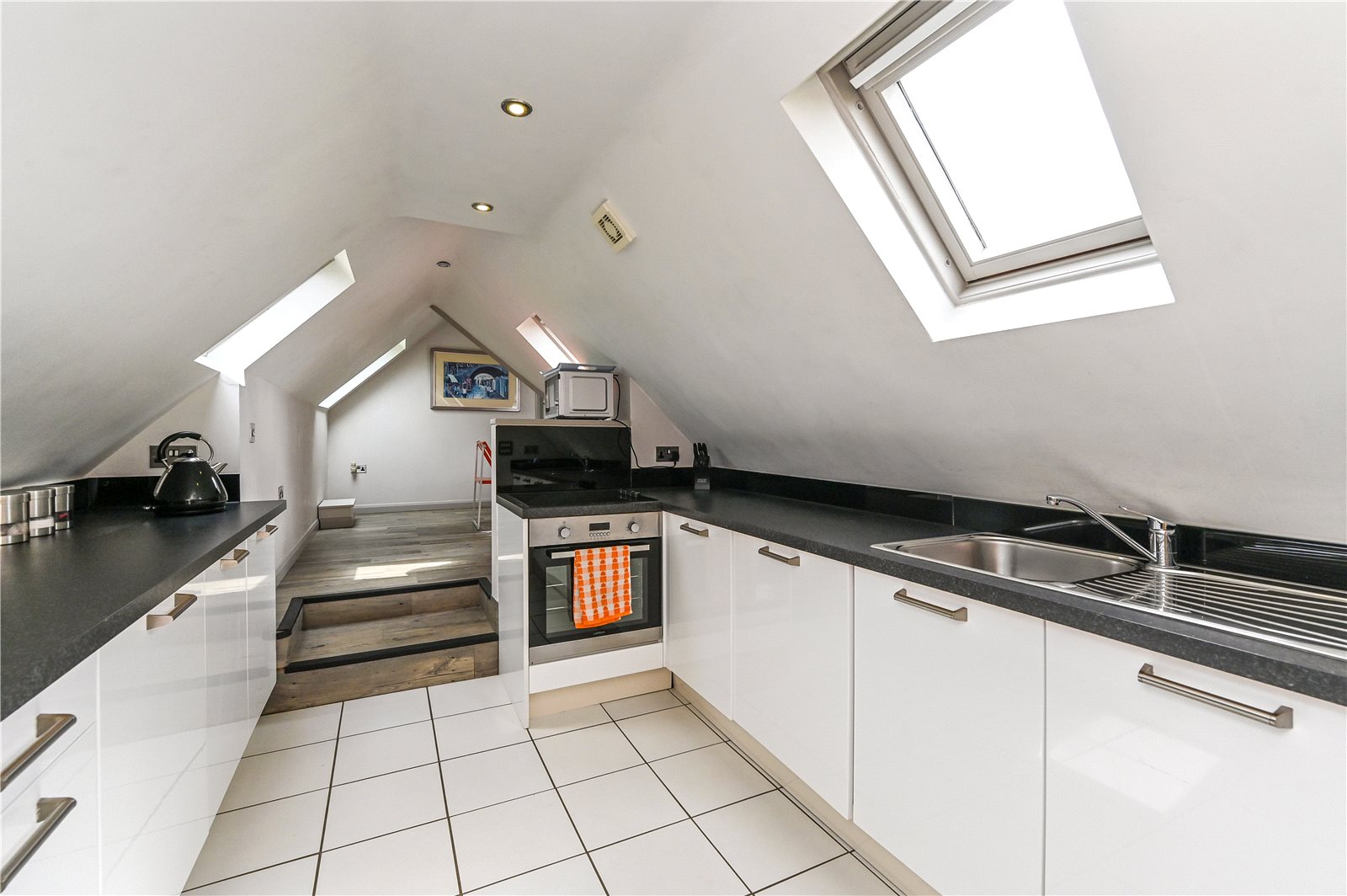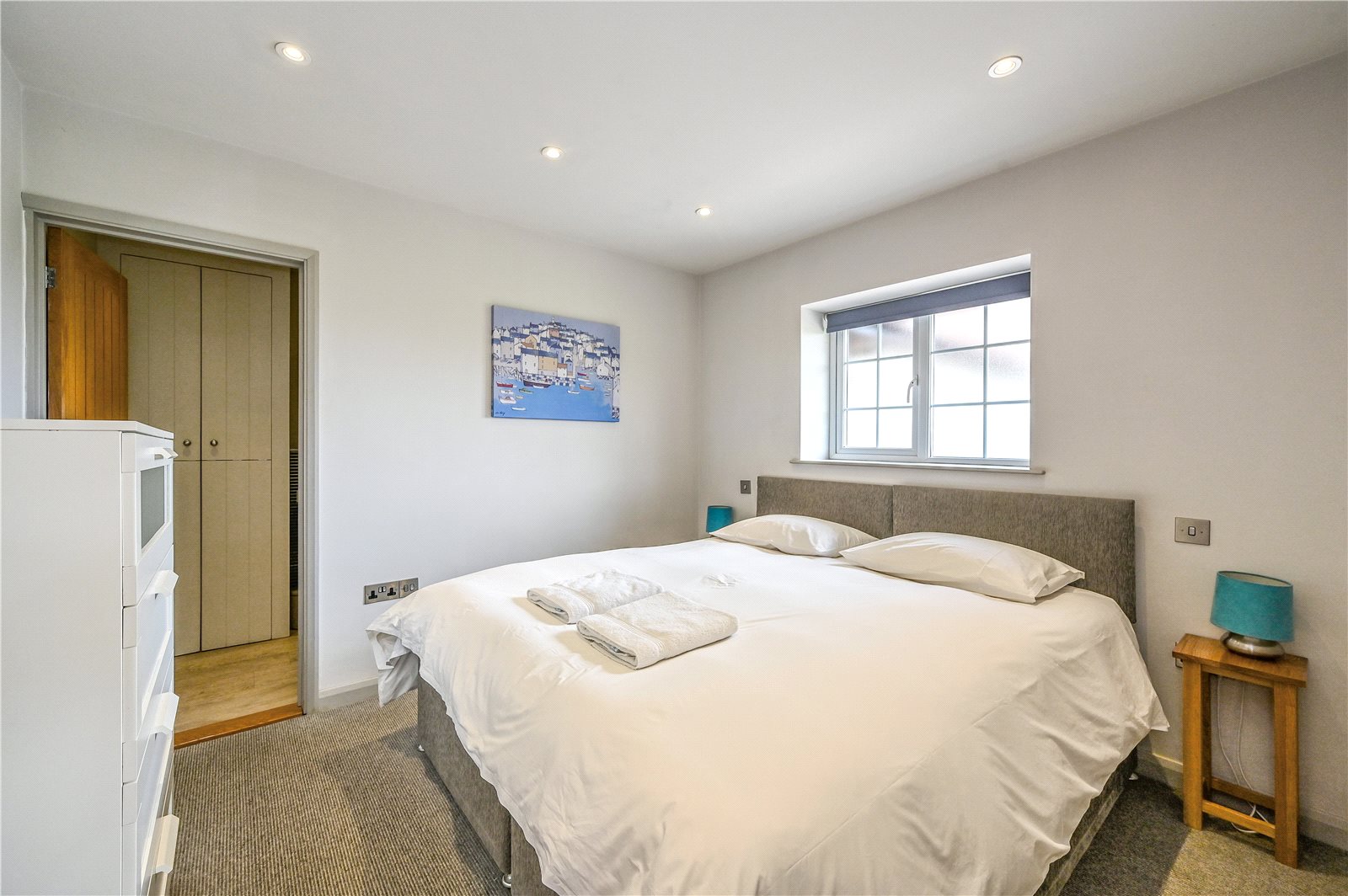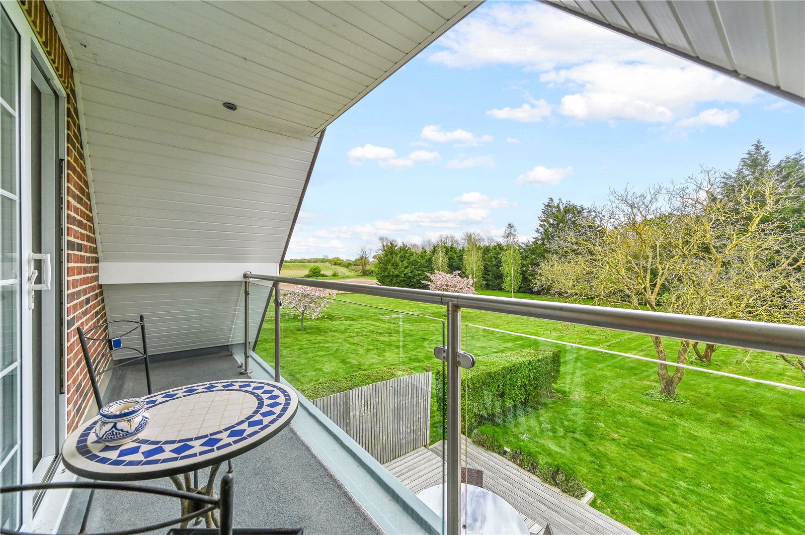 A guest bedroom offers its own ensuite shower room and access to a sunny balcony, providing a secluded escape overlooking the rear gardens. Two additional double bedrooms offer comfort and serenity, sharing access to a luxuriously appointed bathroom featuring a sumptuous freestanding roll-top bath.