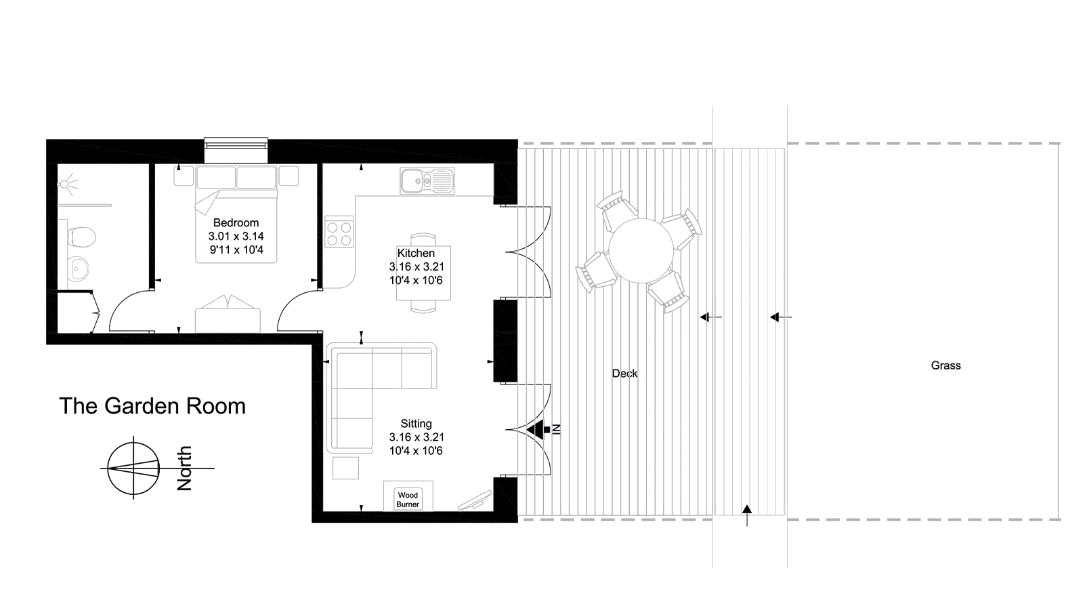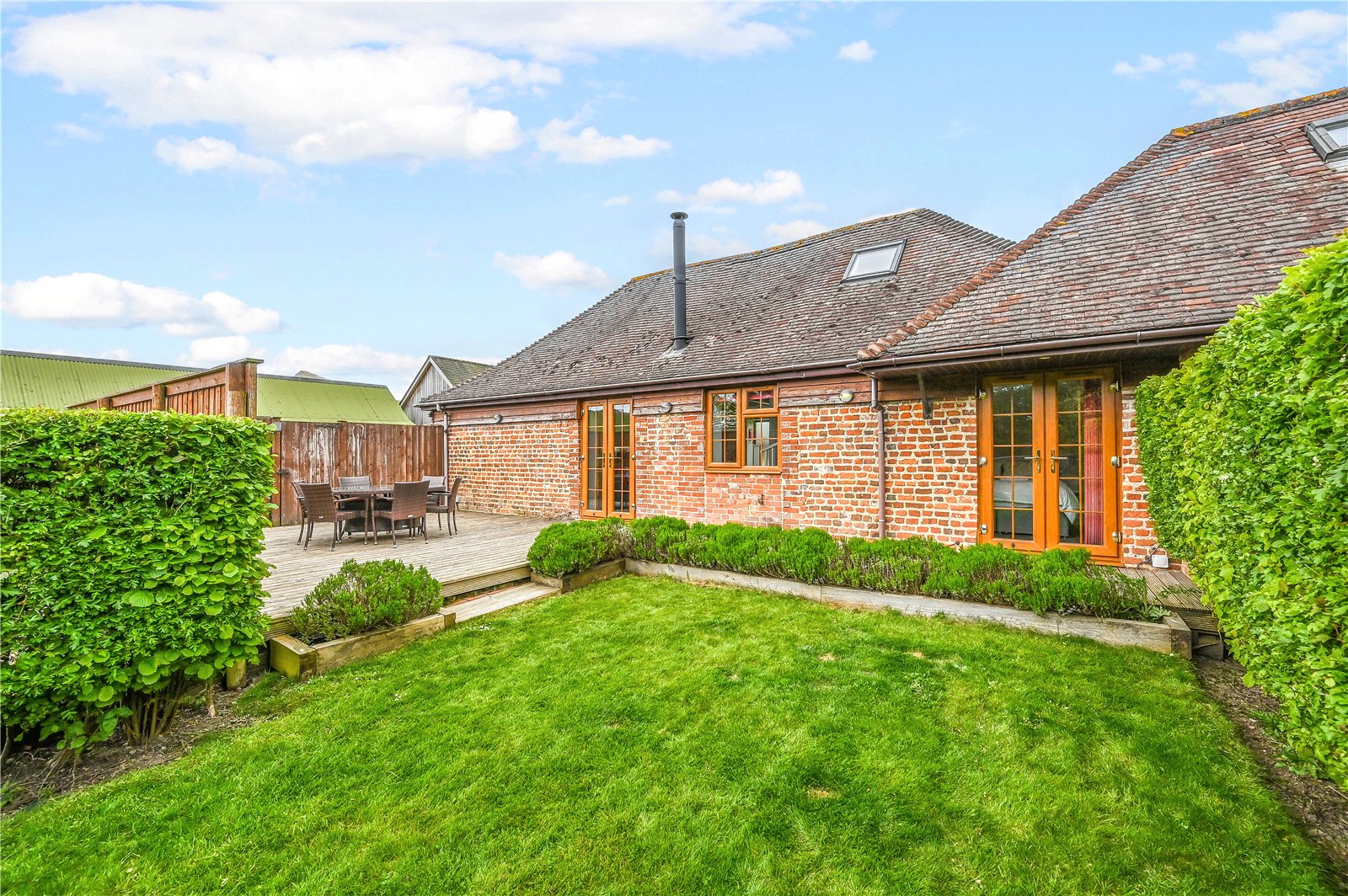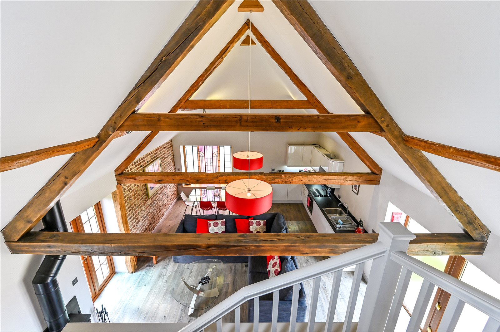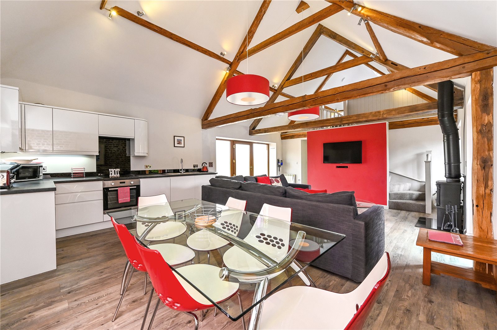 Situated at the western end of the farmhouse, The Barn radiates character and charm. Its open-plan vaulted kitchen/living area features a wood-burning stove, exposed beams, and brick walls. Additionally, it offers a mezzanine bedroom or study, a spacious double bedroom with French doors leading to the garden, and a contemporary bathroom. The Barn provides access to a private decking and garden area through the open plan living space.