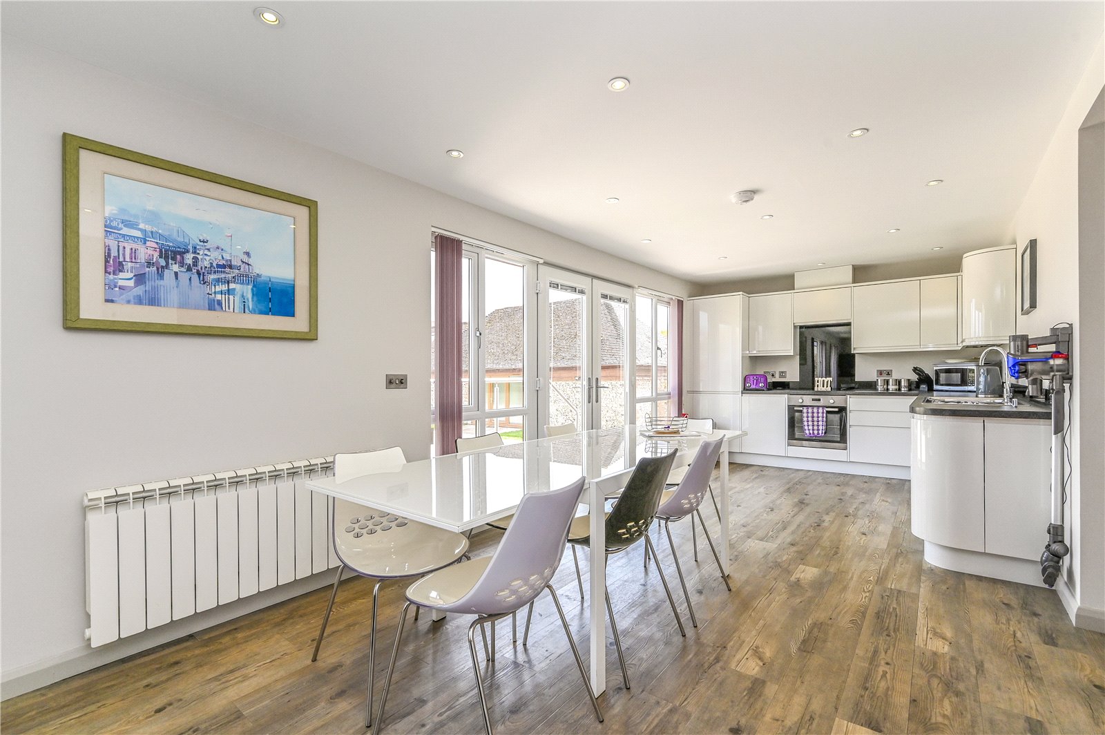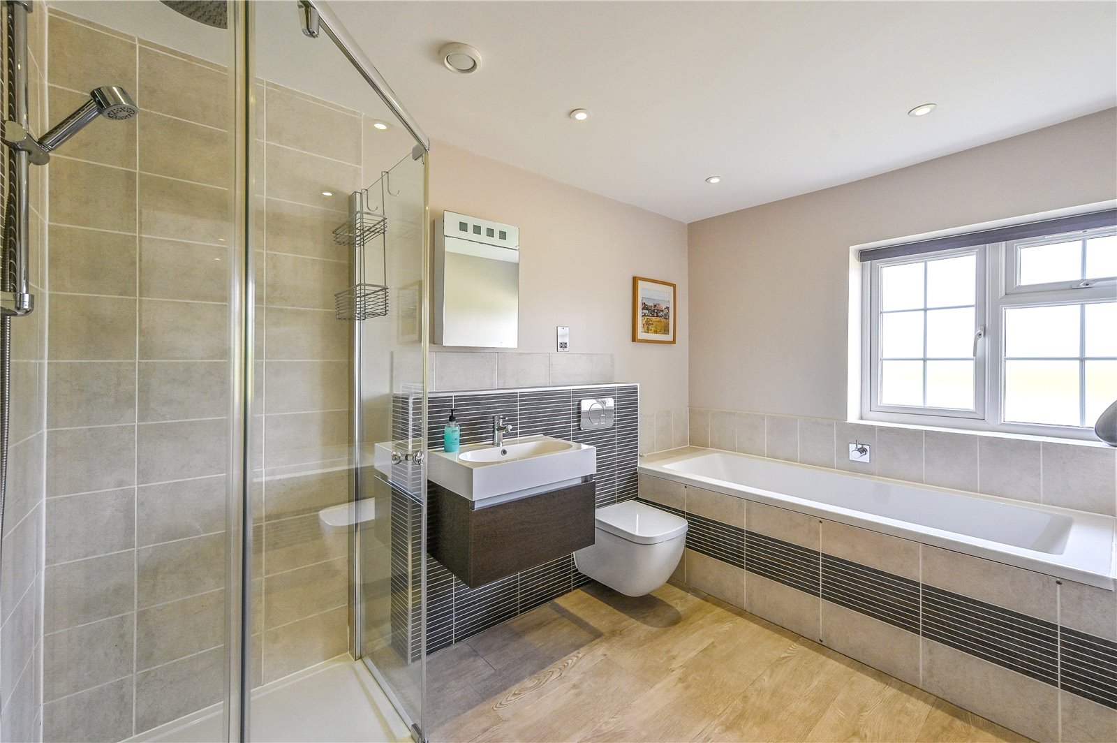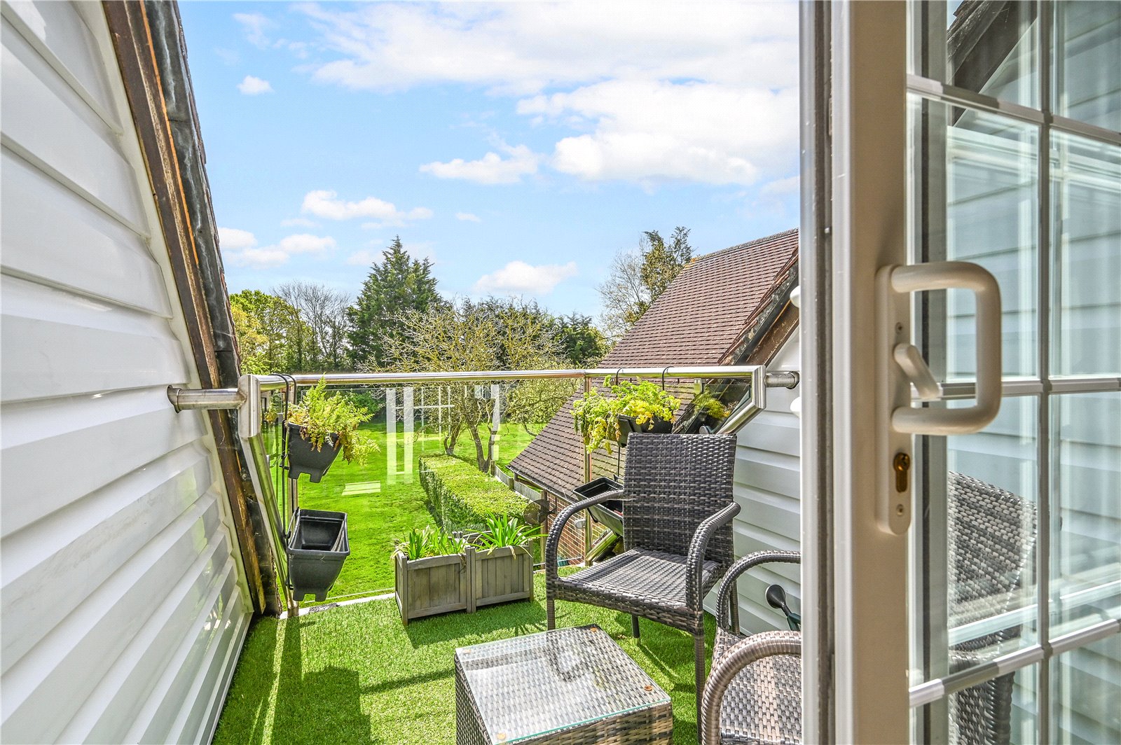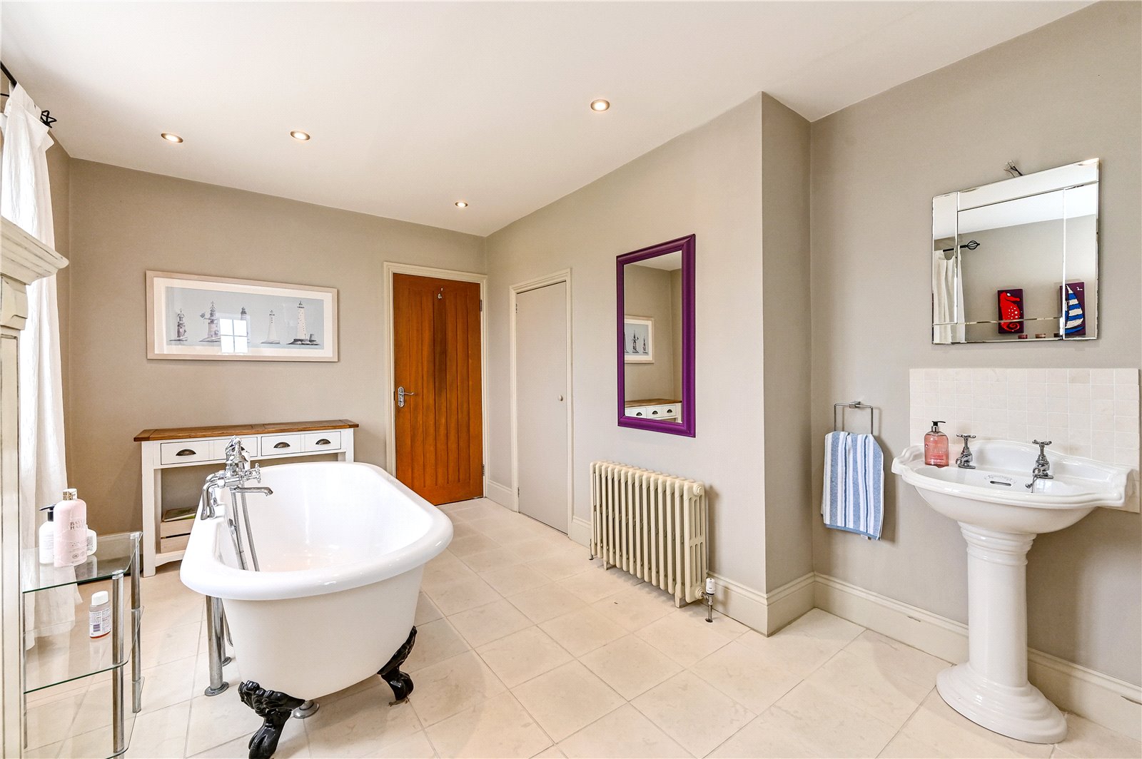 A guest bedroom offers its own ensuite shower room and access to a sunny balcony, providing a secluded escape overlooking the rear gardens. Two additional double bedrooms offer comfort and serenity, sharing access to a luxuriously appointed bathroom featuring a sumptuous freestanding roll-top bath.