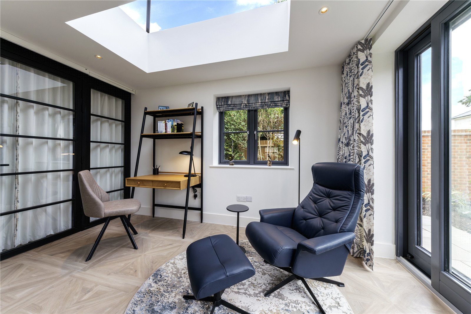 The open plan dining/ living / reading room is a standout feature. Triple aspect windows, a striking roof lantern, and two sets of sliding doors bathe the space in natural light and create a seamless connection to the walled, south-facing garden, perfect for entertaining or simply enjoying an effortless indoor-outdoor lifestyle.