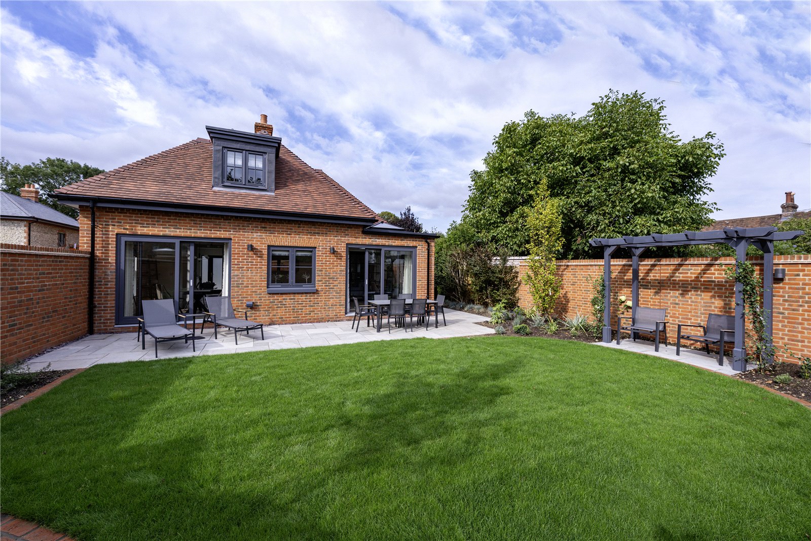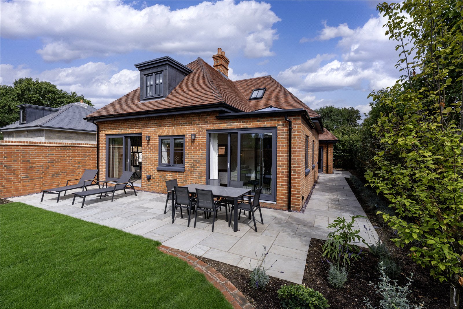 The south-facing garden is a real feature, enclosed by a handsome wall for privacy and beautifully landscaped with a variety of trees and plants. The separate pergola and seating area provides the perfect sunny spot for an afternoon tea or early evening drink. A wraparound patio extends the living space outdoors and leads to a detached garage and driveway, providing ample parking.