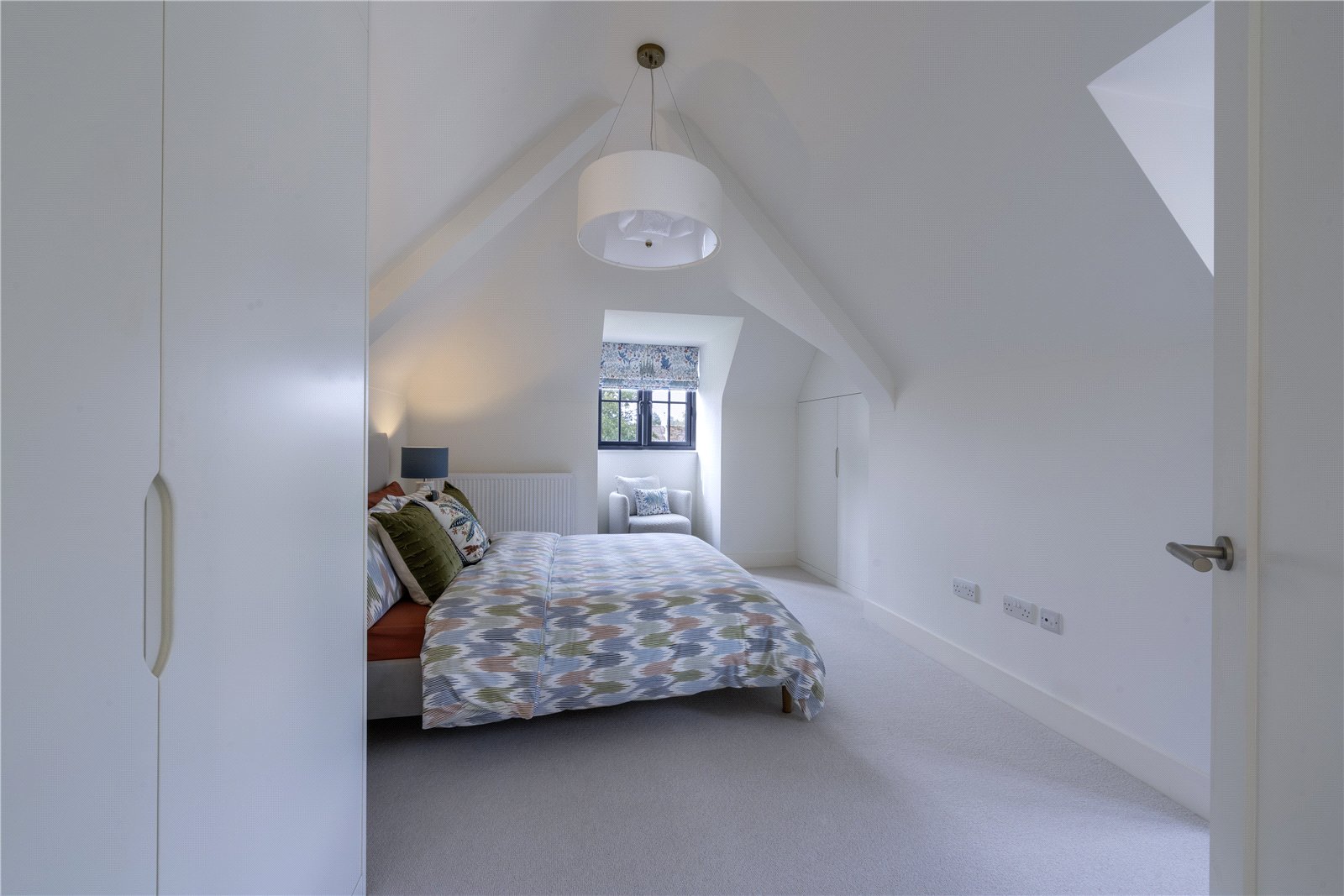 Rising to the first floor, a particular highlight is the vaulted ceilings which add character and charm. The first floor bedroom is also large, with bespoke fitted enjoys fitted wardrobes, space for an armchair and dressing table and views over the landscaped gardens. The bathroom is beautifully appointed with a freestanding oval bath and large-format marble-effect wall tiles, exuding a boutique-hotel feel. A laundry room on the first floor and ground-floor cloakroom add convenience to this thoughtfully designed home.