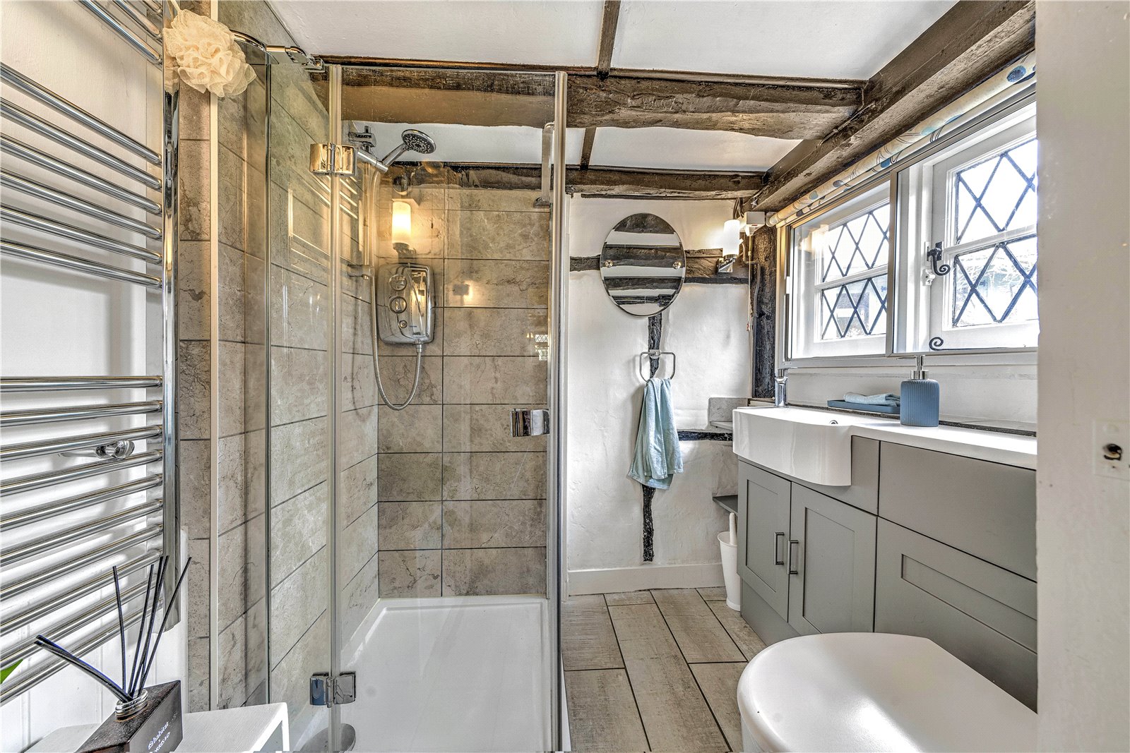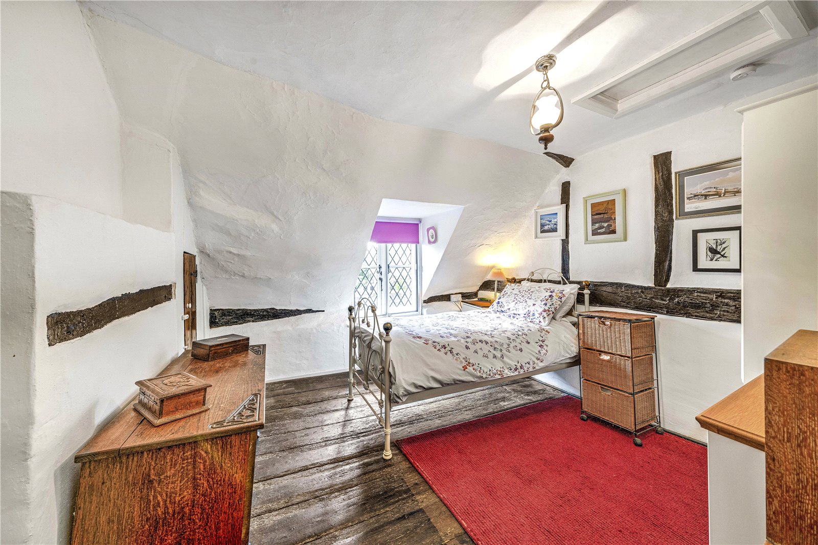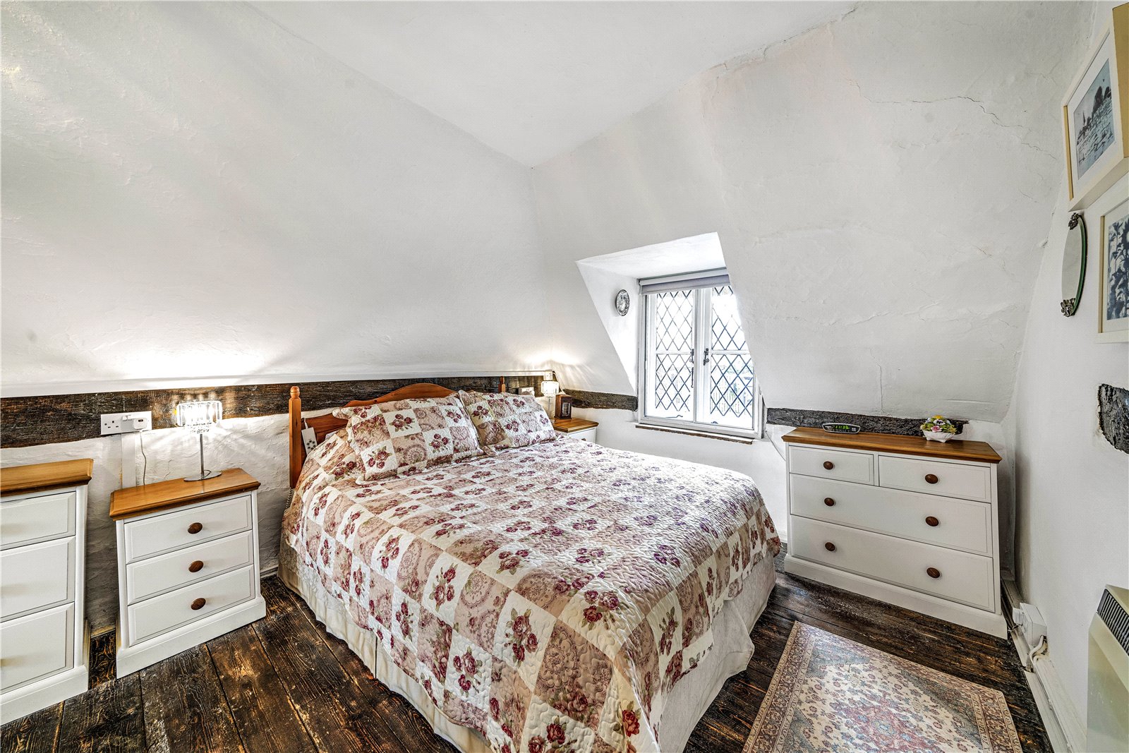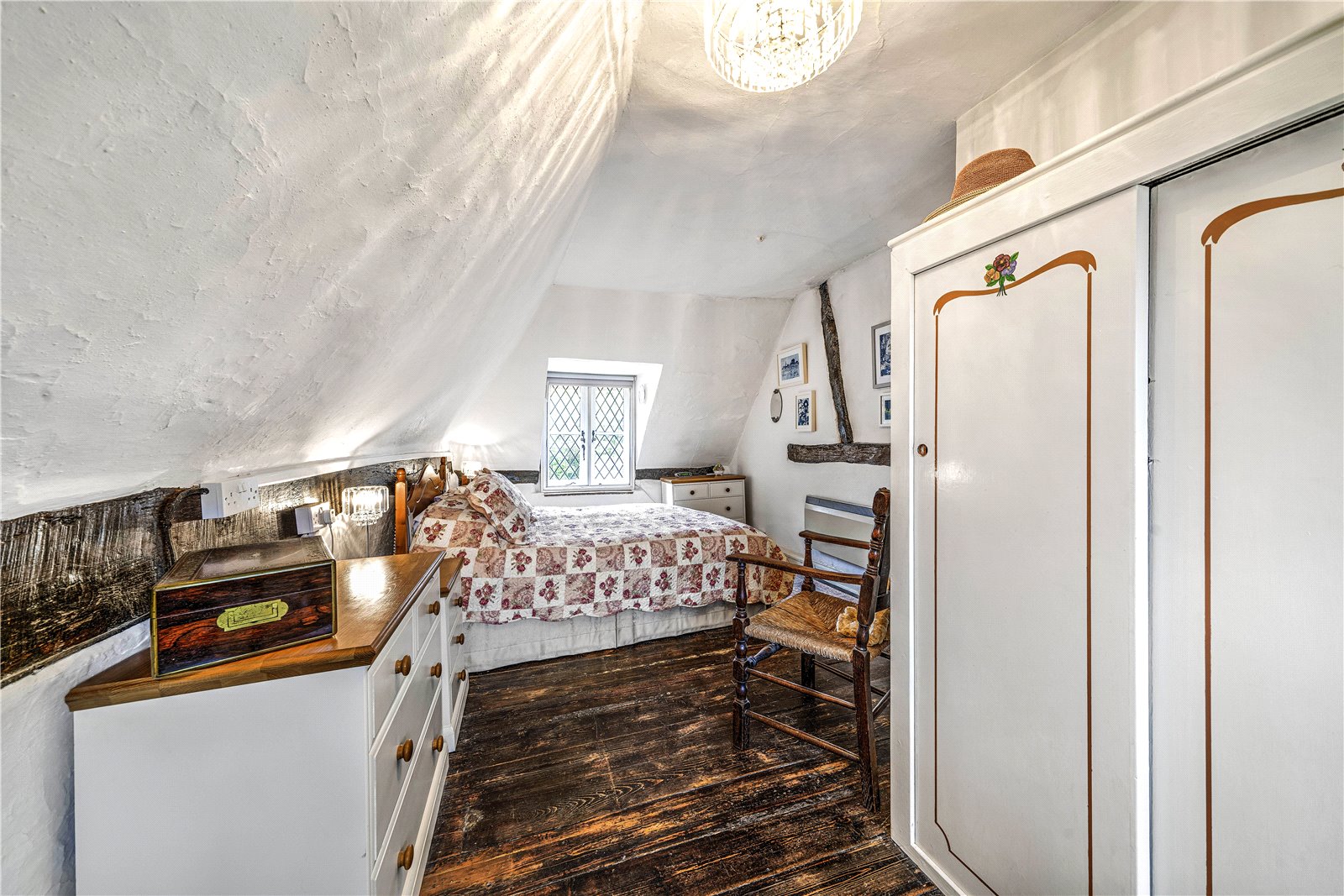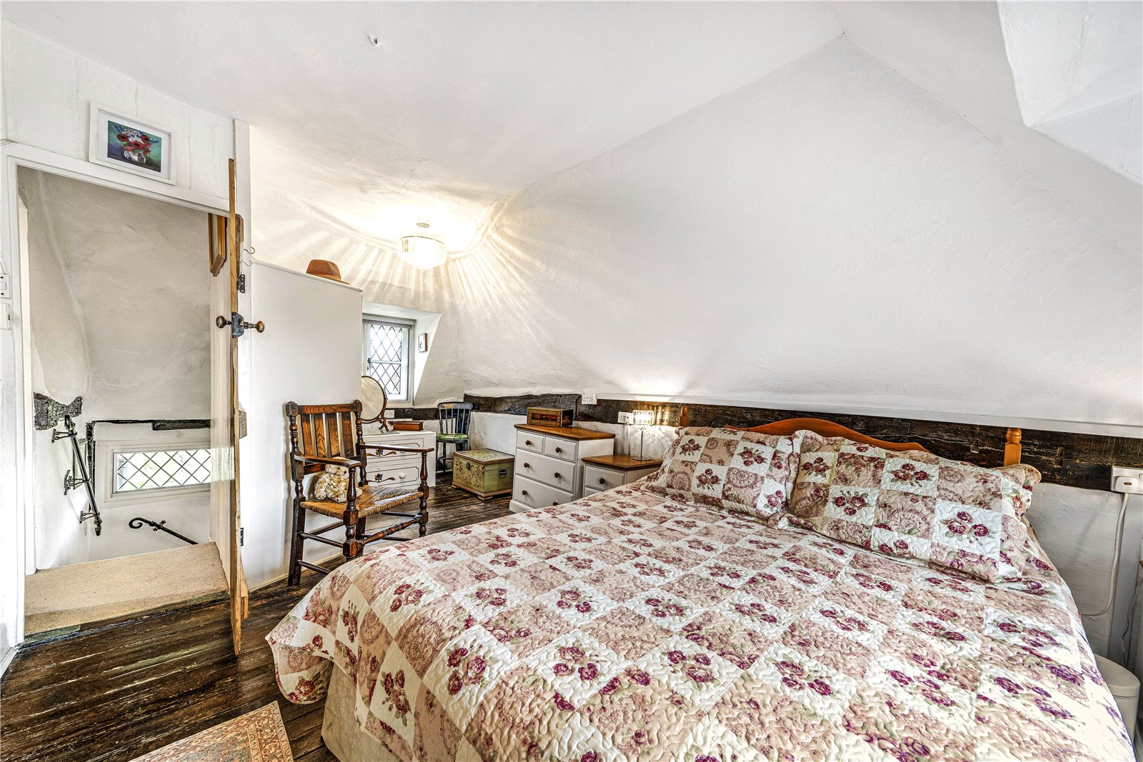 Upstairs, the character continues across three bedrooms, each with vaulted ceilings and its own distinct appeal. The master bedroom is a spacious, double-aspect retreat that spans the entire width of the cottage. For added convenience, there is a WC on this floor.