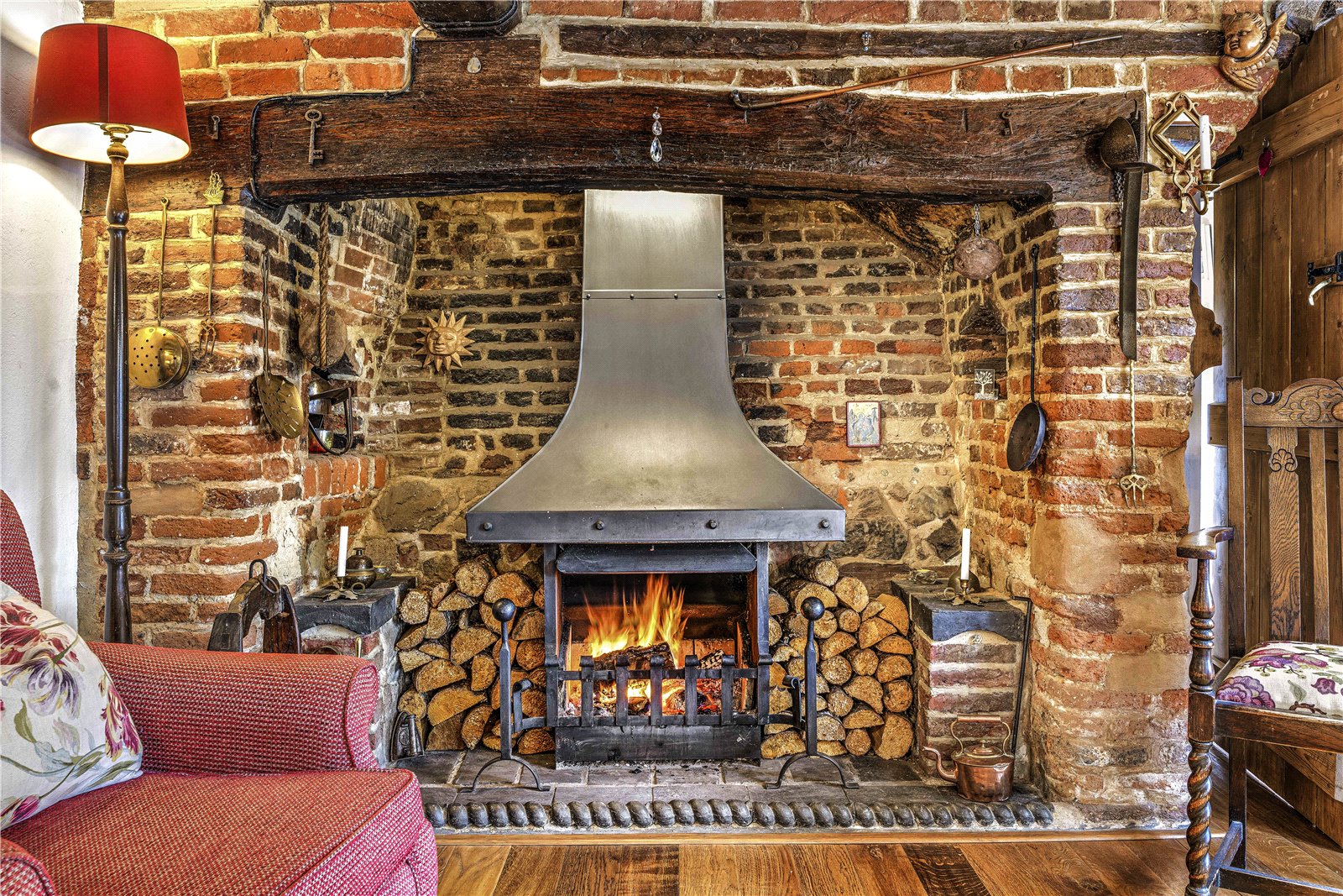 On the ground floor, the layout unfolds beautifully. To the left, the sitting/dining room is a standout space, featuring a captivating inglenook open fireplace, a hallmark of its era.