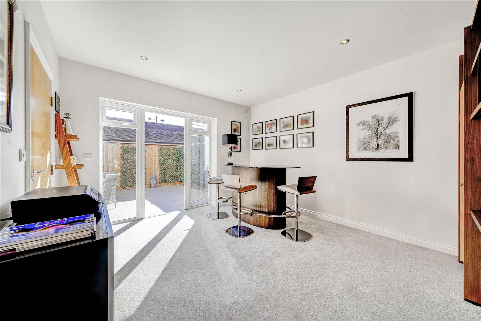 Spanning three levels, the interior is thoughtfully designed for versatility and effortless living. Upon entering, you are welcomed by a spacious hallway with useful storage cupboards for coats and essentials, along with a personal door to the integral garage. The ground floor also features a well-appointed bedroom with direct access to the courtyard garden and a stylish ensuite shower room. Currently used as a study and entertainment space—complete with a drinks bar—this room showcases the home's flexibility. Underfloor heating enhances comfort on this level, while the upper floors benefit from radiators.