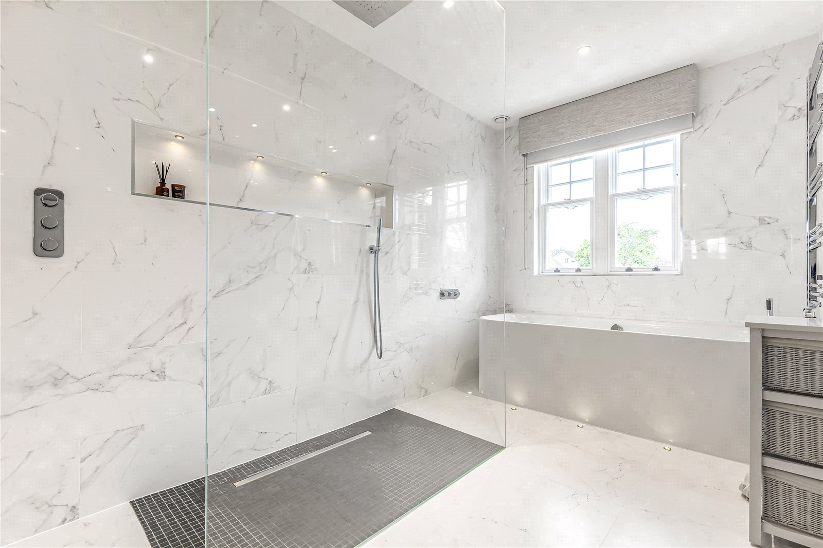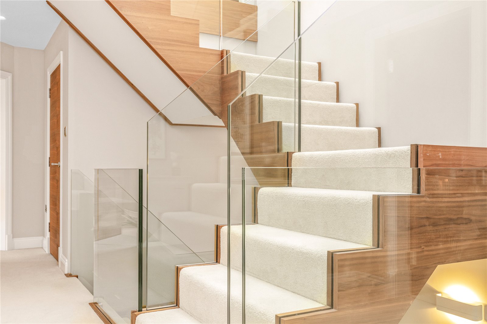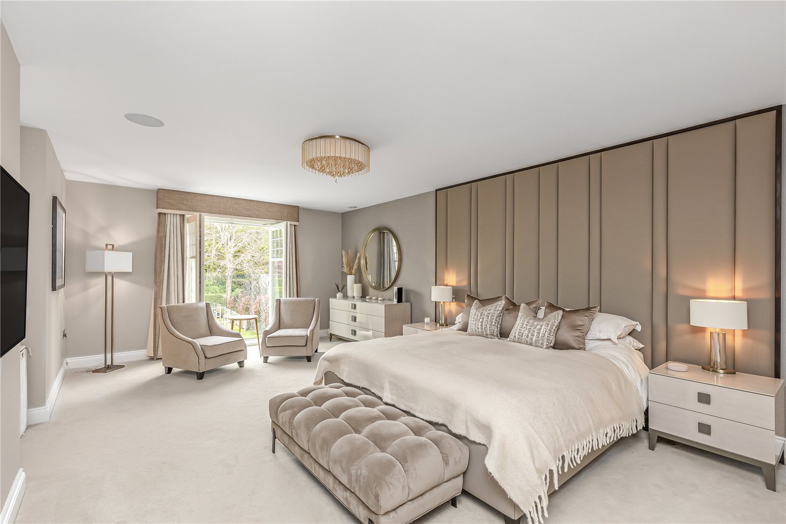 The first-floor galleried landing, with glass balustrade, leads to three luxurious double bedrooms. The principal suite is truly impressive, a vast bedroom with Juliet balcony overlooking the garden, a dream dressing room with central drawers, extensive shoe storage and hanging space, and a striking ensuite bathroom. Frosted glass doors open to reveal a spa-like sanctuary, complete with ceiling-fed rainfall double-sided shower and a separate bath. Two further double bedrooms on this level each enjoy their own beautifully appointed ensuites, ensuring every resident is indulged.