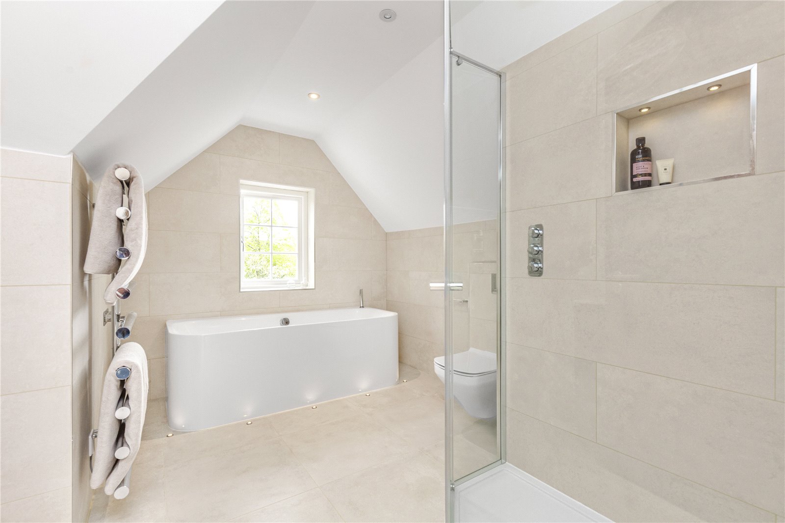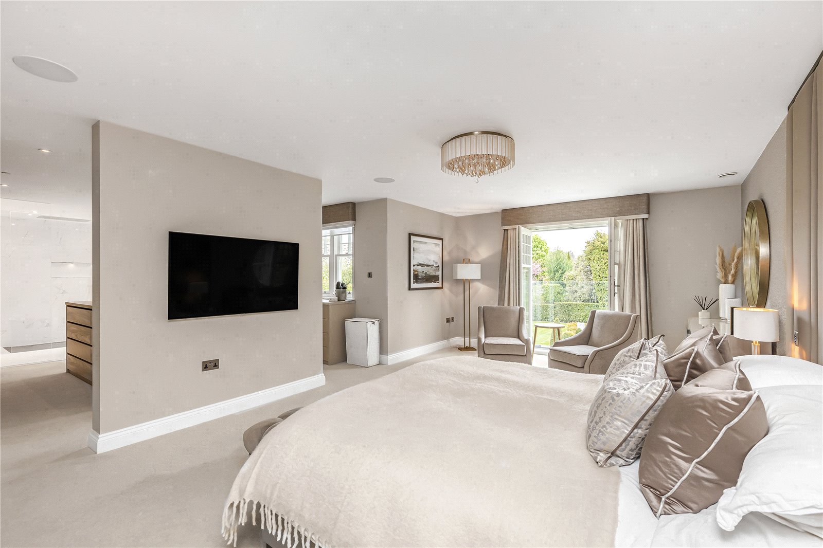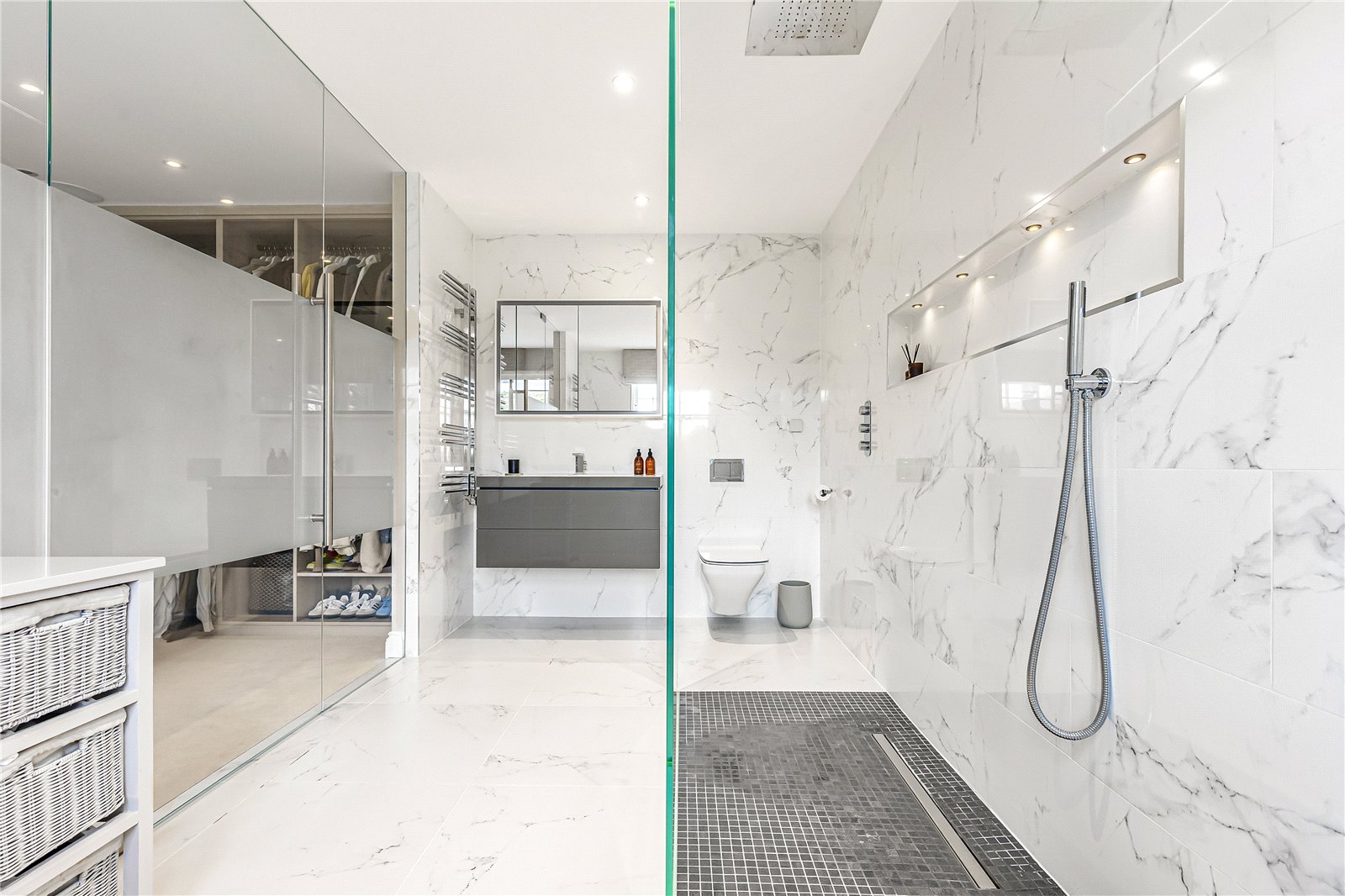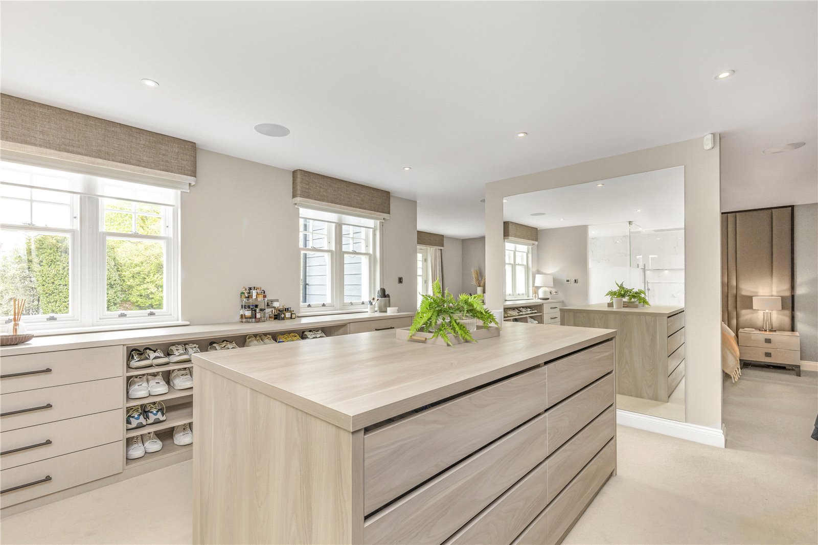 The first-floor galleried landing, with glass balustrade, leads to three luxurious double bedrooms. The principal suite is truly impressive, a vast bedroom with Juliet balcony overlooking the garden, a dream dressing room with central drawers, extensive shoe storage and hanging space, and a striking ensuite bathroom. Frosted glass doors open to reveal a spa-like sanctuary, complete with ceiling-fed rainfall double-sided shower and a separate bath. Two further double bedrooms on this level each enjoy their own beautifully appointed ensuites, ensuring every resident is indulged.