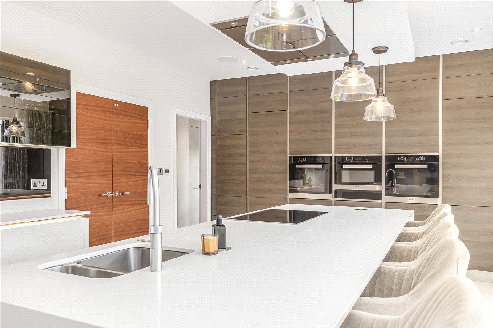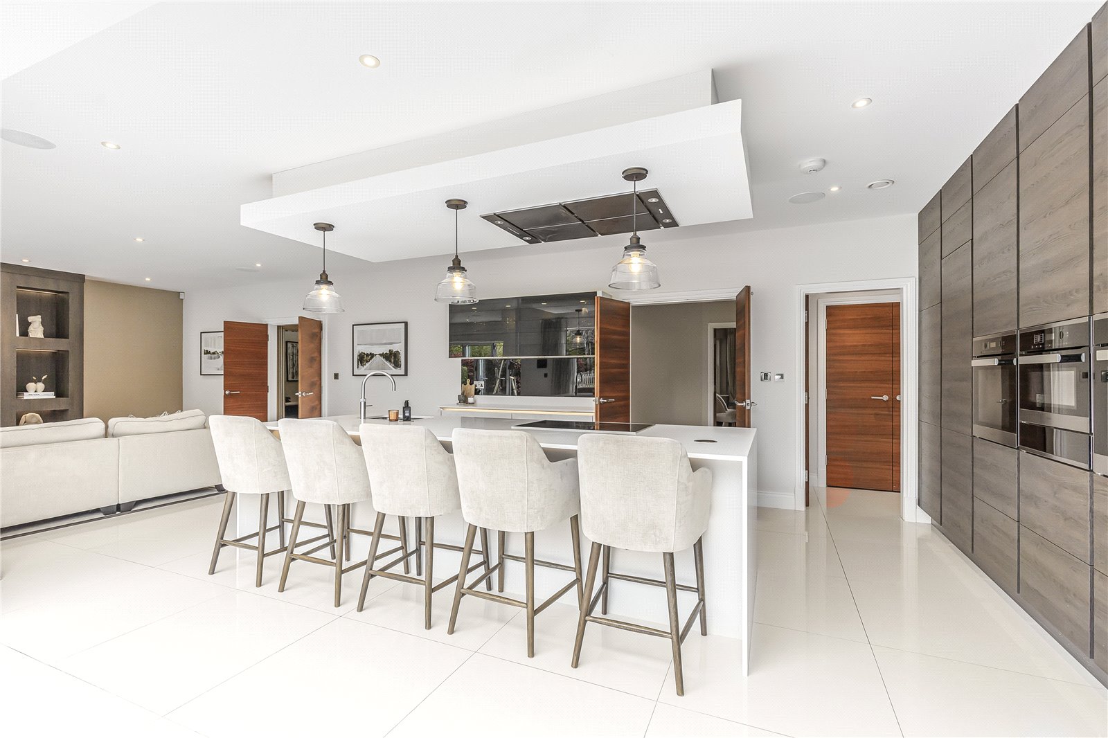 - Entertainer’s kitchen featuring Quooker boiling water tap, Miele induction hob & dishwasher, three ovens, warming drawer, sensor lit cabinets and central island with breakfast bar seating for five