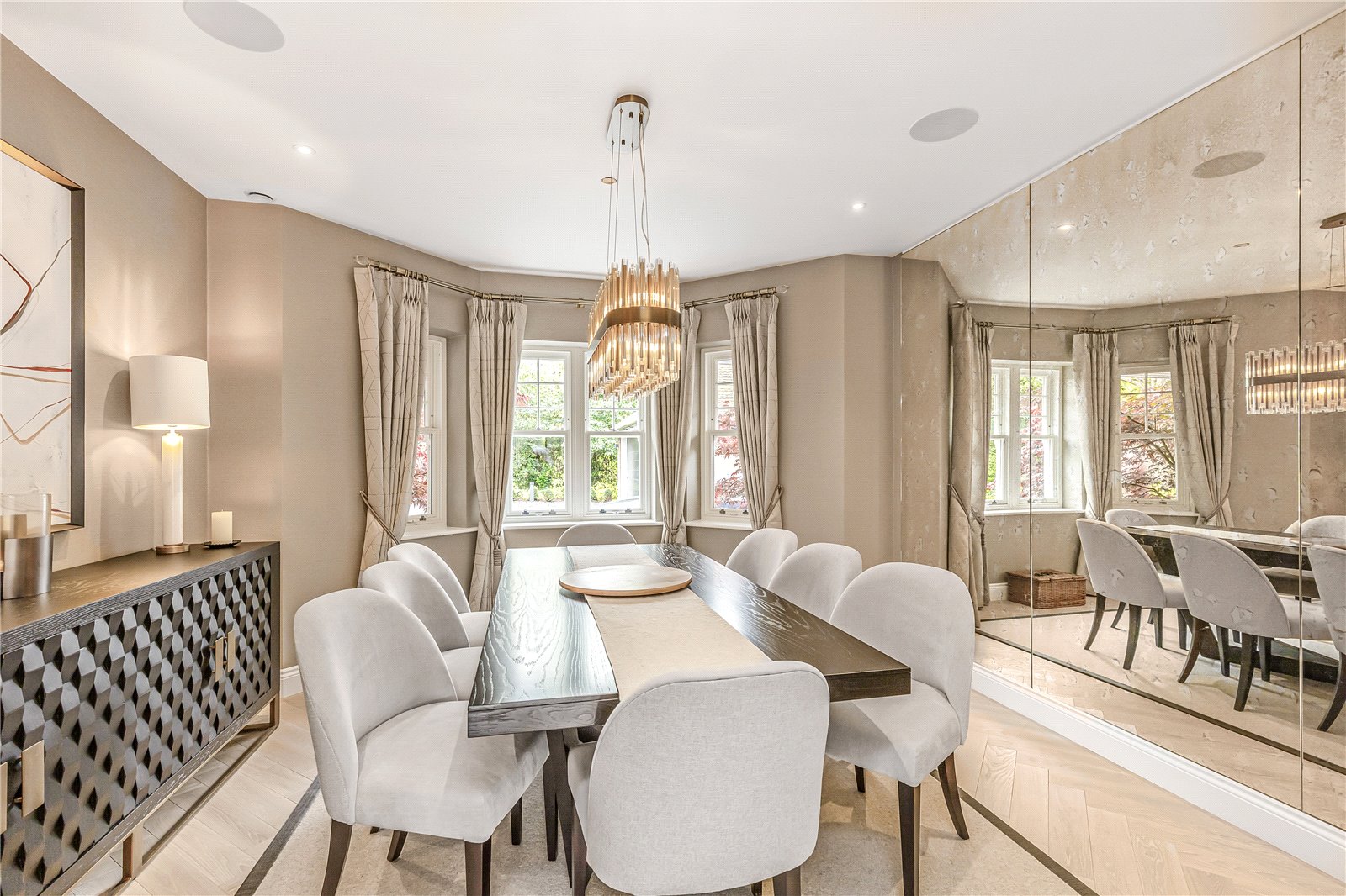 The home flows into a sequence of well-proportioned reception rooms, including a formal living room and a striking dining area enhanced by an antique mirrored wall, which adds depth and a refined sense of glamour.