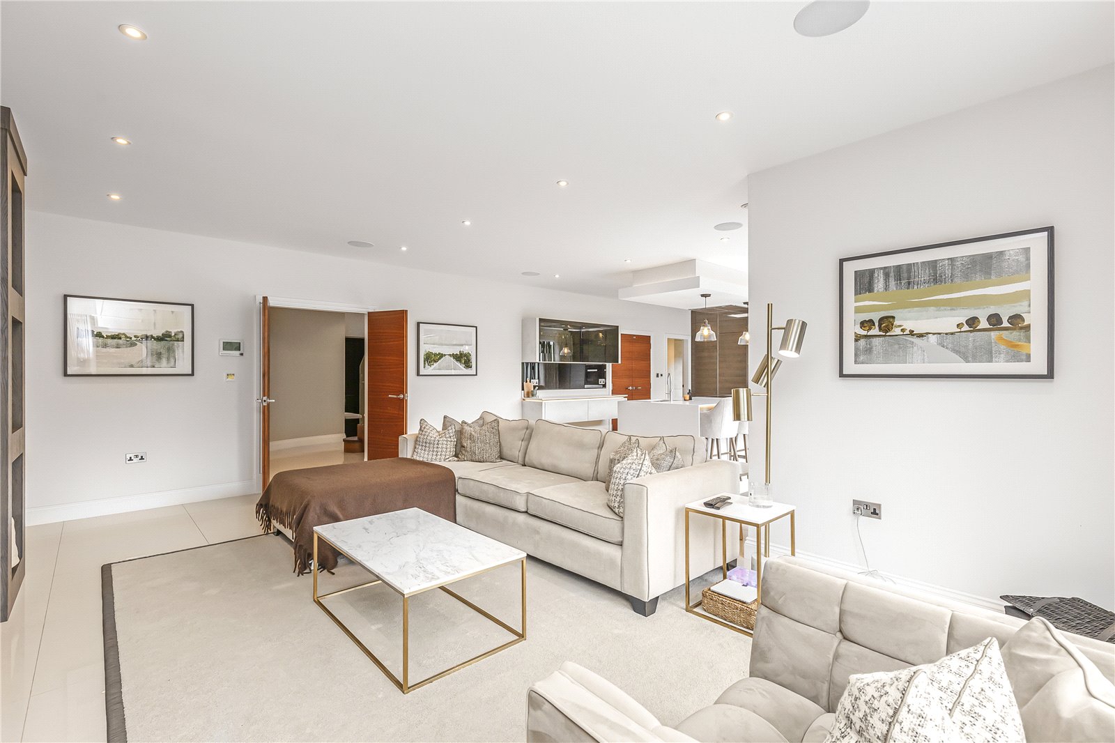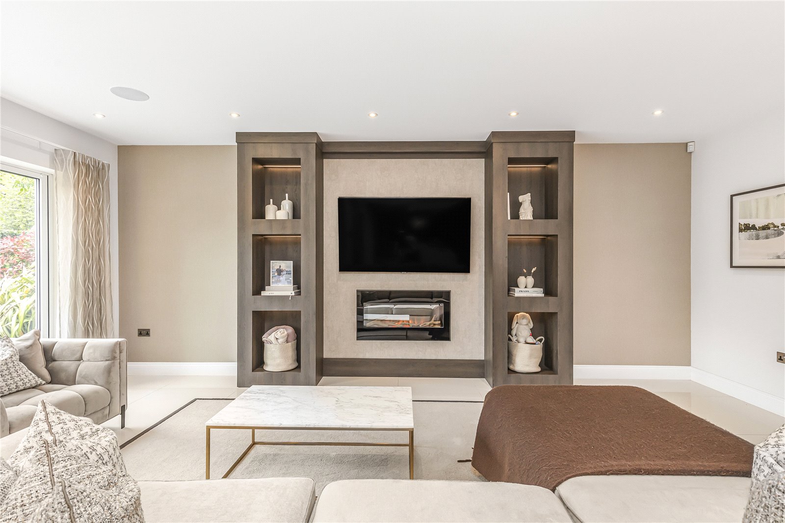 Natural light floods the space through a wall of full-height bi-folding doors that open directly onto the landscaped garden. The adjacent seating area is equally impressive — designed for relaxed living, it features a bespoke media wall with a contemporary electric fireplace and an additional set of bi-folding doors leading out to the garden, creating an effortless flow between inside and out. This entire space truly serves as the social heart of the home.