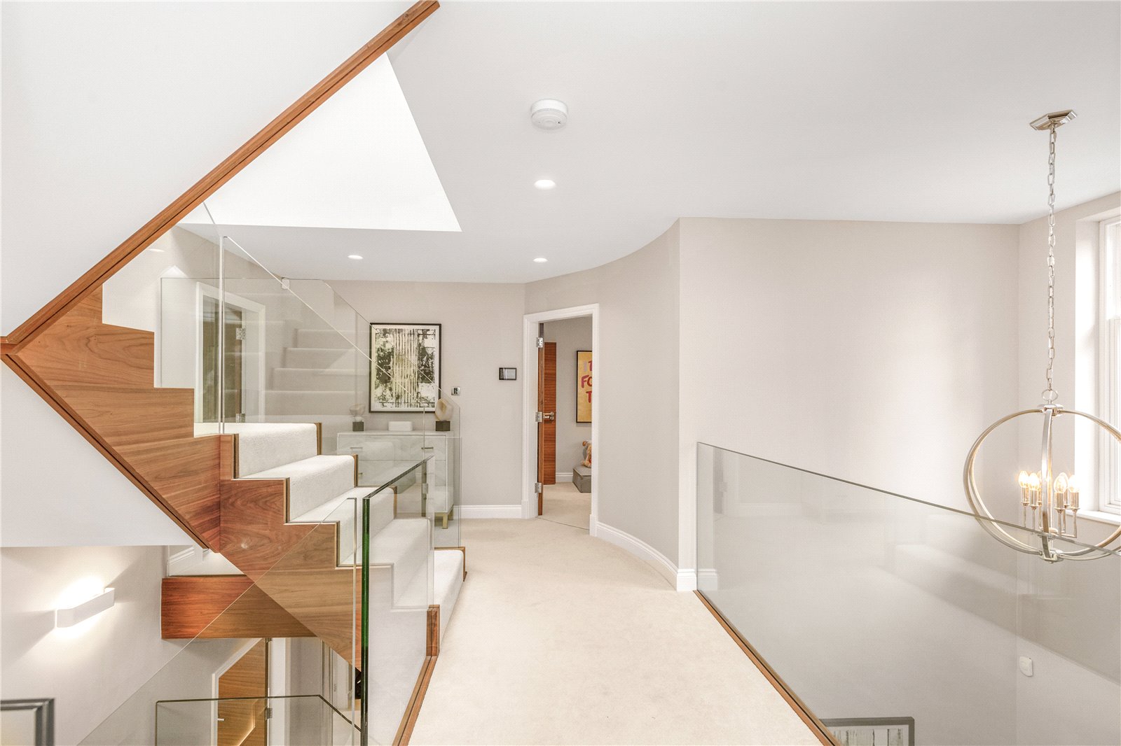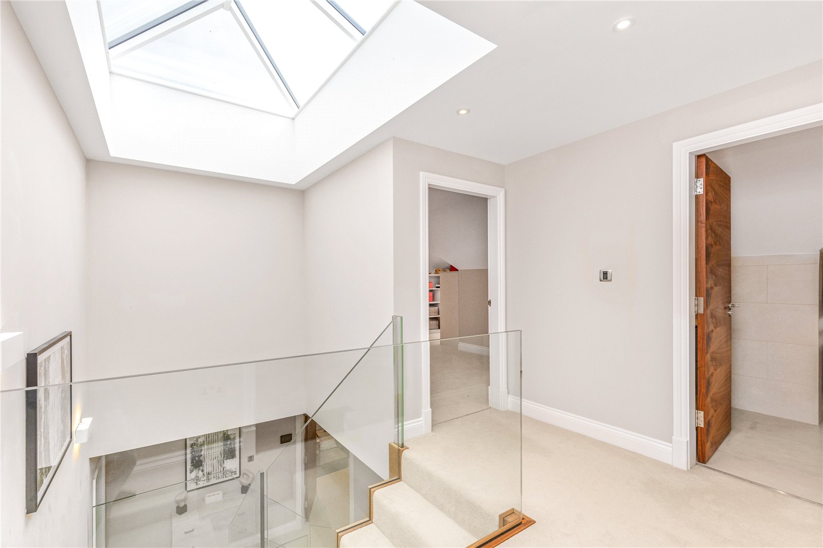 Rising to the second floor, a full sky lantern bathes the landing in natural light, leading to two additional double bedrooms — one with extensive built-in dressing room storage, the other with double wardrobes. These rooms share a luxurious bathroom with separate bath and shower, making the space ideal for guests, teenagers, or additional reception use.