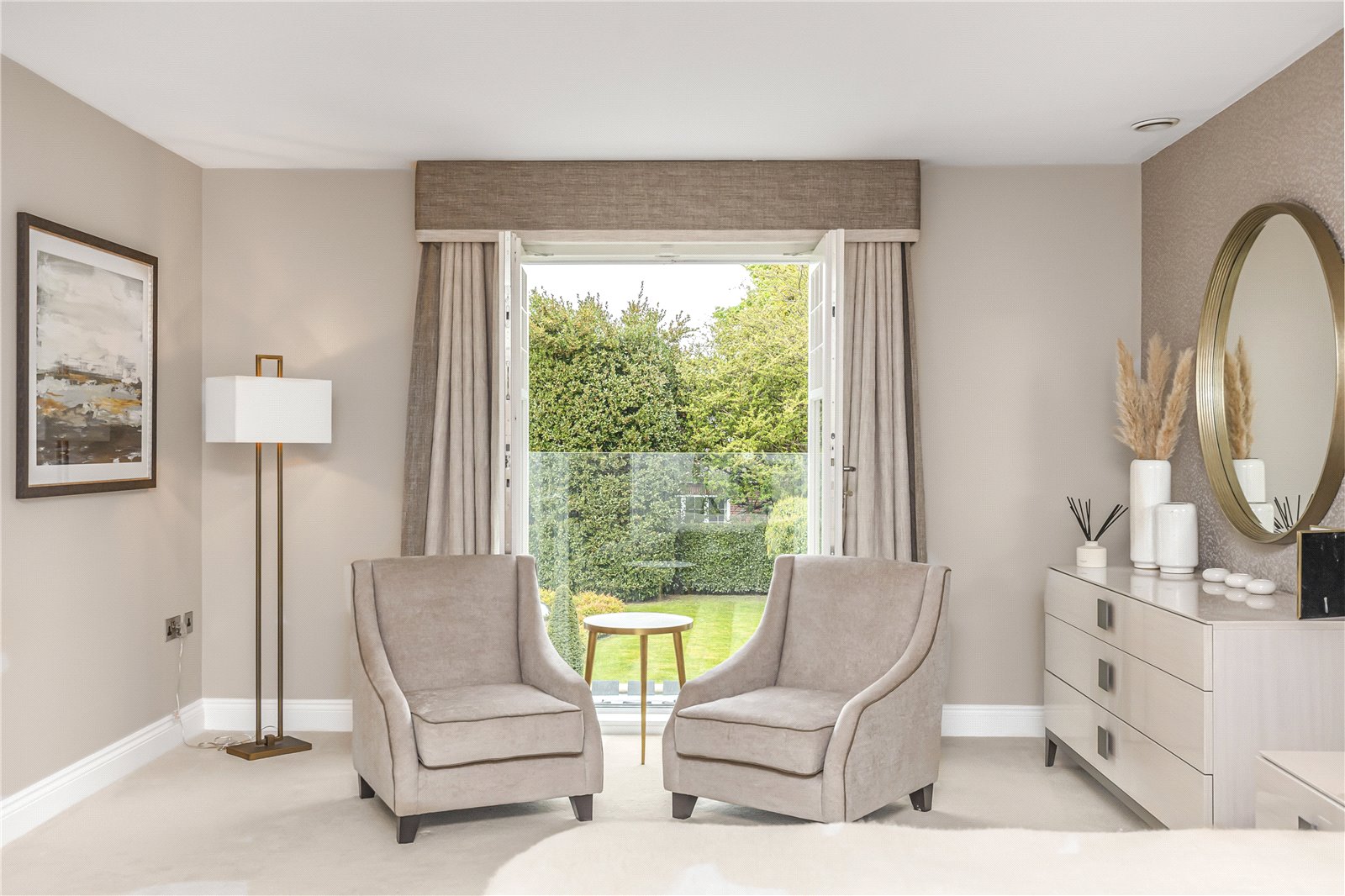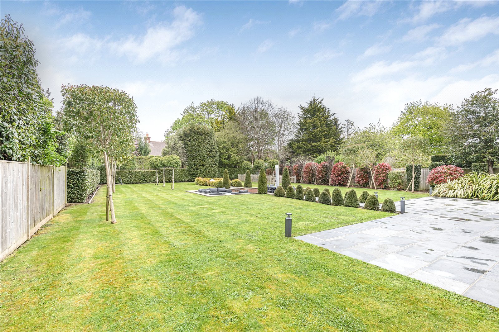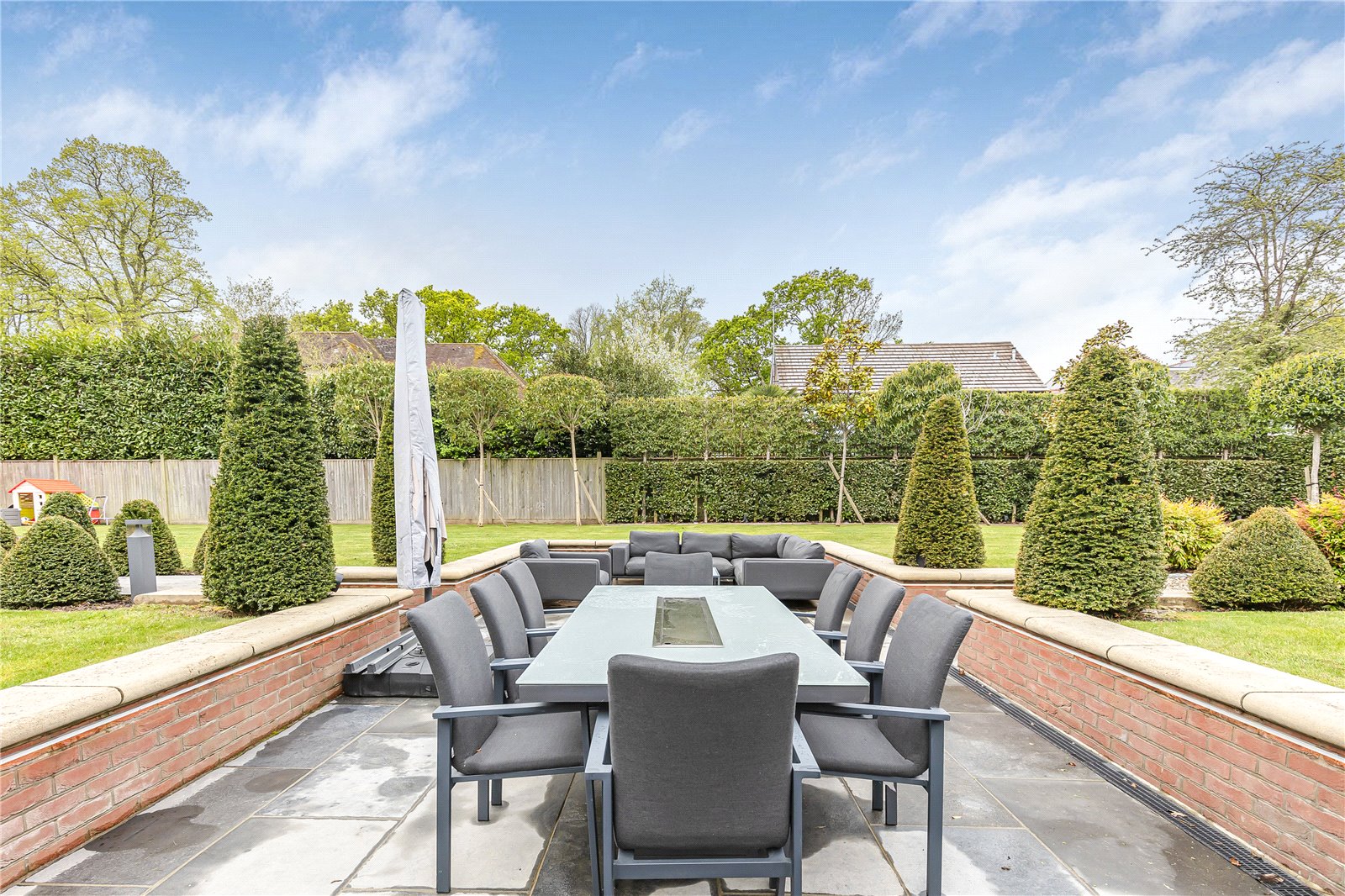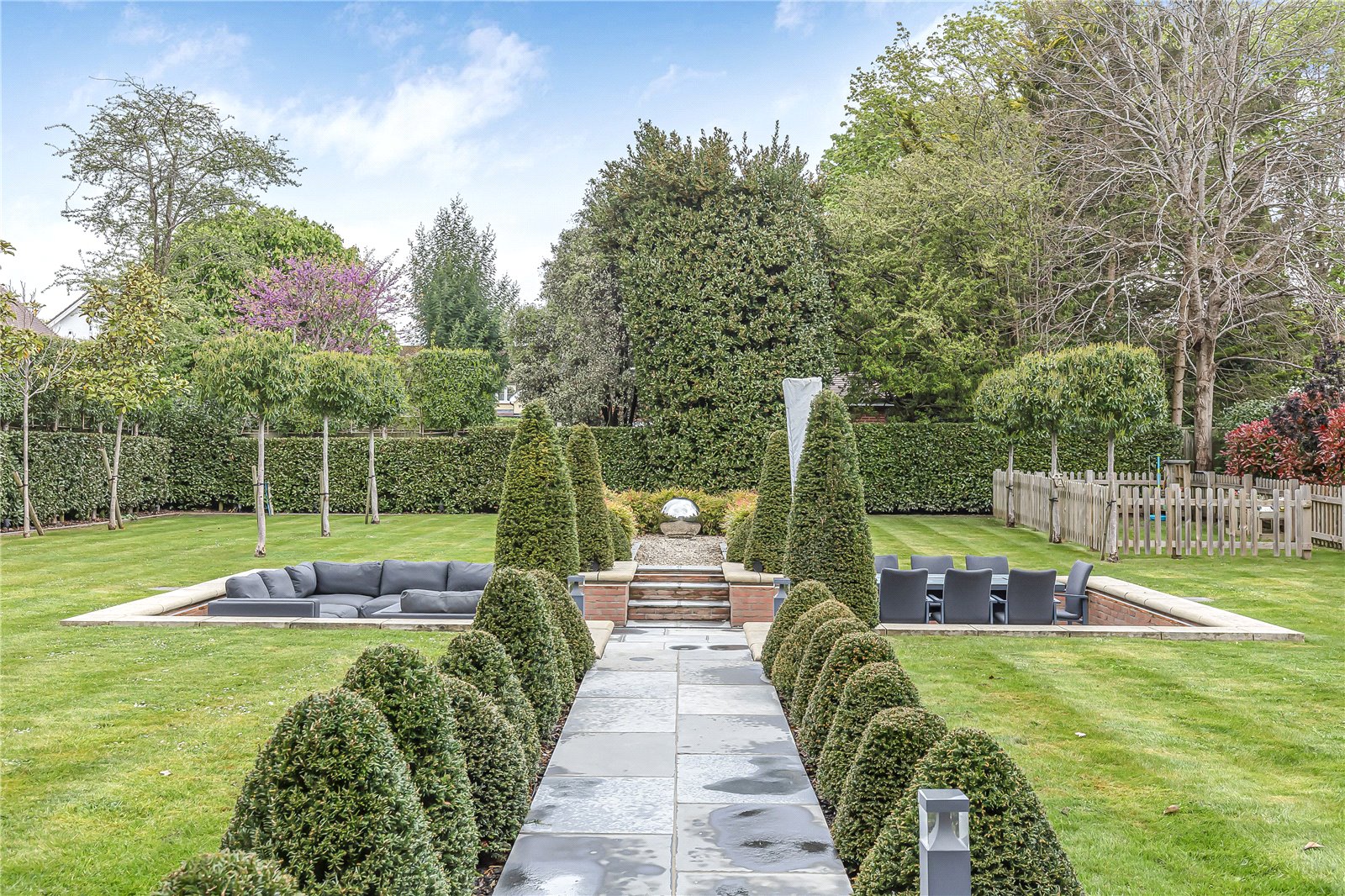 Outside, the rear garden has been thoughtfully landscaped with symmetry and structure, offering a peaceful haven for entertaining and relaxing alike. An expansive stone terrace is ideal for al fresco dining, while a central pathway lined with mature planting leads to a stunning sunken seating area, a unique and elegant feature. The garden is framed by mature trees and shrubs for complete privacy and tranquillity.