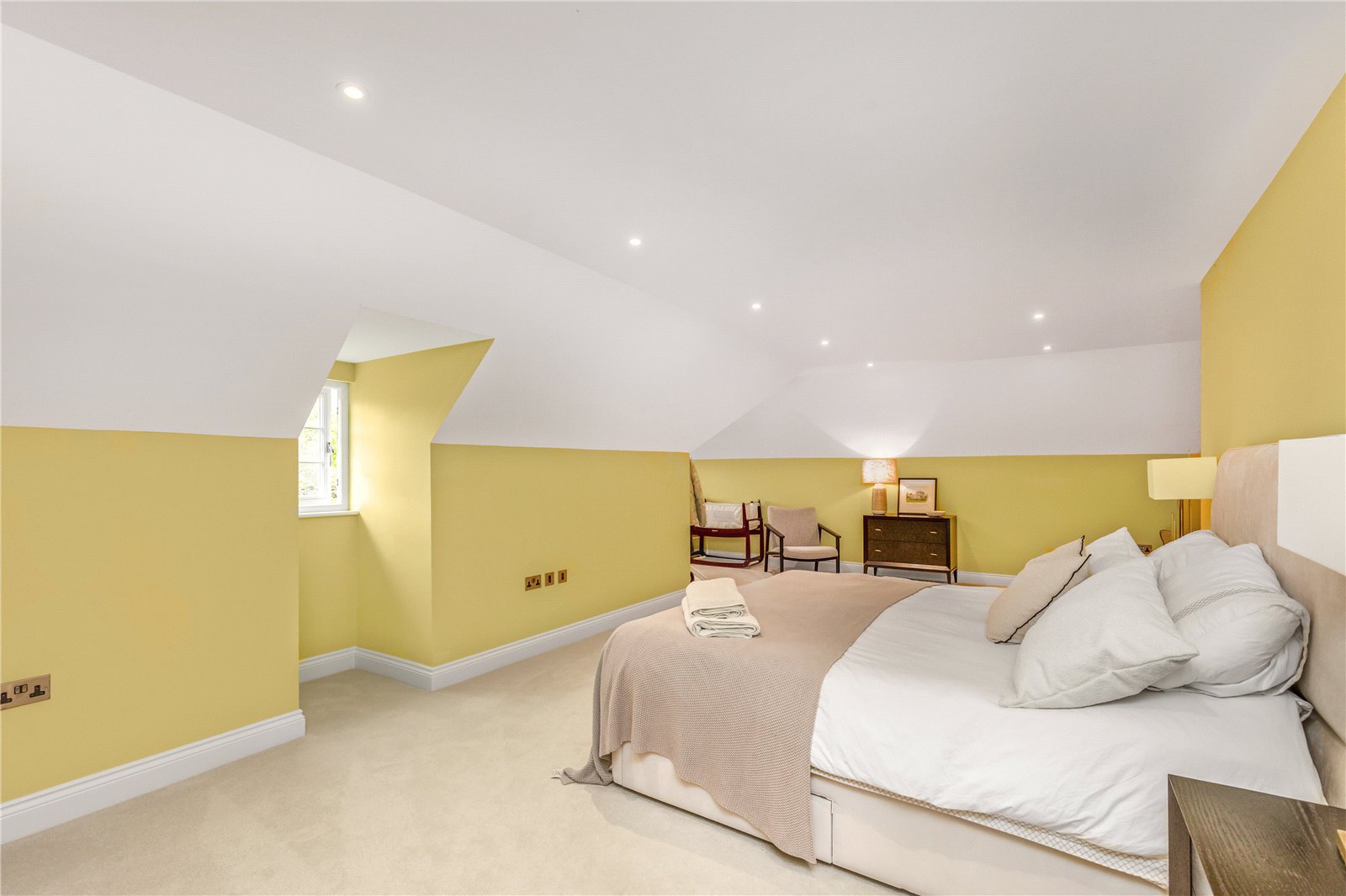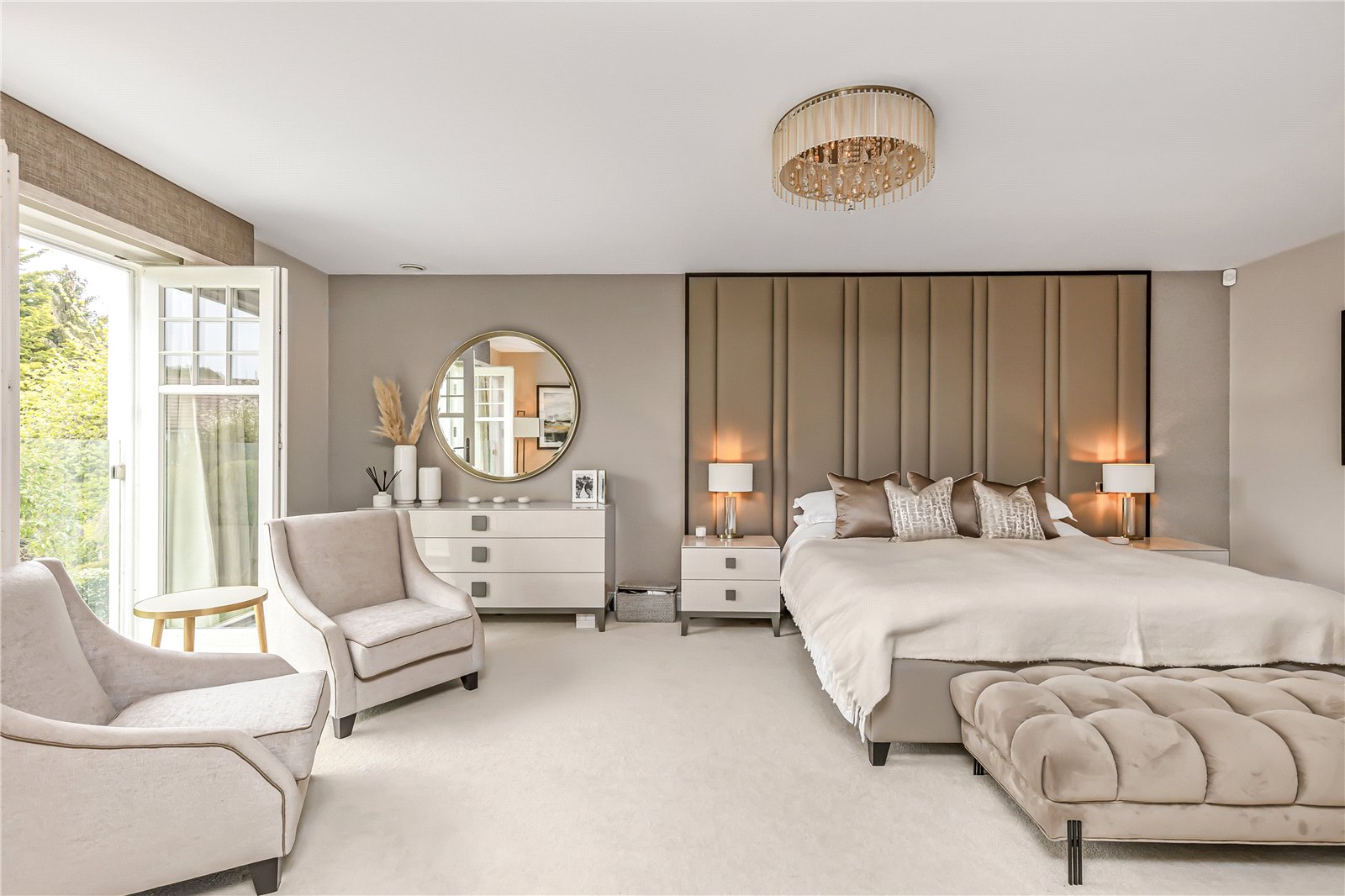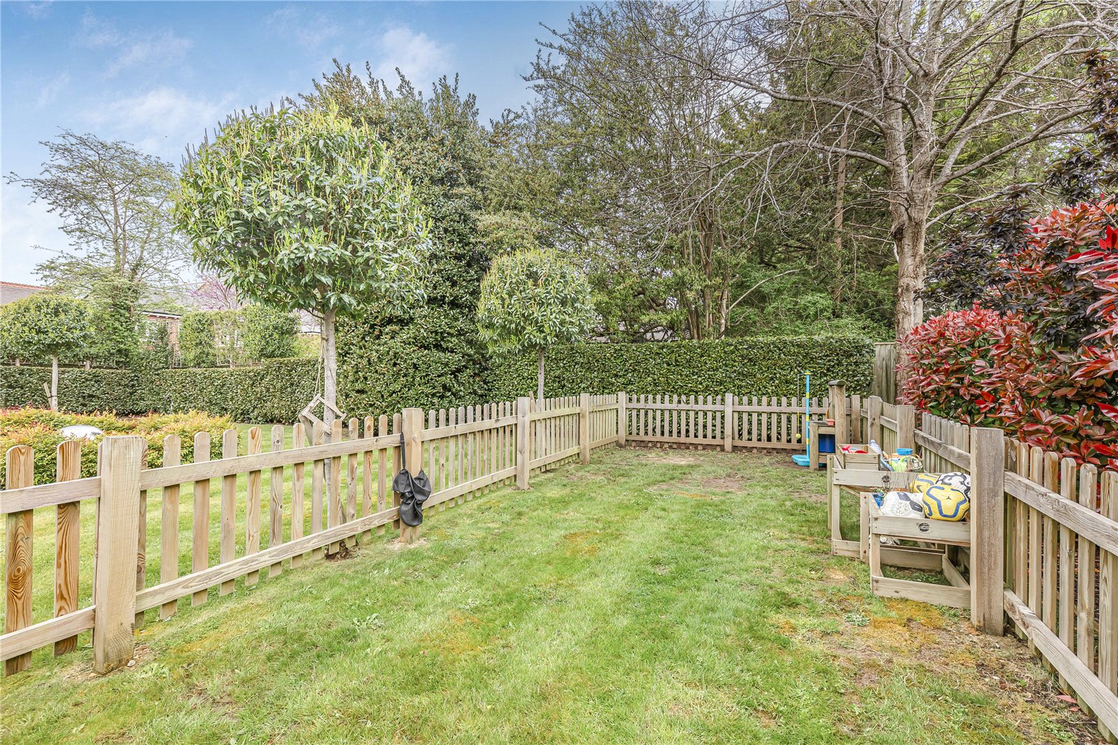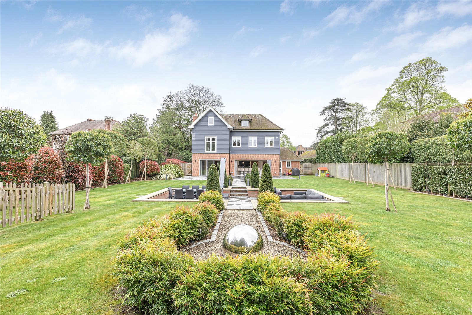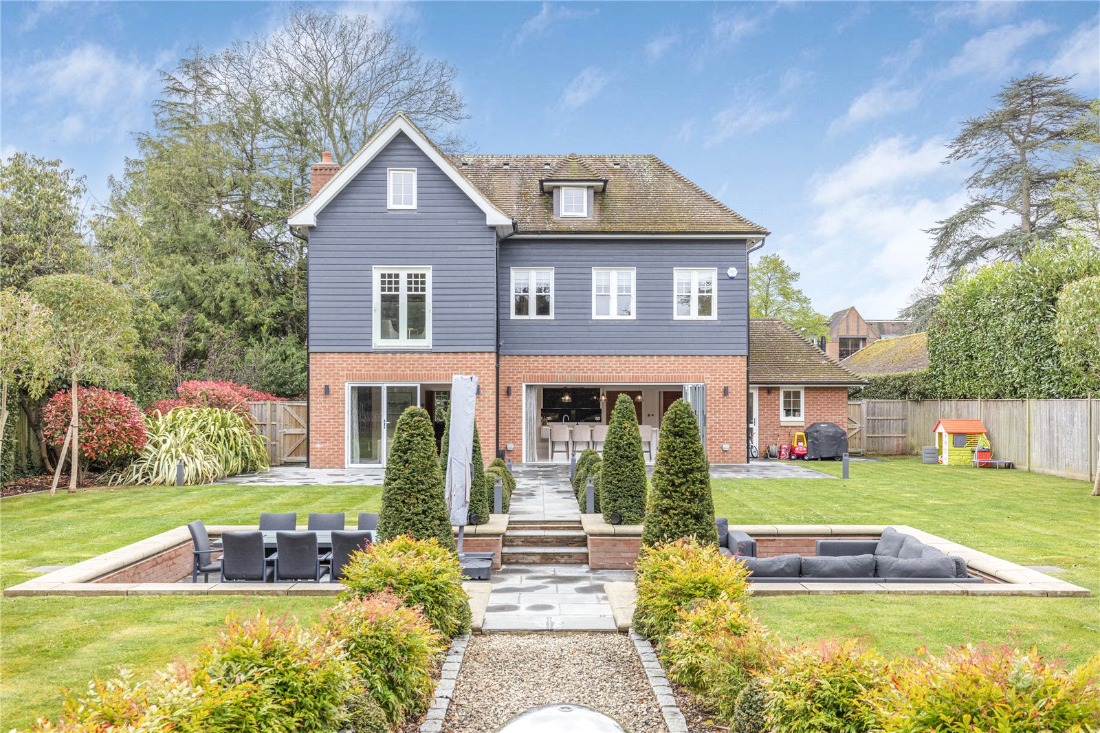 Outside, the rear garden has been thoughtfully landscaped with symmetry and structure, offering a peaceful haven for entertaining and relaxing alike. An expansive stone terrace is ideal for al fresco dining, while a central pathway lined with mature planting leads to a stunning sunken seating area, a unique and elegant feature. The garden is framed by mature trees and shrubs for complete privacy and tranquillity.