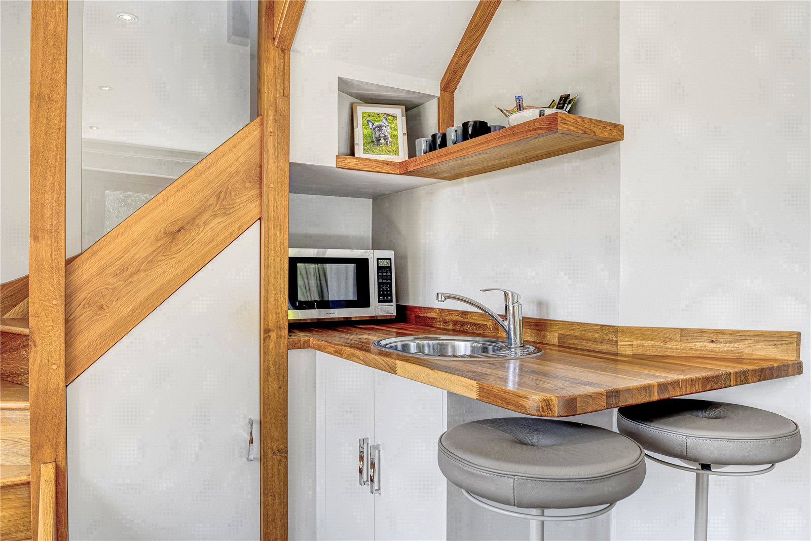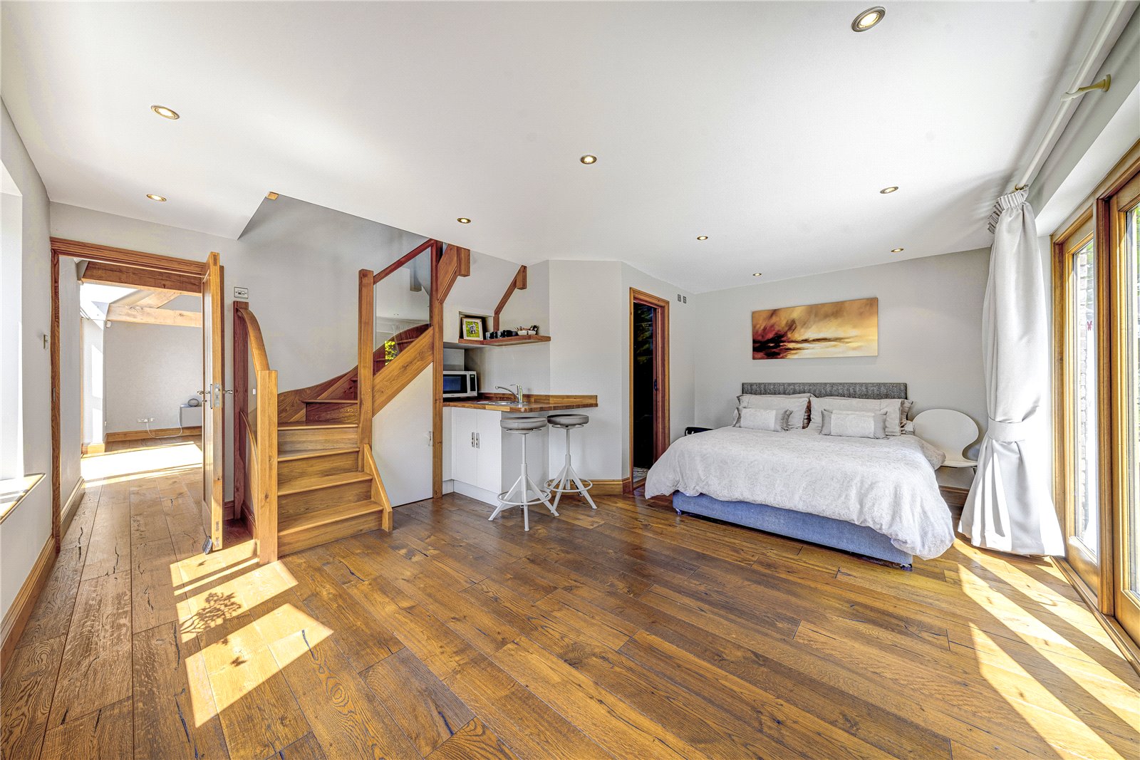 In addition to the main living areas, the property includes a practical office, a cloakroom, and a utility room. A well-proportioned guest suite/annexe further enhances the home’s versatility, offering potential as an Airbnb or a self-contained retreat for visiting guests. This suite, which can be securely locked off from the main house, features its own garden access, an ensuite bathroom, a kitchenette, and a second-floor space for added convenience and privacy.