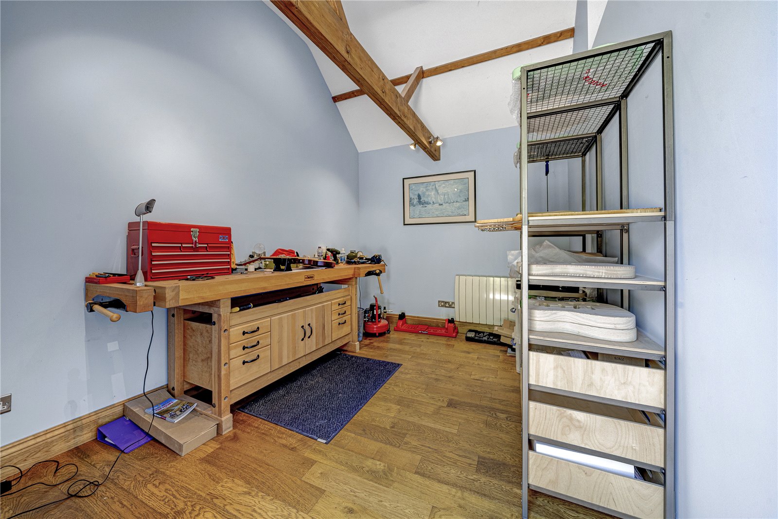 On the ground floor, accessed from the kitchen is the home gym with floor-to-ceiling mirrors. Also located in this area is the sauna and plant room housing the water tank and gas boiler. The gym leads to the Cardio suite, which is in the corner of the machinery barn. This area has been sympathetically adapted to create additional workout space.