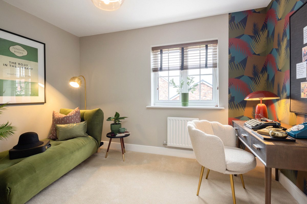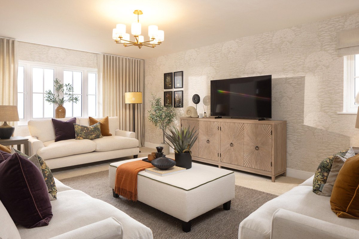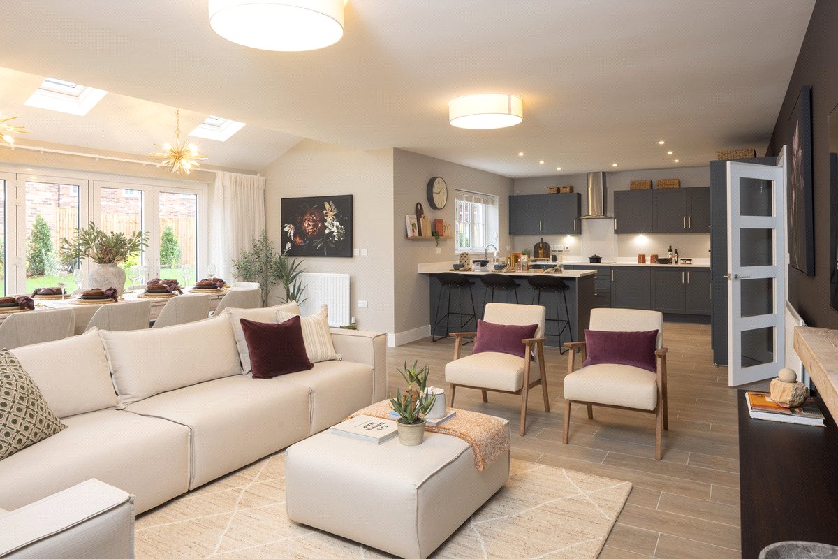 This generous five bedroom detached home features a spacious living room at the front of the property, with a superb open-plan kitchen-dining-family room at the rear, with bi-fold doors to access the garden.