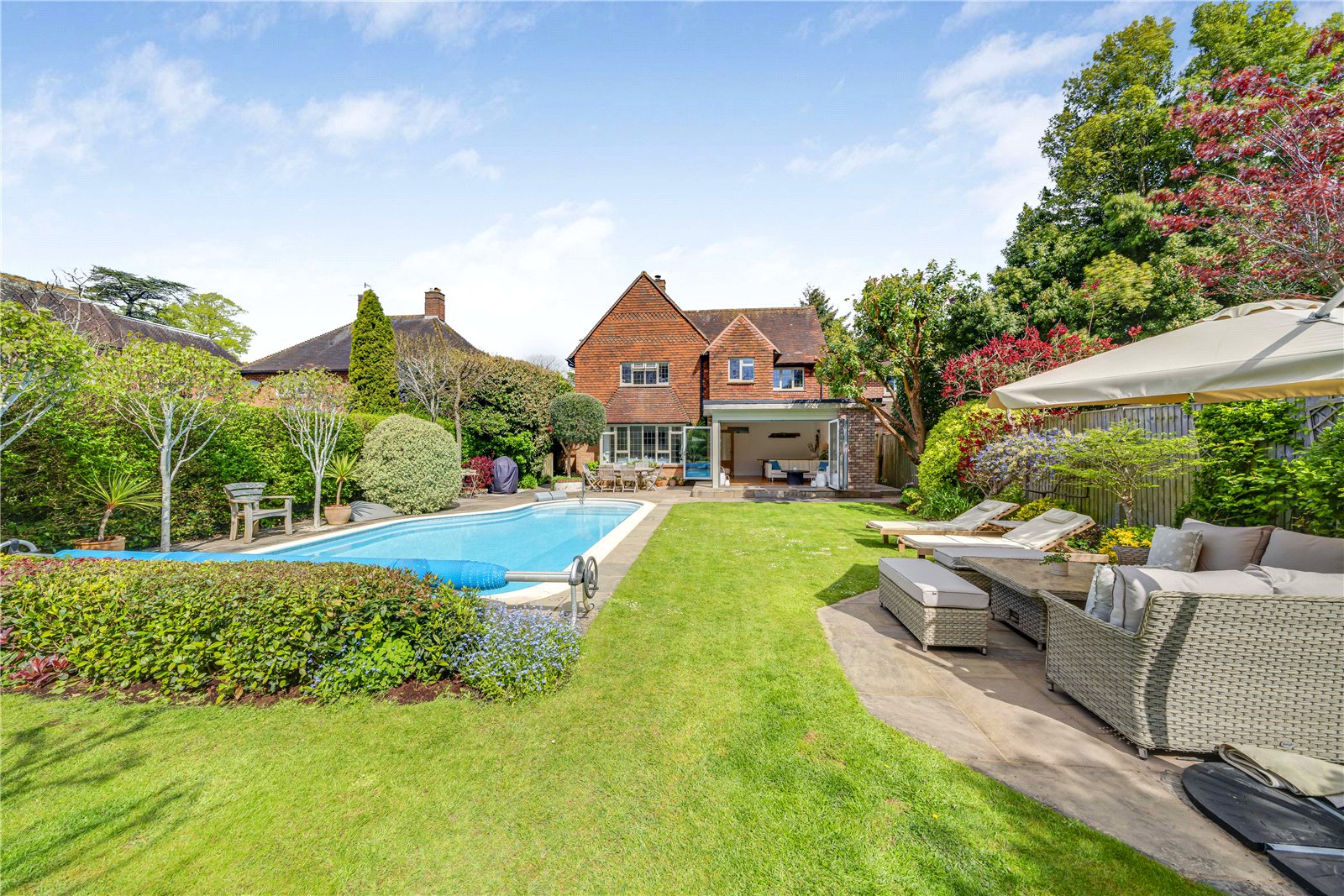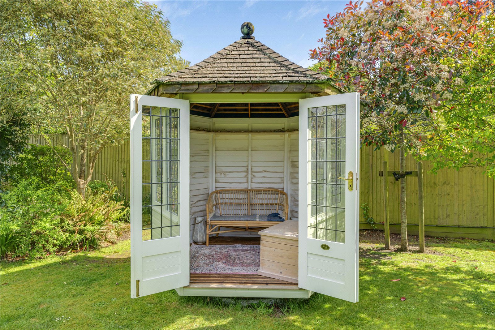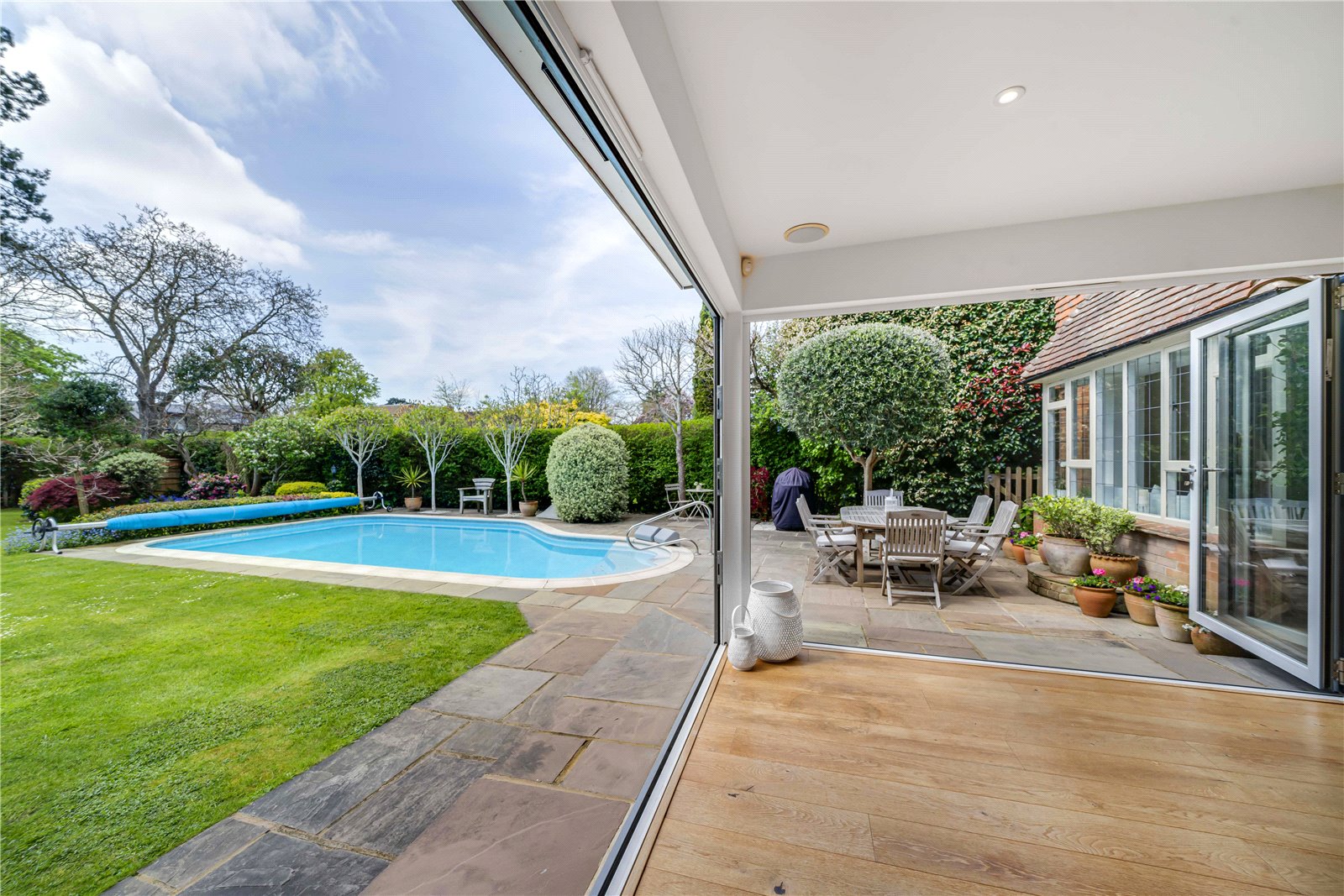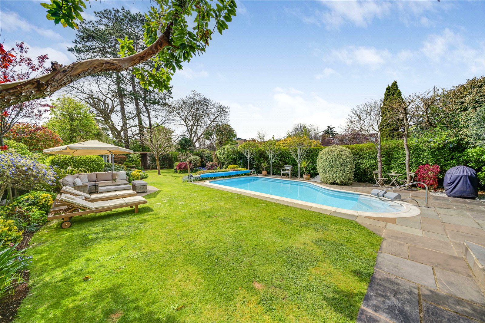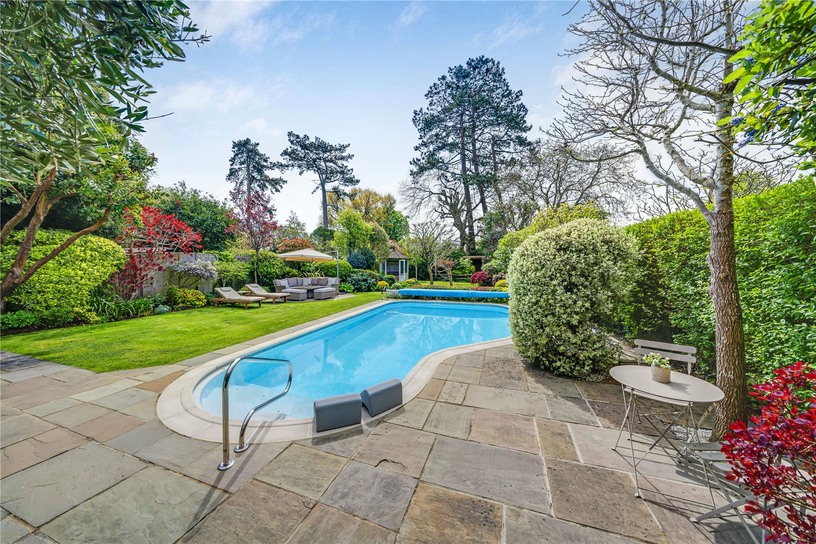 - South-facing rear garden with heated pool, Jacuzzi-style seating, lush lawns, and a revolving summerhouse.