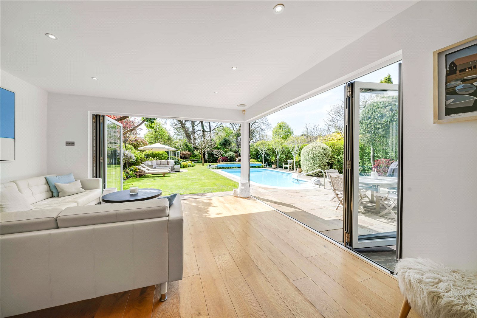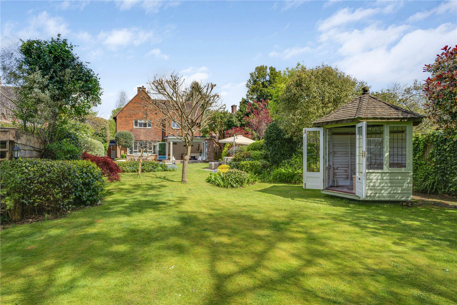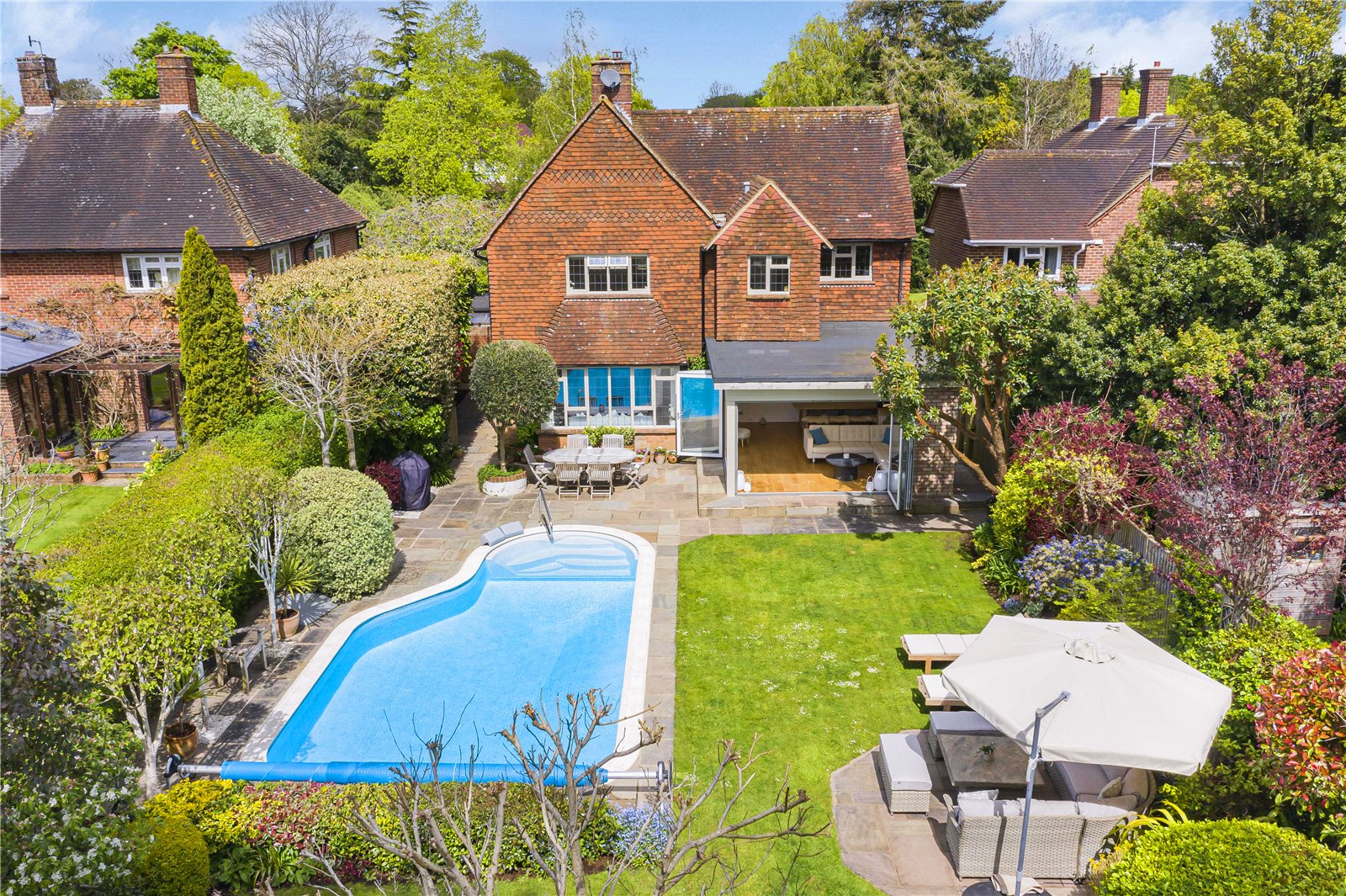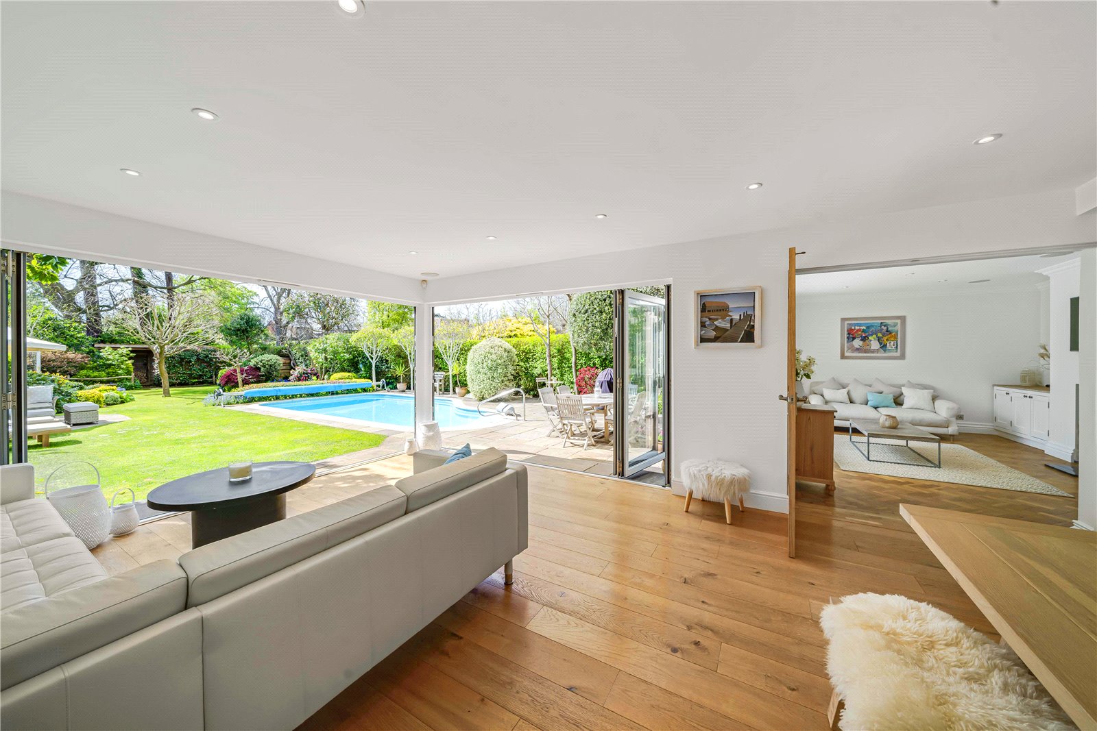 - South-facing rear garden with heated pool, Jacuzzi-style seating, lush lawns, and a revolving summerhouse.