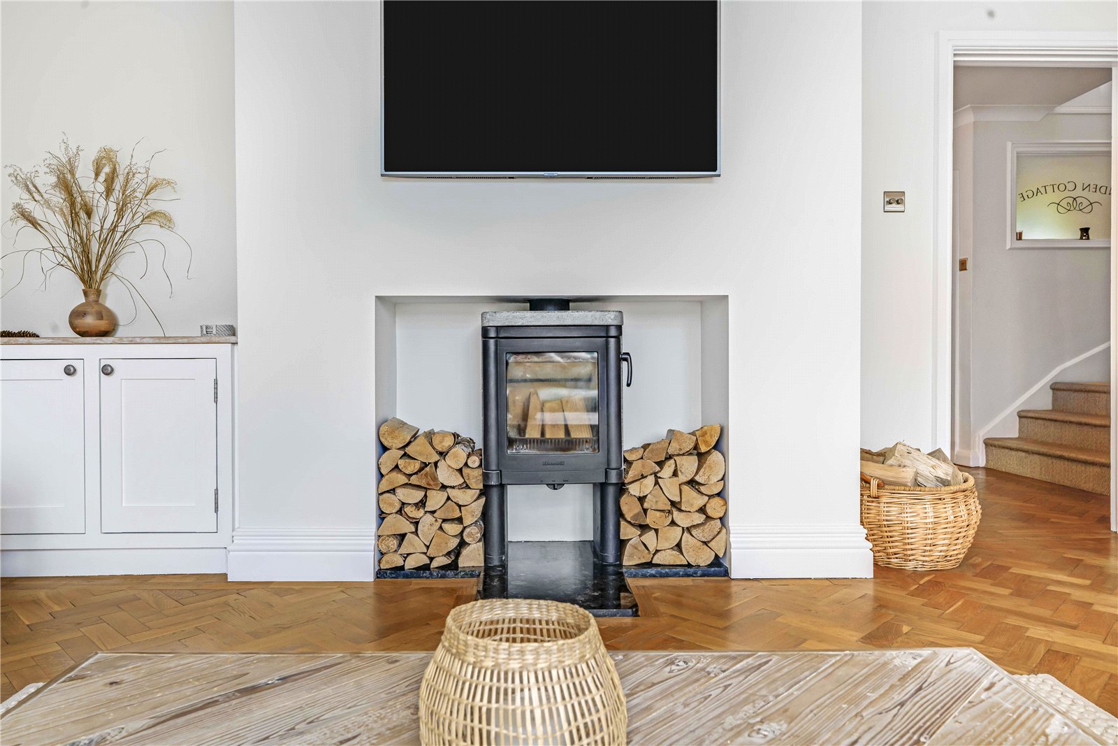 - Captivating sitting room with a contemporary wood burning stove and a sunny bay window.