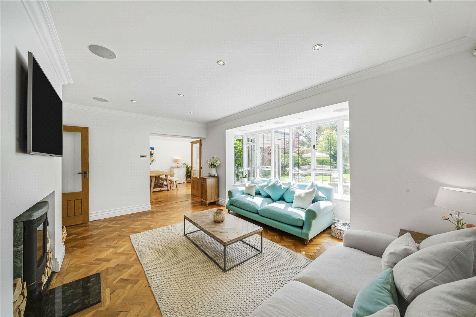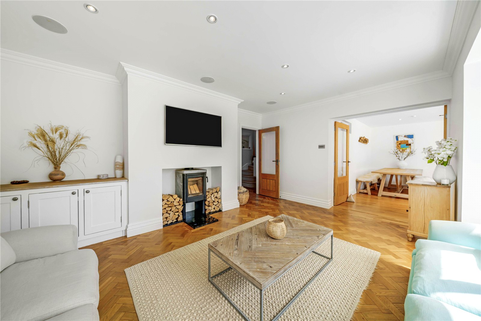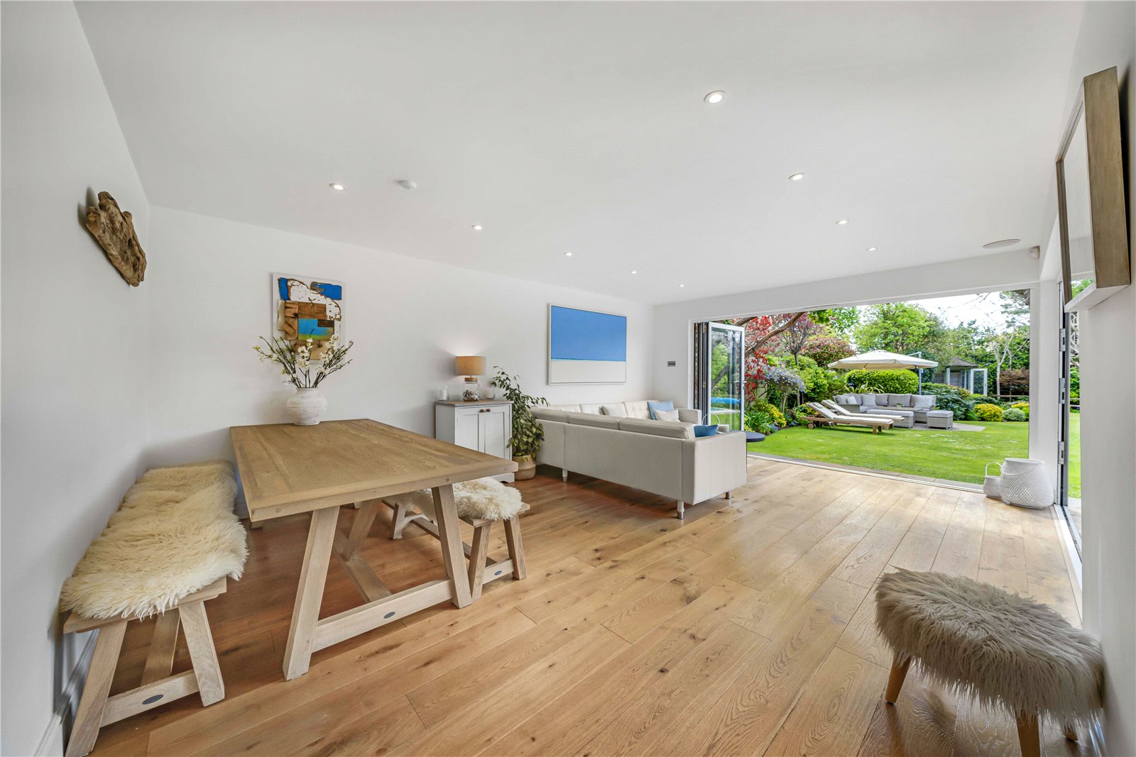 Adjacent to the sitting room, an open plan family/ dining room is bathed in sunlight, thanks to two sets of bi-folding doors that effortlessly blend indoor and outdoor living areas, creating an enchanting setting for both family gatherings and entertaining guests.