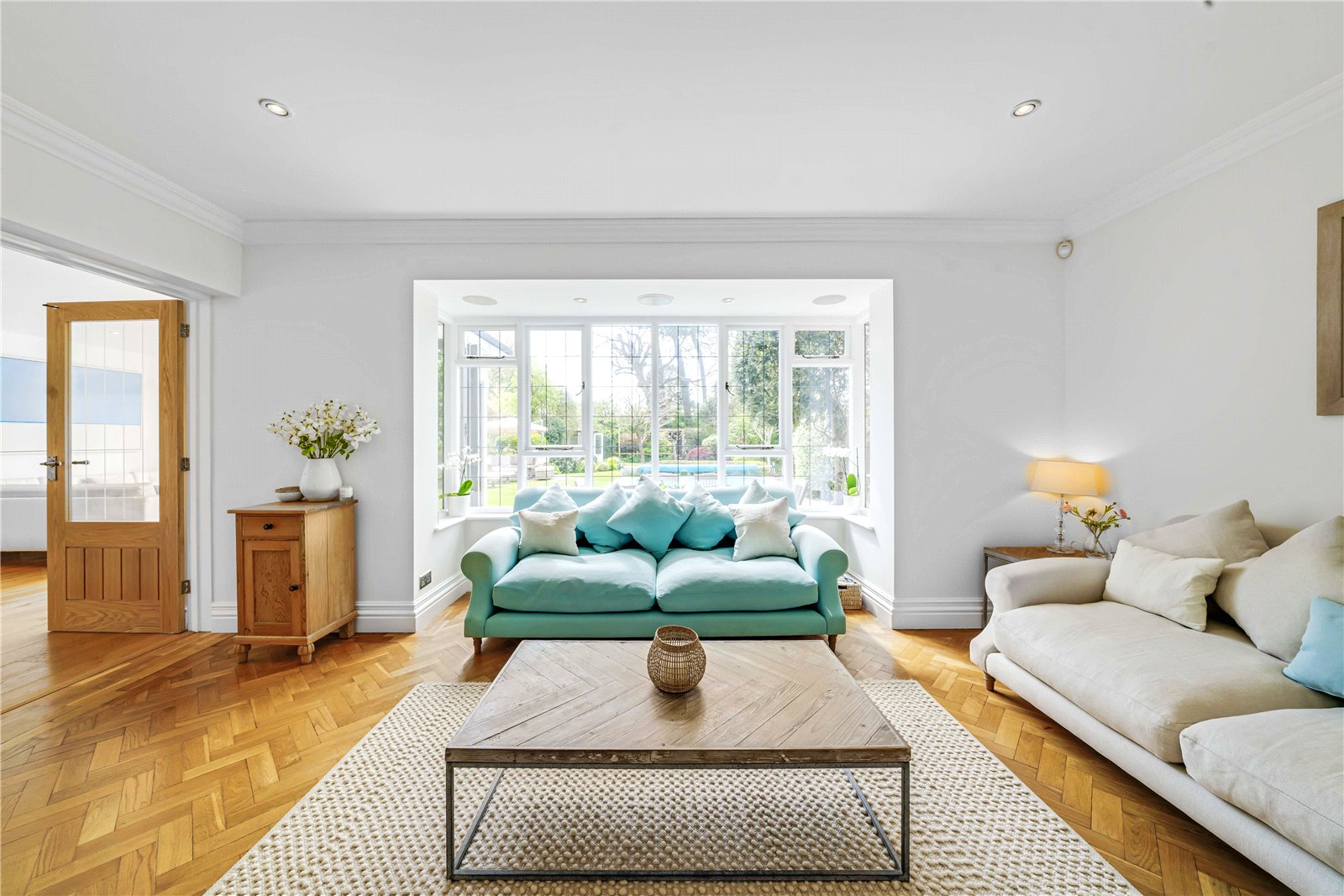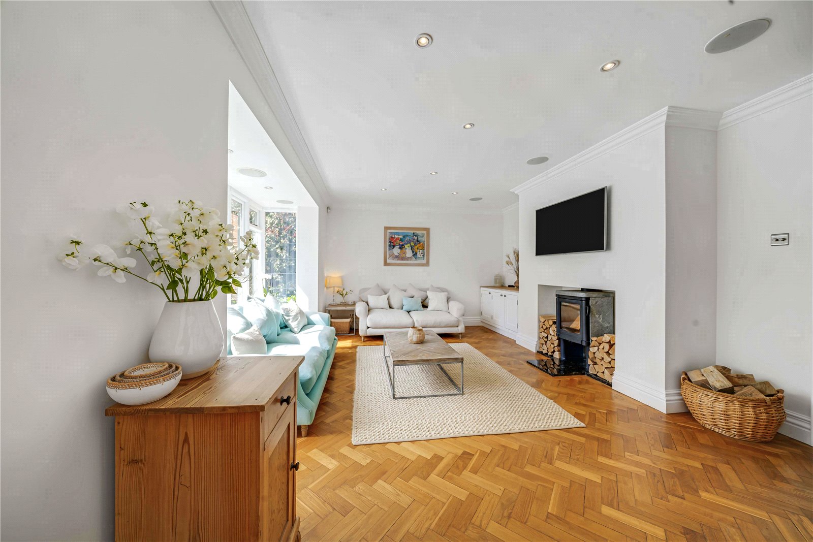As you step into the welcoming reception hall, you're greeted by parquet flooring in warm, inviting tones, seamlessly leading to the captivating sitting room. Here, a sleek, contemporary fireplace serves as a focal point, while a bay window facing south floods the space with natural light.