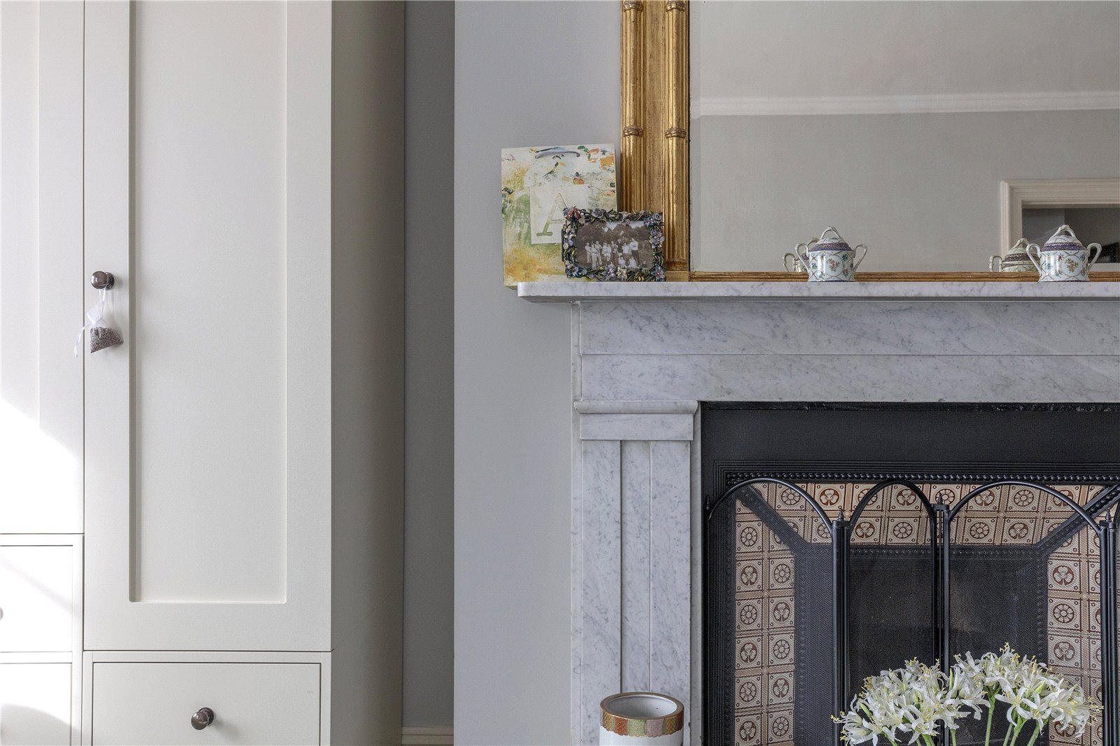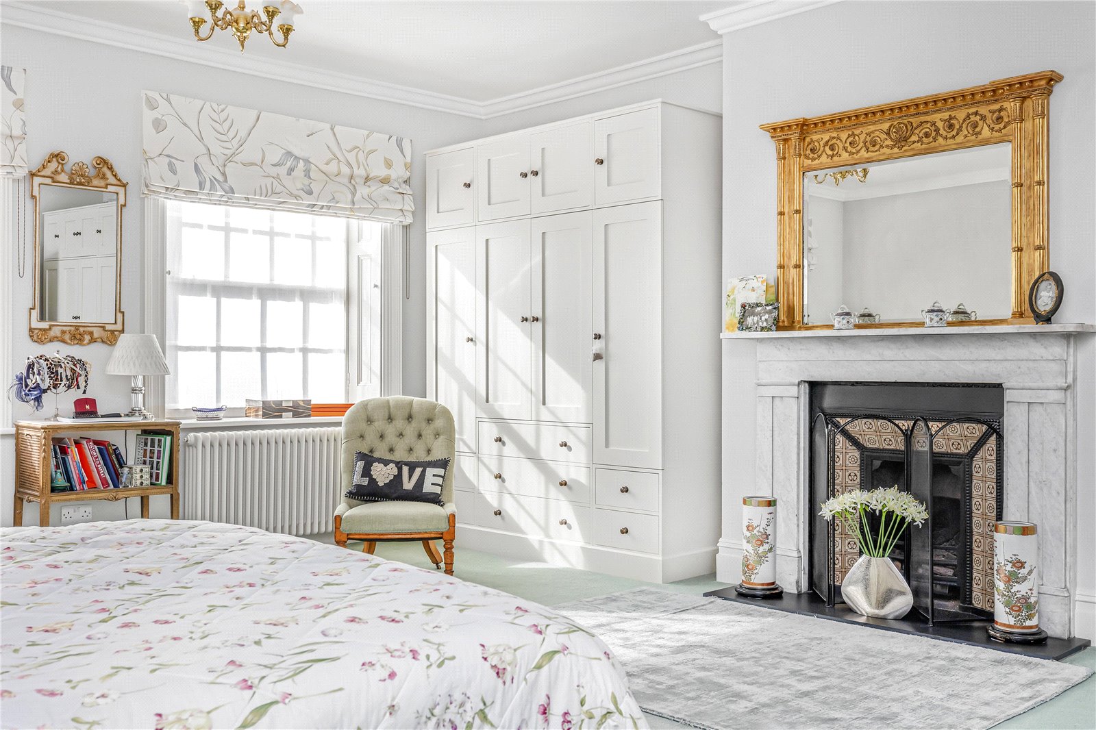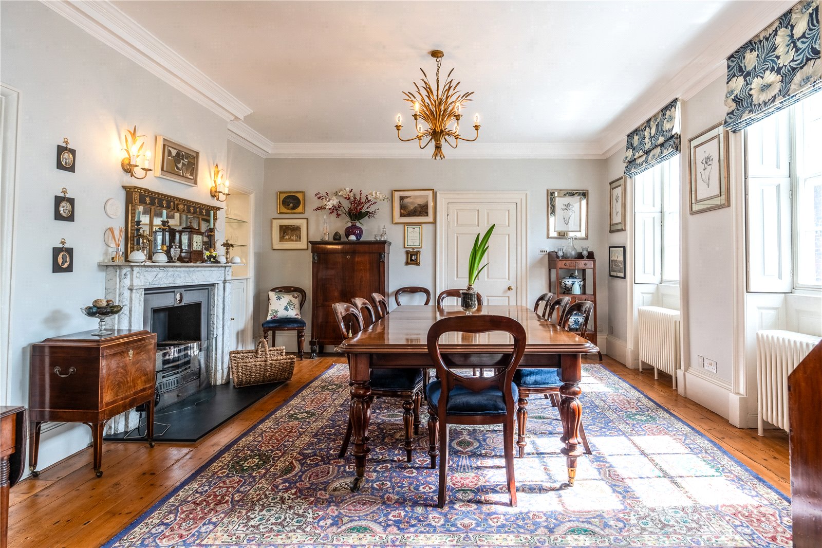 - Period features include lofty ceilings, antique fireplaces, Georgian panelling and functional shutters