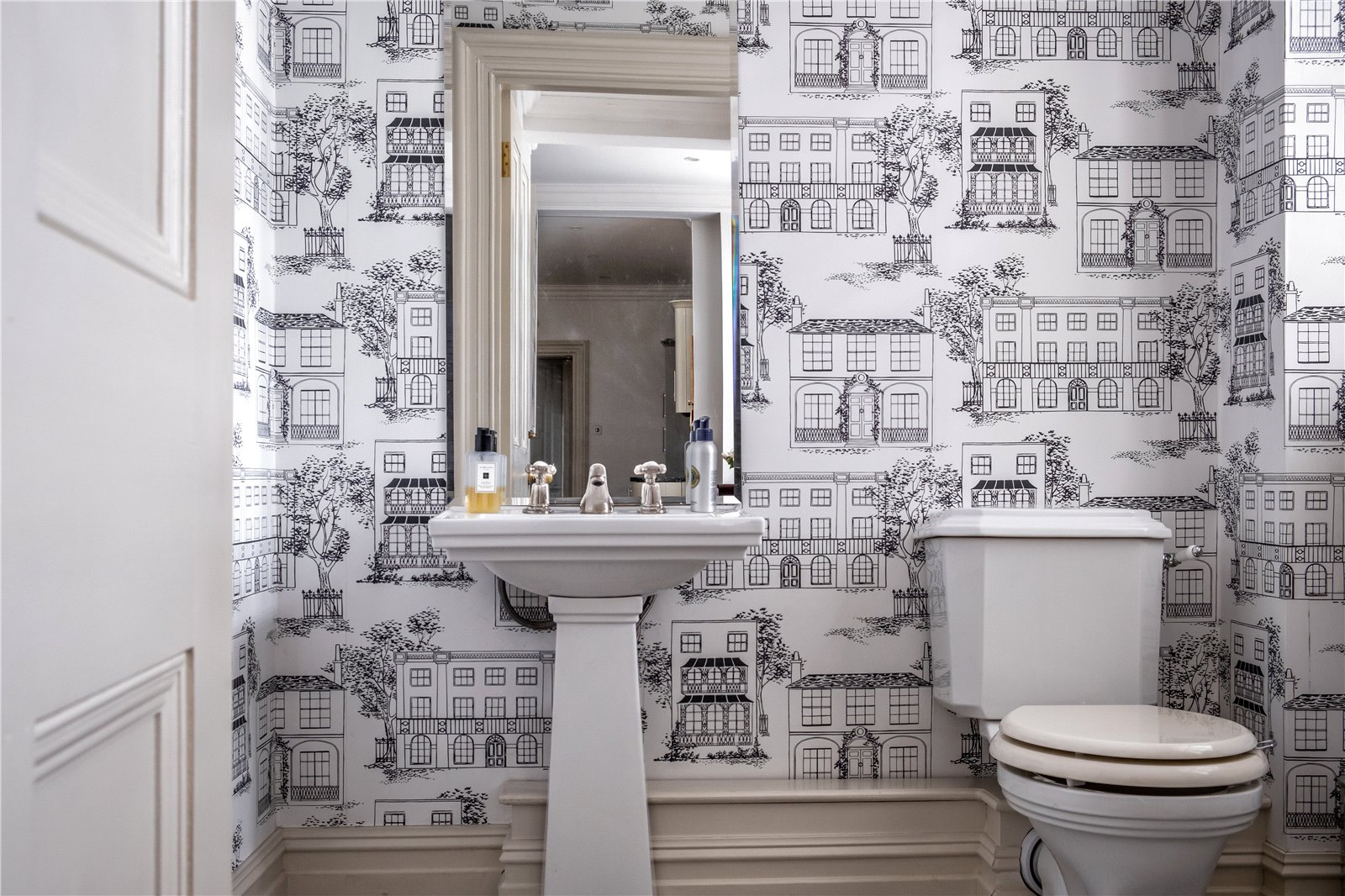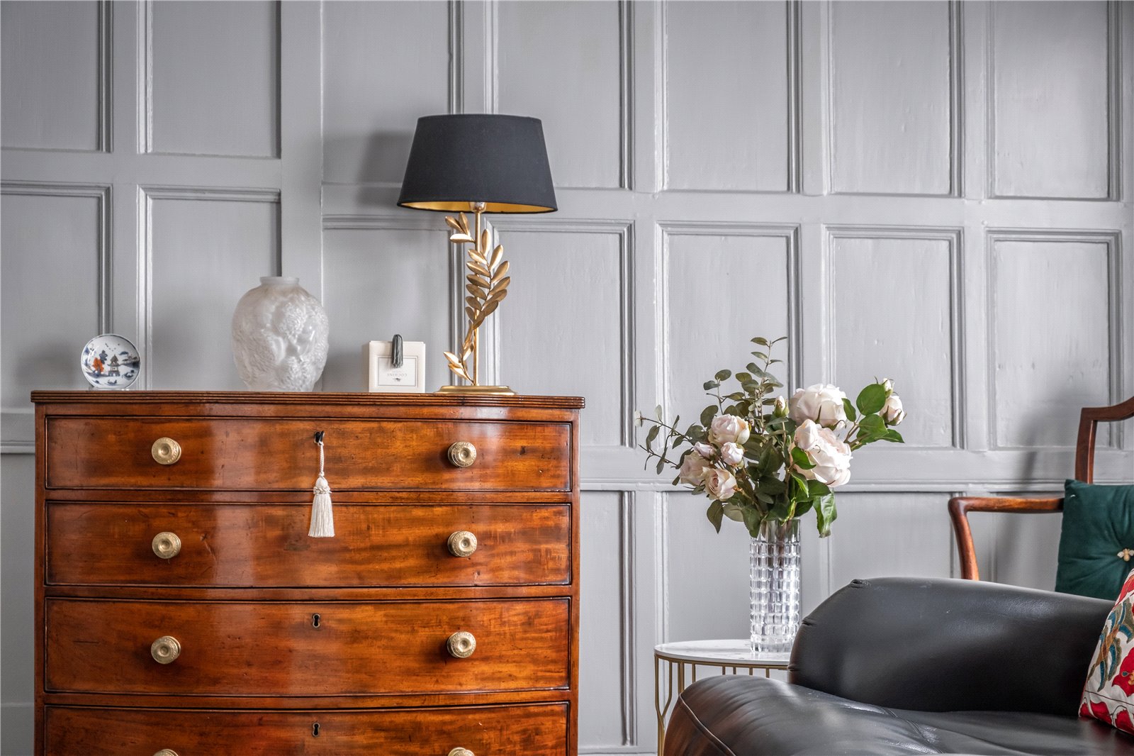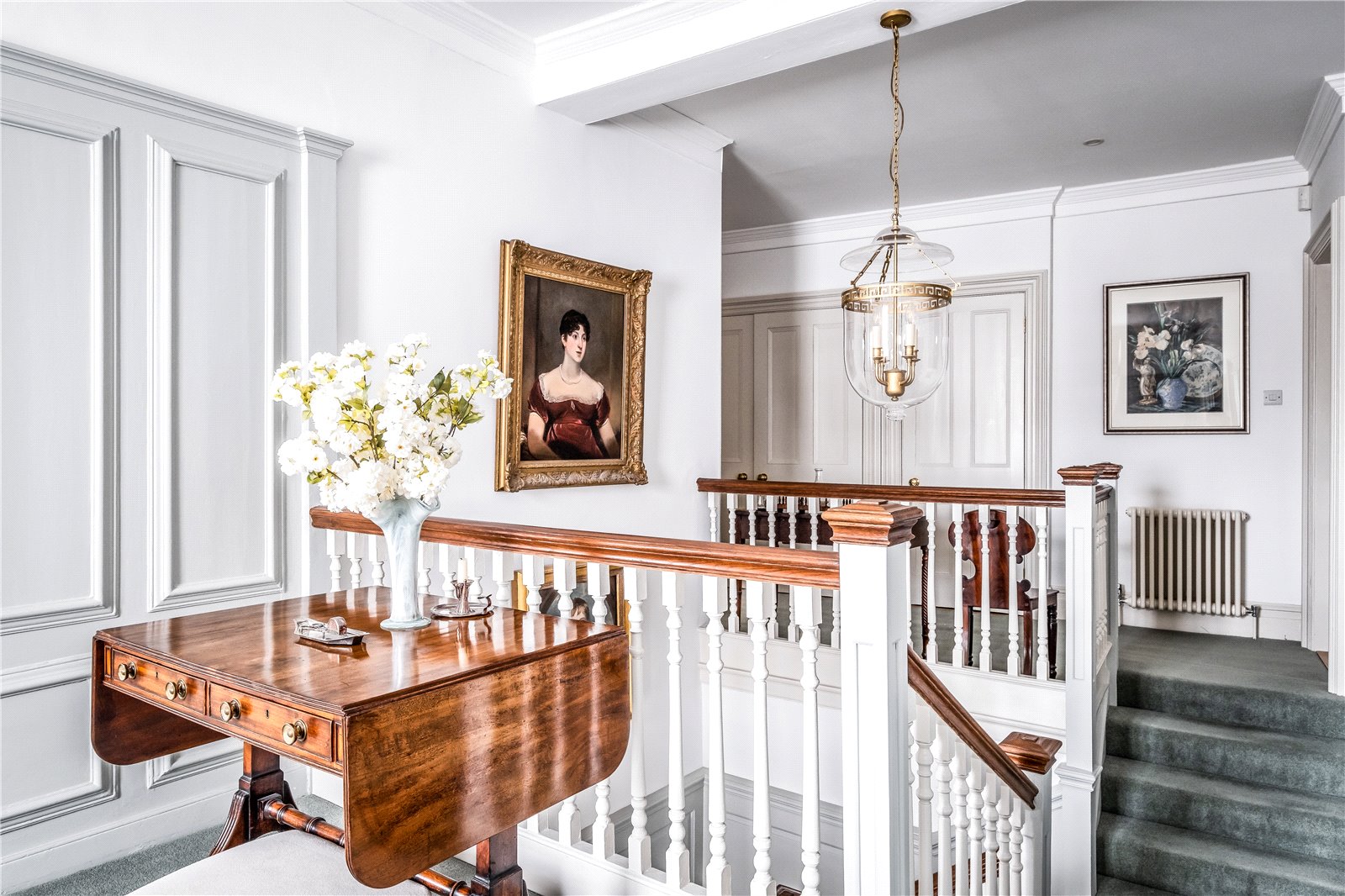 Throughout the home, period features abound, including generous room proportions, lofty ceilings, antique fireplaces, original flooring, and ornate Georgian panelling, notably showcased on the first-floor landing.