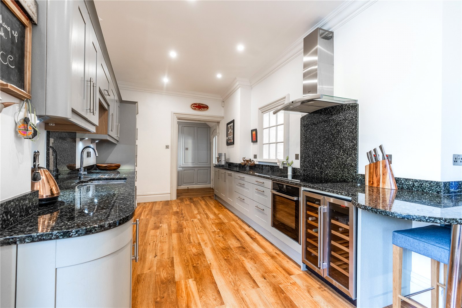 The beautifully appointed kitchen boasts bespoke designed units, polished stonework surfaces, and integrated appliances, including dishwasher, fridge, wine cooler, induction hob, and fan-assisted oven/grill. An adjacent open-plan lobby leads to a cloakroom area and a door to the superbly landscaped walled garden.