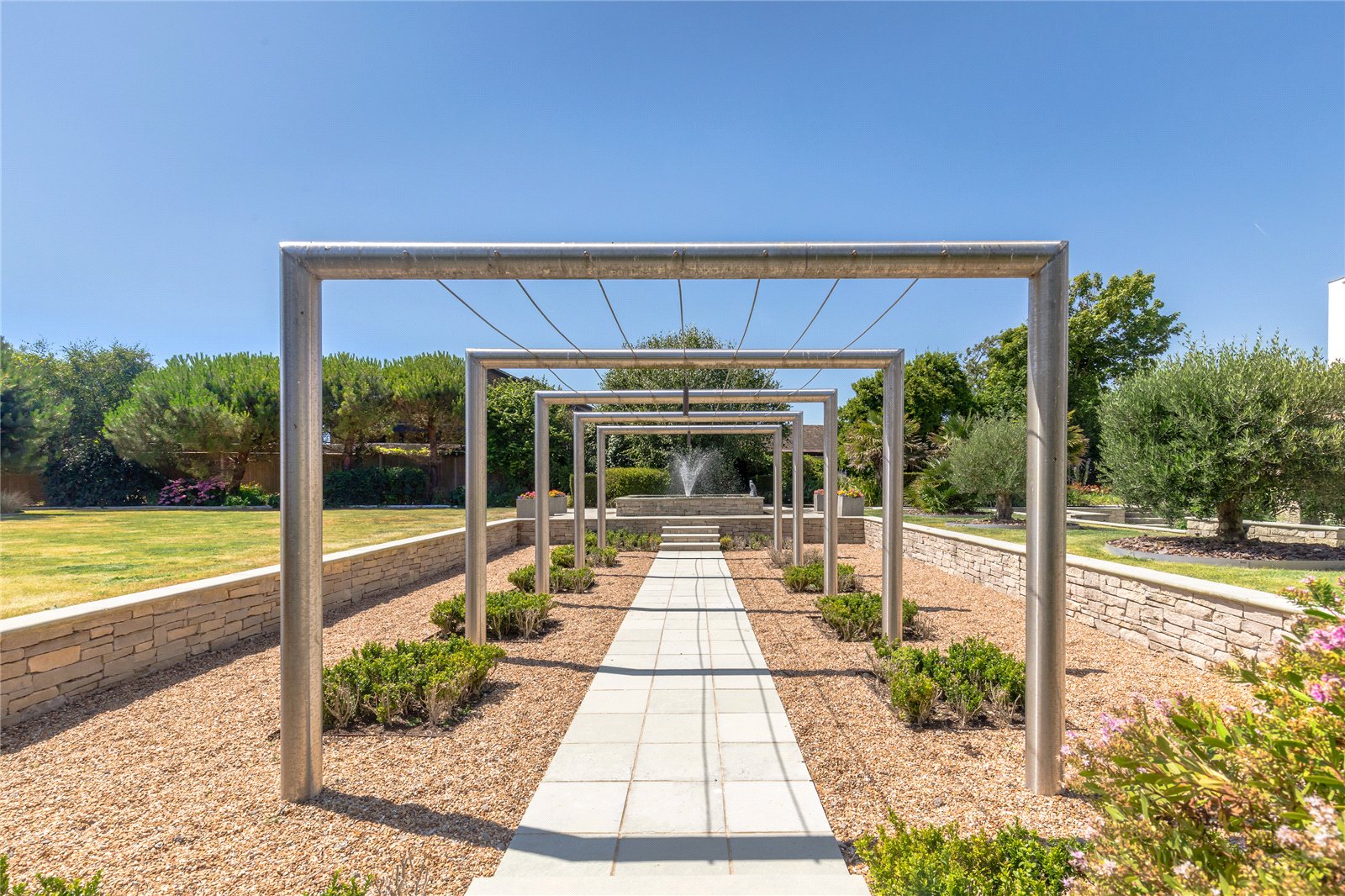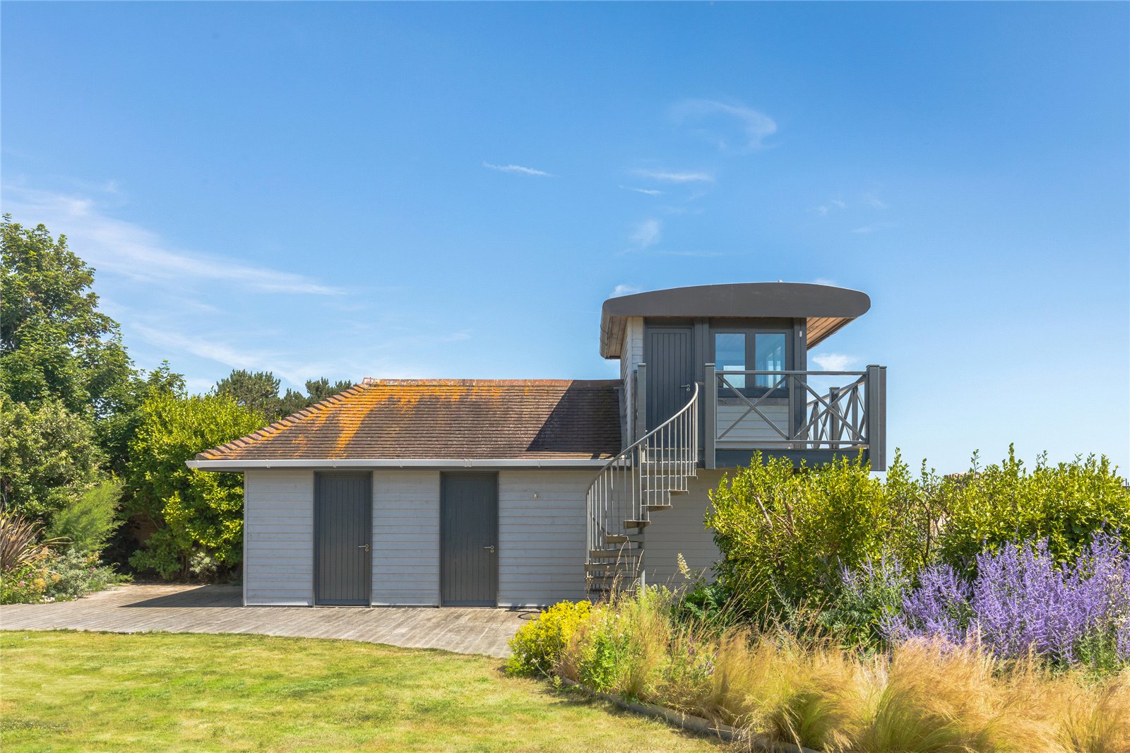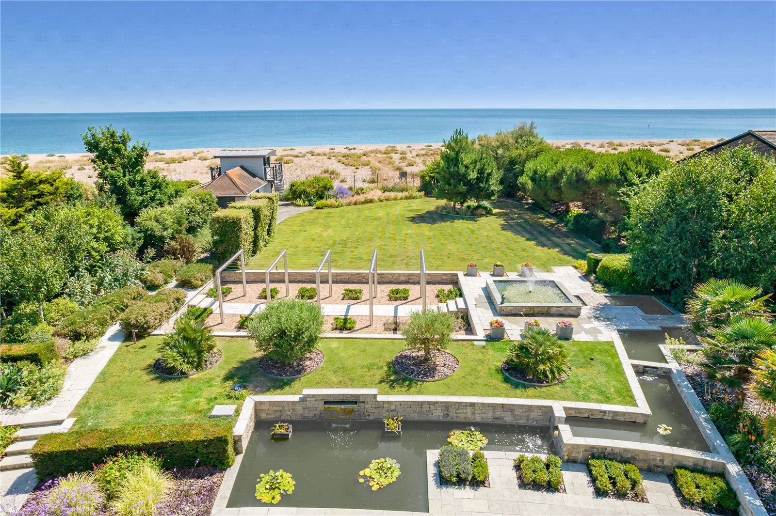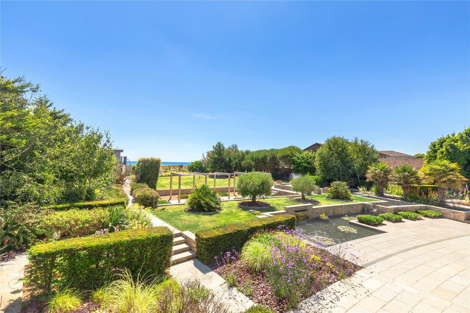 Set within 0.9 acres, the grounds have been professionally landscaped to provide an attractive yet low-maintenance outdoor environment. Meandering pathways lead from the terrace through manicured lawns, established borders, a tranquil water feature, mature trees, and secluded seating areas that offer exceptional privacy. A charming boathouse provides a perfect spot to relax and watch the sunset over the sea.