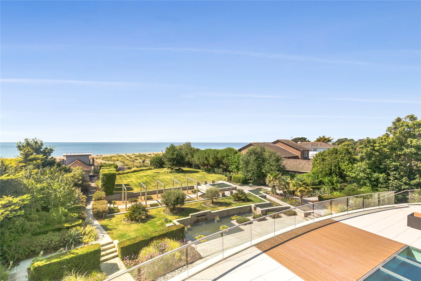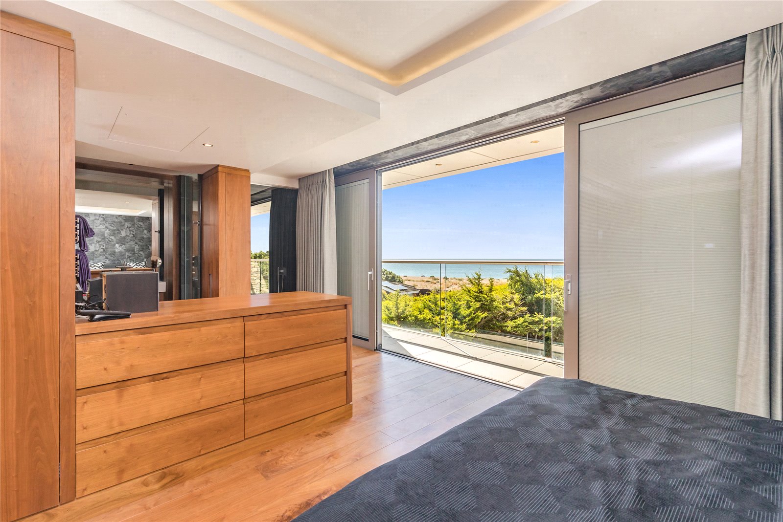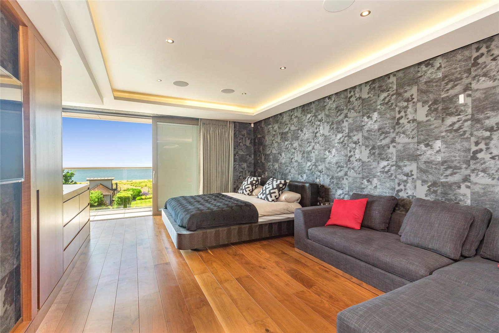 Upon entering the ground floor, you are welcomed by an impressive entrance hall featuring a vaulted ceiling, bespoke glass wall, and oak staircase leading to a mezzanine landing. From here, stunning views unfold over the expansive entertaining space, landscaped garden, and the sea beyond. The reception areas flow seamlessly, enhanced by a spectacular full-height glass wall with bi-folding doors opening onto the south-facing sun terrace—perfect for taking in panoramic vistas of the garden, beach, and open water.