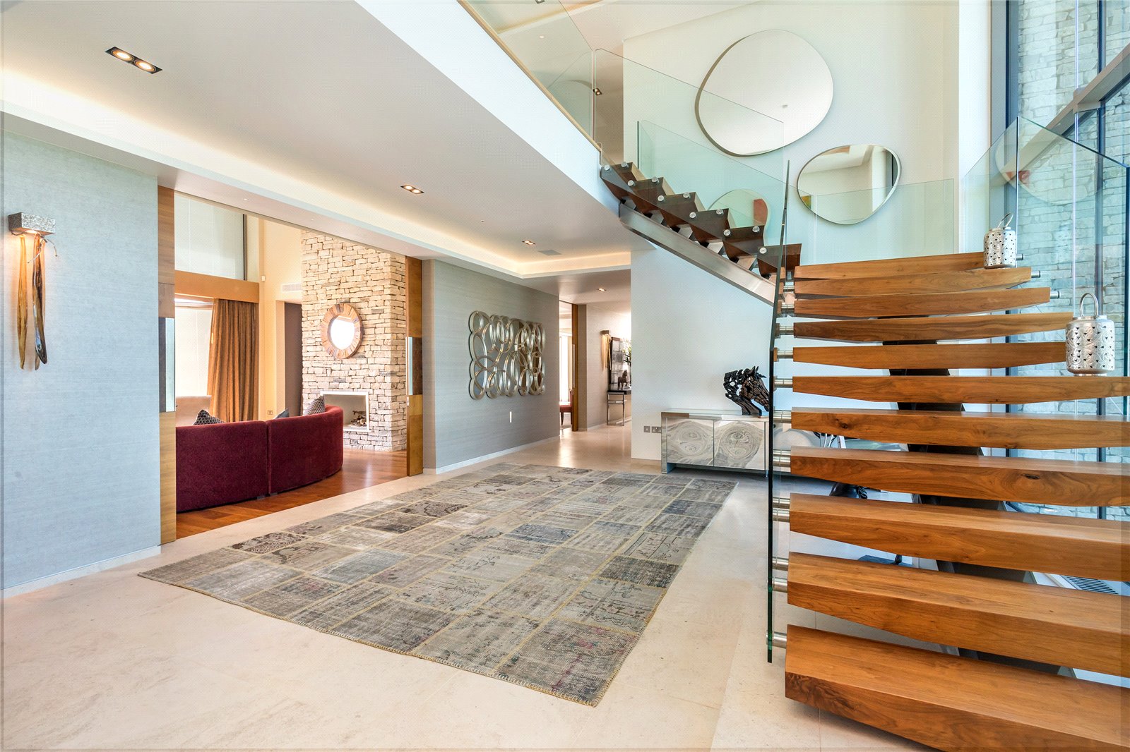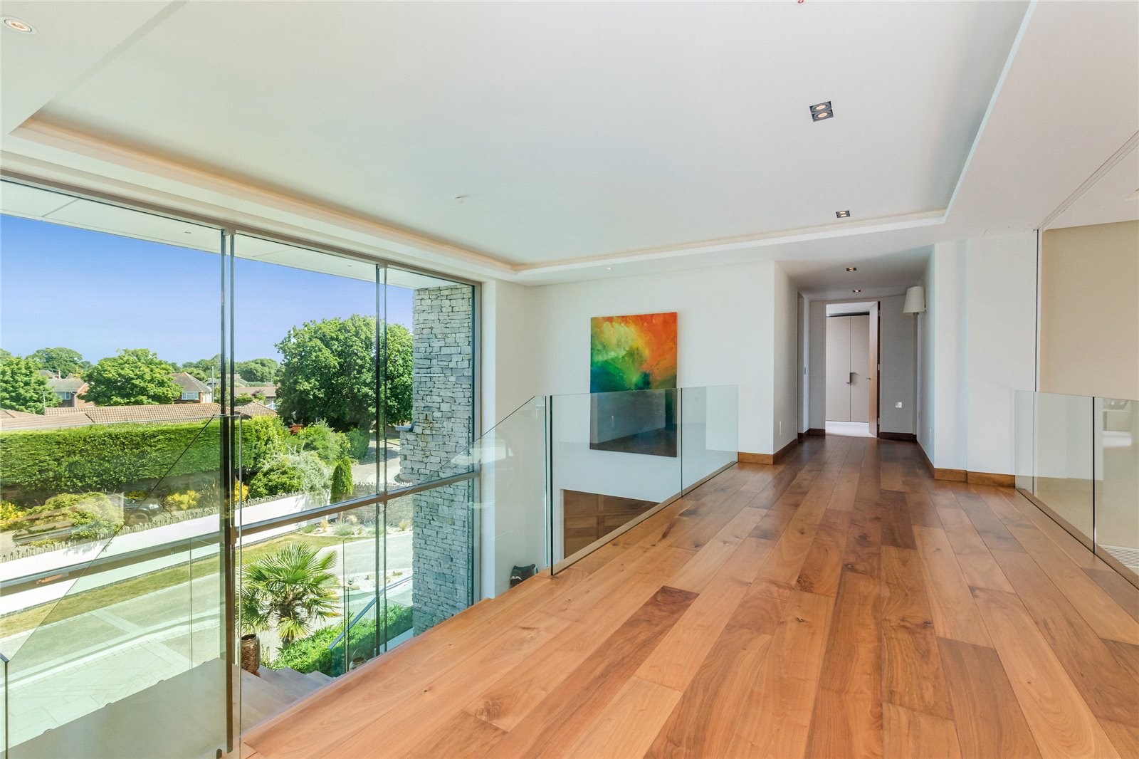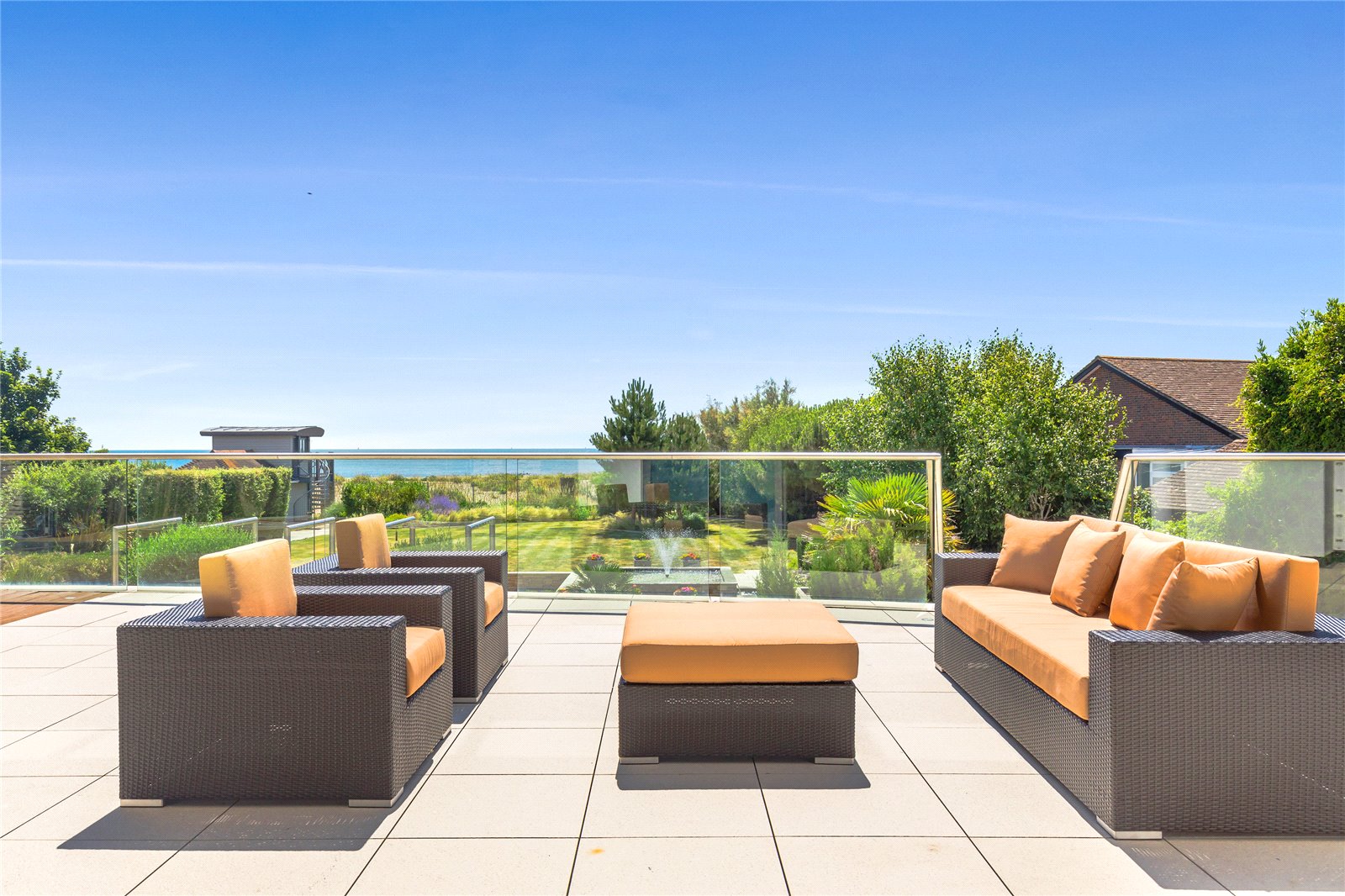 Upon entering the ground floor, you are welcomed by an impressive entrance hall featuring a vaulted ceiling, bespoke glass wall, and oak staircase leading to a mezzanine landing. From here, stunning views unfold over the expansive entertaining space, landscaped garden, and the sea beyond. The reception areas flow seamlessly, enhanced by a spectacular full-height glass wall with bi-folding doors opening onto the south-facing sun terrace—perfect for taking in panoramic vistas of the garden, beach, and open water.