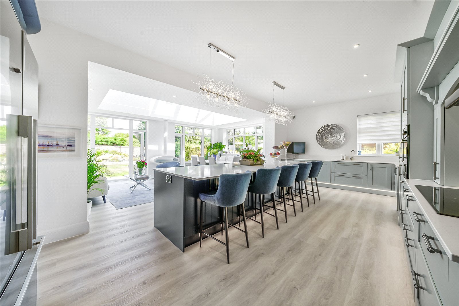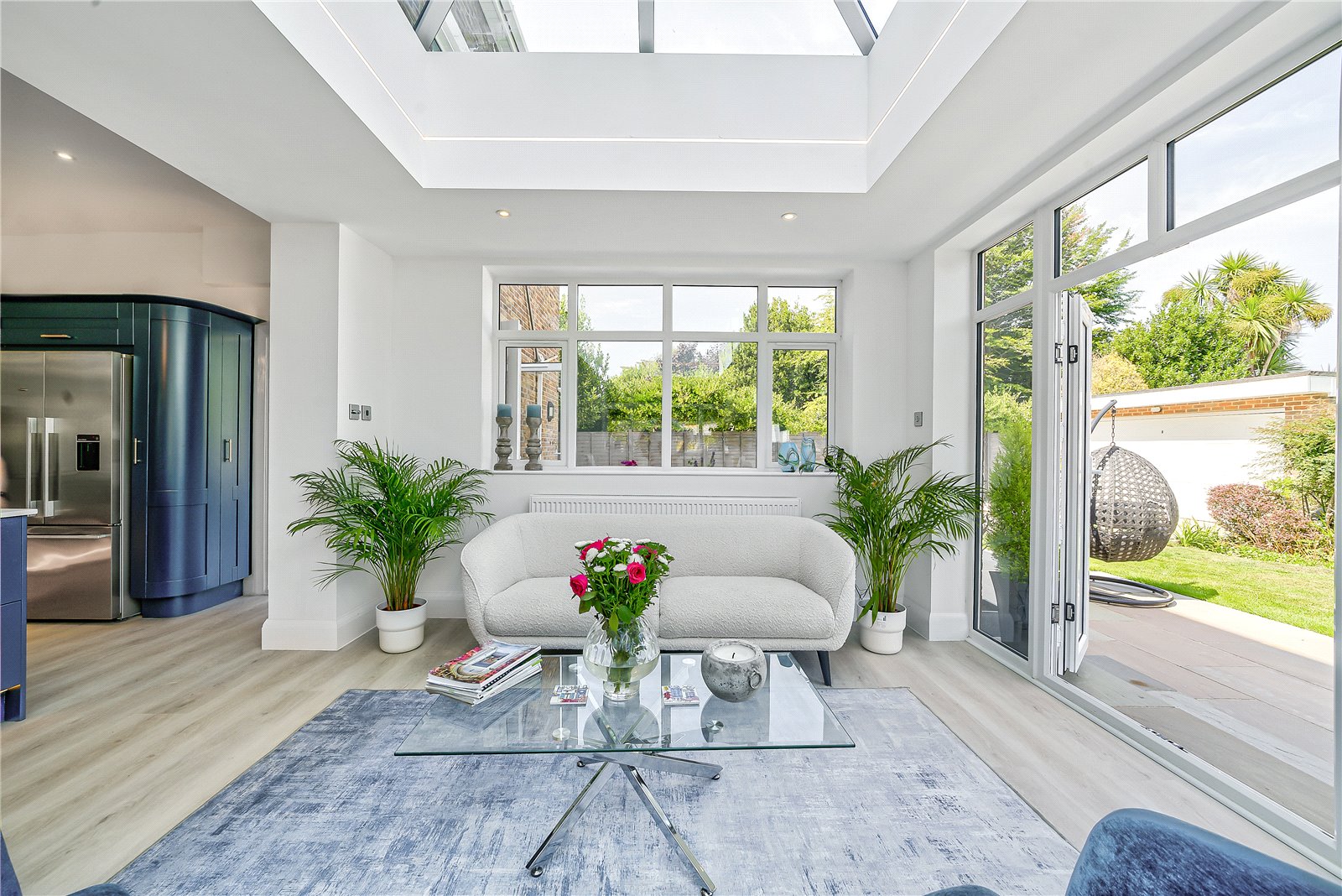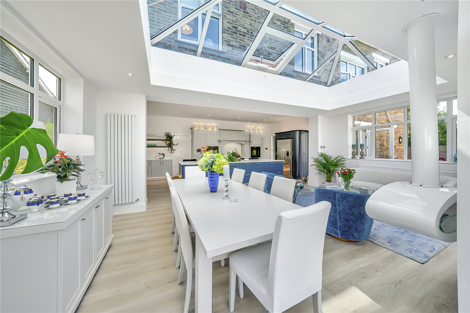 A welcoming entrance hall, with original wooden flooring and beautifully detailed panelling, sets the tone for what lies ahead. To the rear, the newly constructed extension opens into a striking open-plan kitchen, dining and living area, bathed in natural light from full-height glazing, patio doors, and an oversized sky lantern. This impressive space frames views of the landscaped garden and blurs the boundary between inside and out.